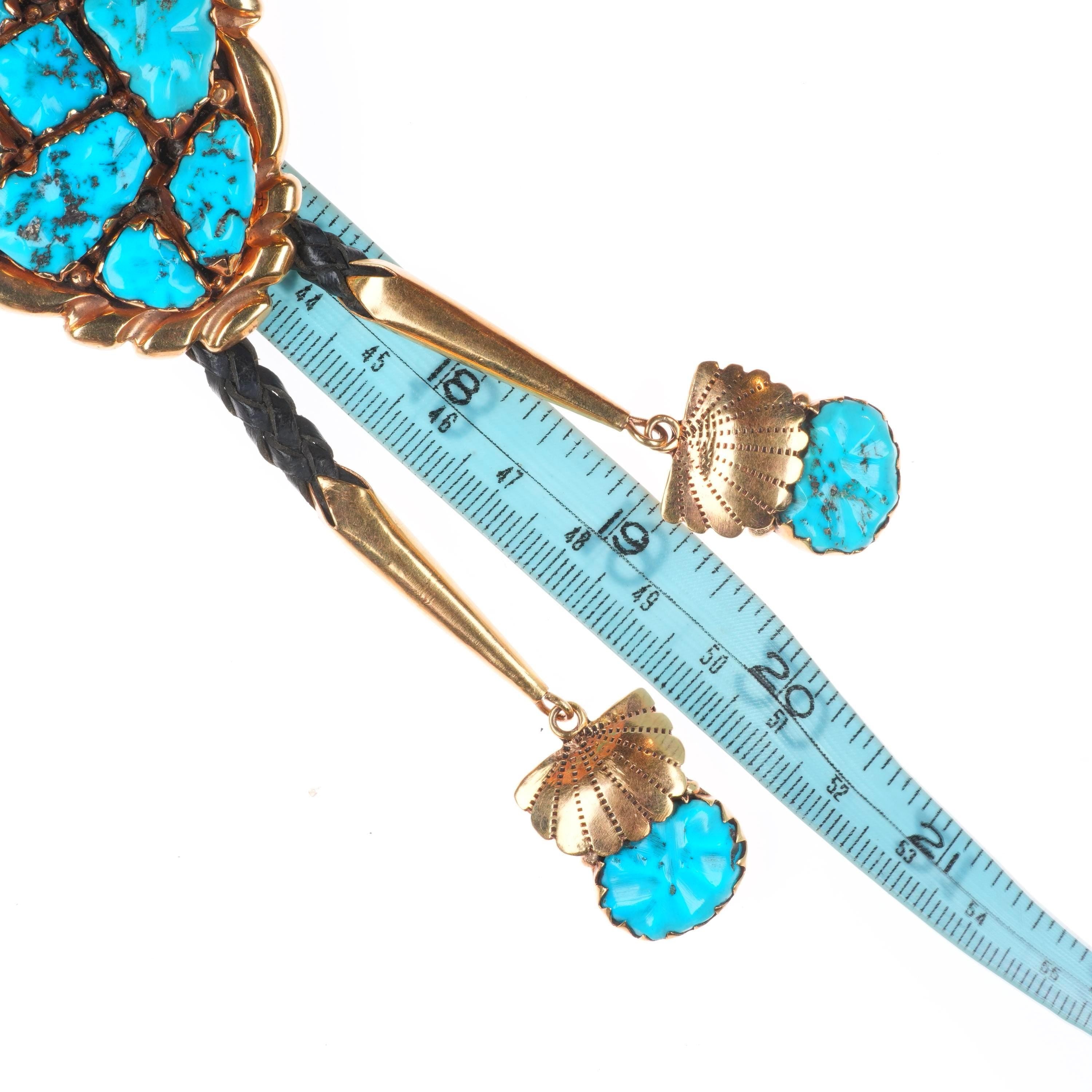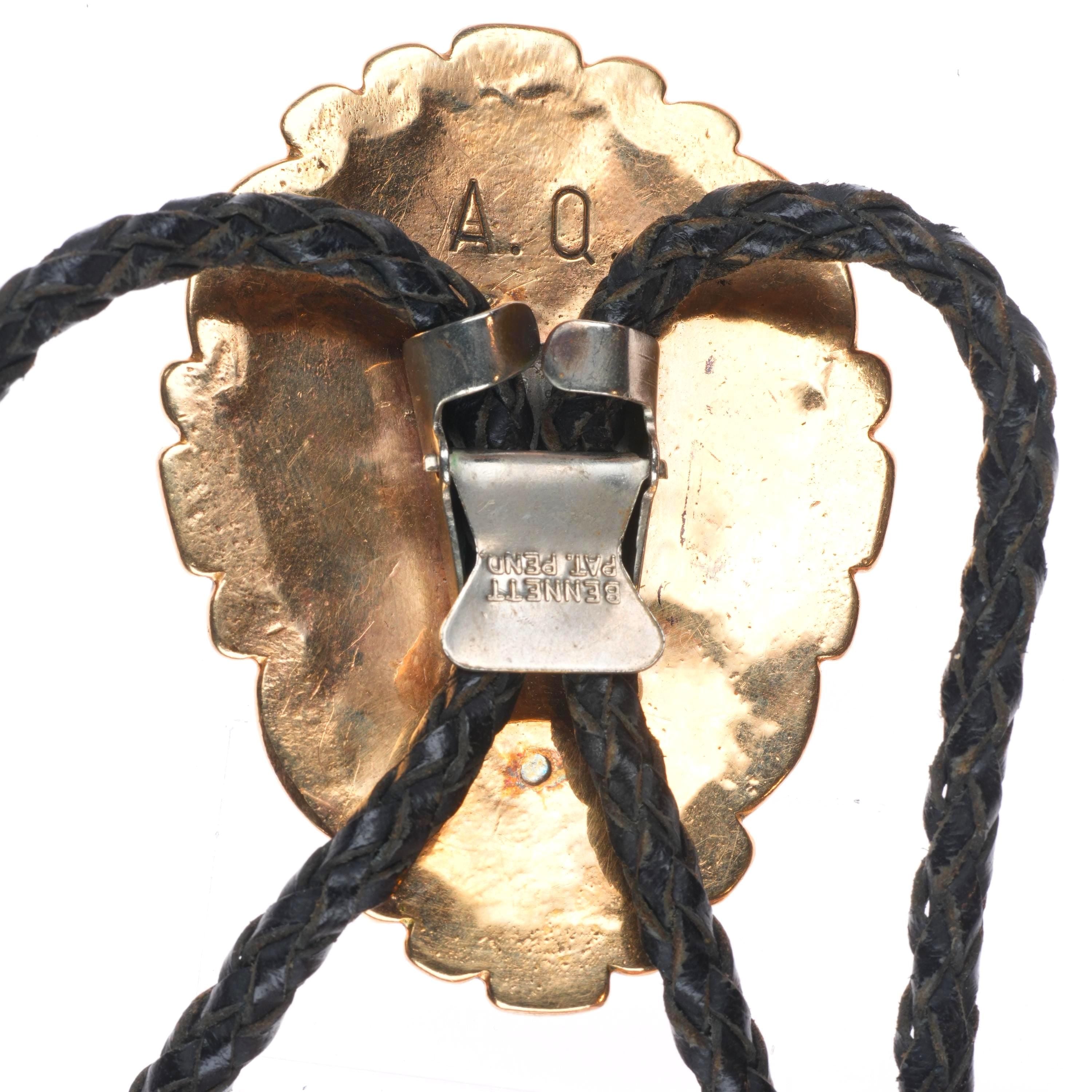 1970‘s Alice Quam Zuni 14k gold bolo tie carved pyrite turquoise cluster. Tested and guaranteed solid 14k gold. Steel clip on the back. 40" long with weight and measurements in pictures, circa third quarter of the 20th century. This is a style that was later adopted by Alice Quam‘s daughter Alvina Quam, though not in gold that I know of. I have seen a few Alice Quam pieces in gold, but not that many even though when she was active gold was 1/7 to 1/130 of the current price. Yes you read that correctly, during much of the time she was active gold was .7% of it‘s current price. The average was probably 1/20 current price. Still gold items by her are extremely rare and were likely custom items as it was always more expensive than silver and not as popular with top Native American artists as it is today. Alice Quam was definitely a top Zuni artist