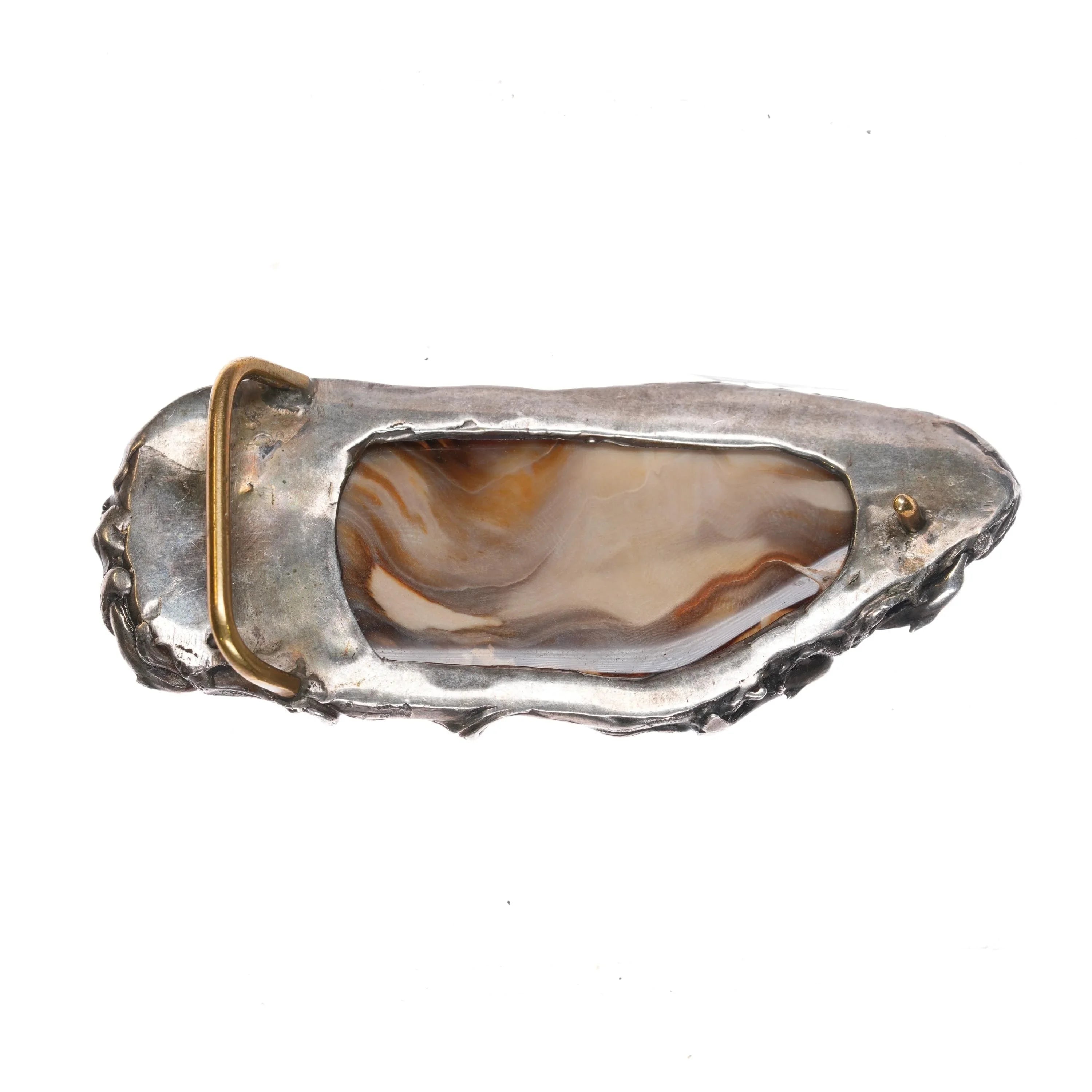 1970's Brutalist sterling silver dolphins belt buckle with large jasper stone