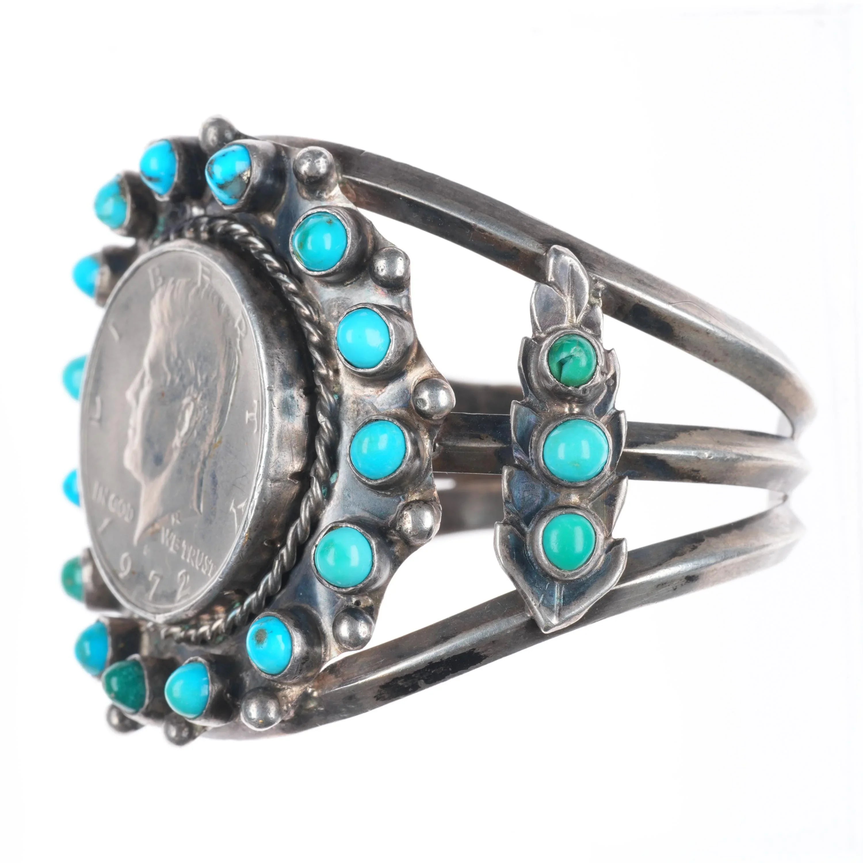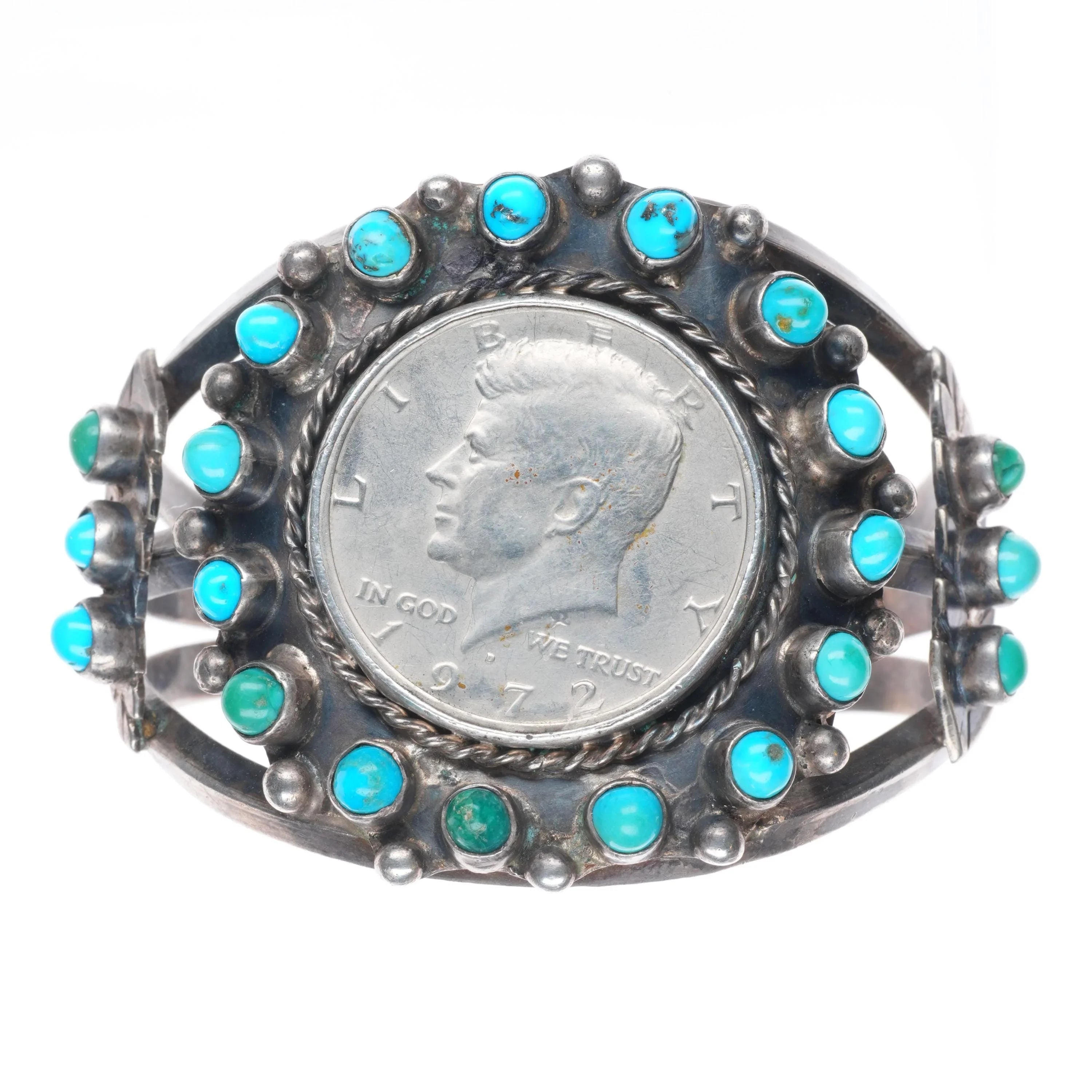 1972 Zuni Snake eye turquoise sterling silver cuff bracelet w/US dollar coin. Tested and guaranteed solid sterling silver with weight and measurements in pictures. The coin is not sterling, all the rest of the bracelet is sterling with no apparent markings.