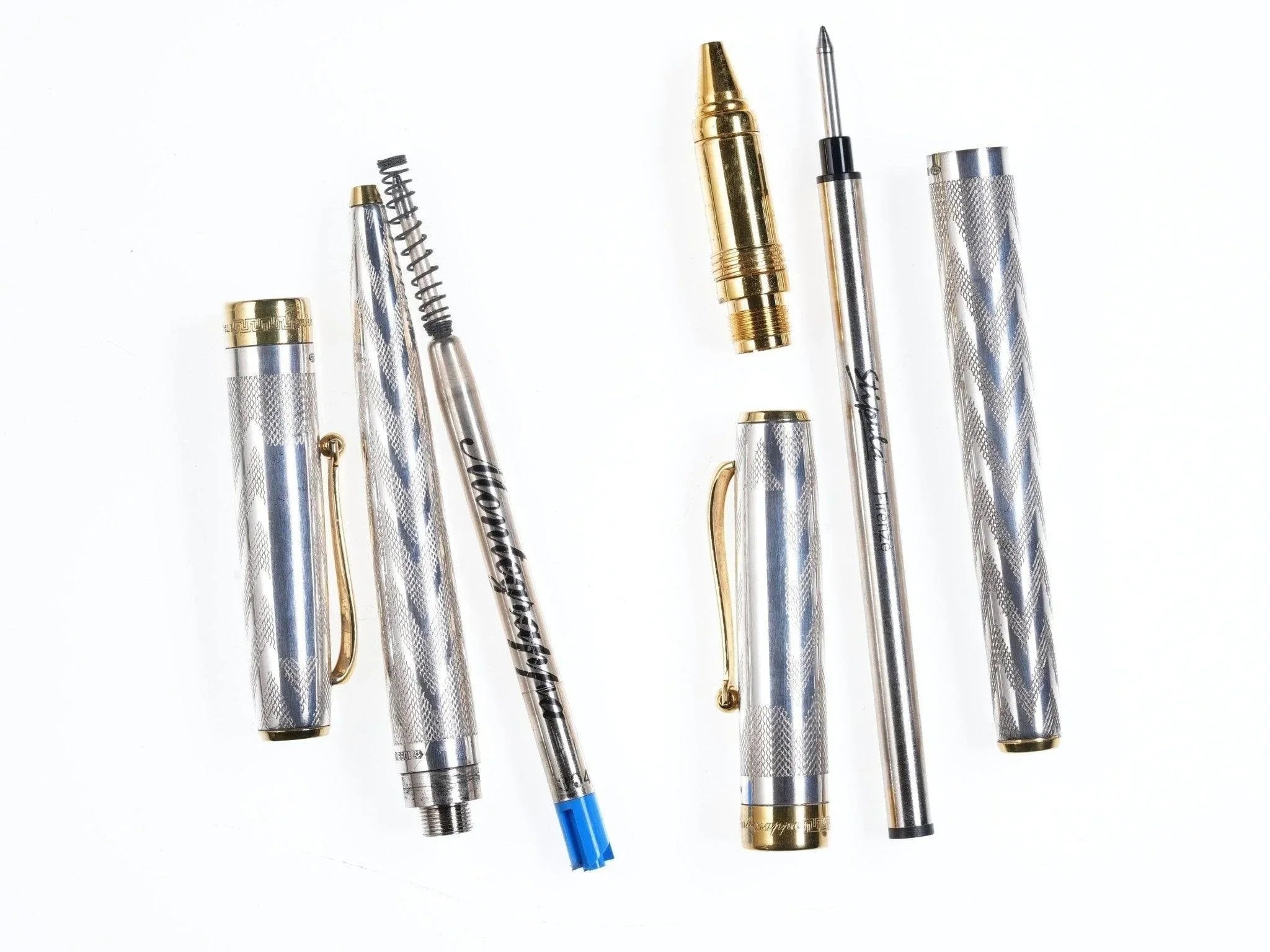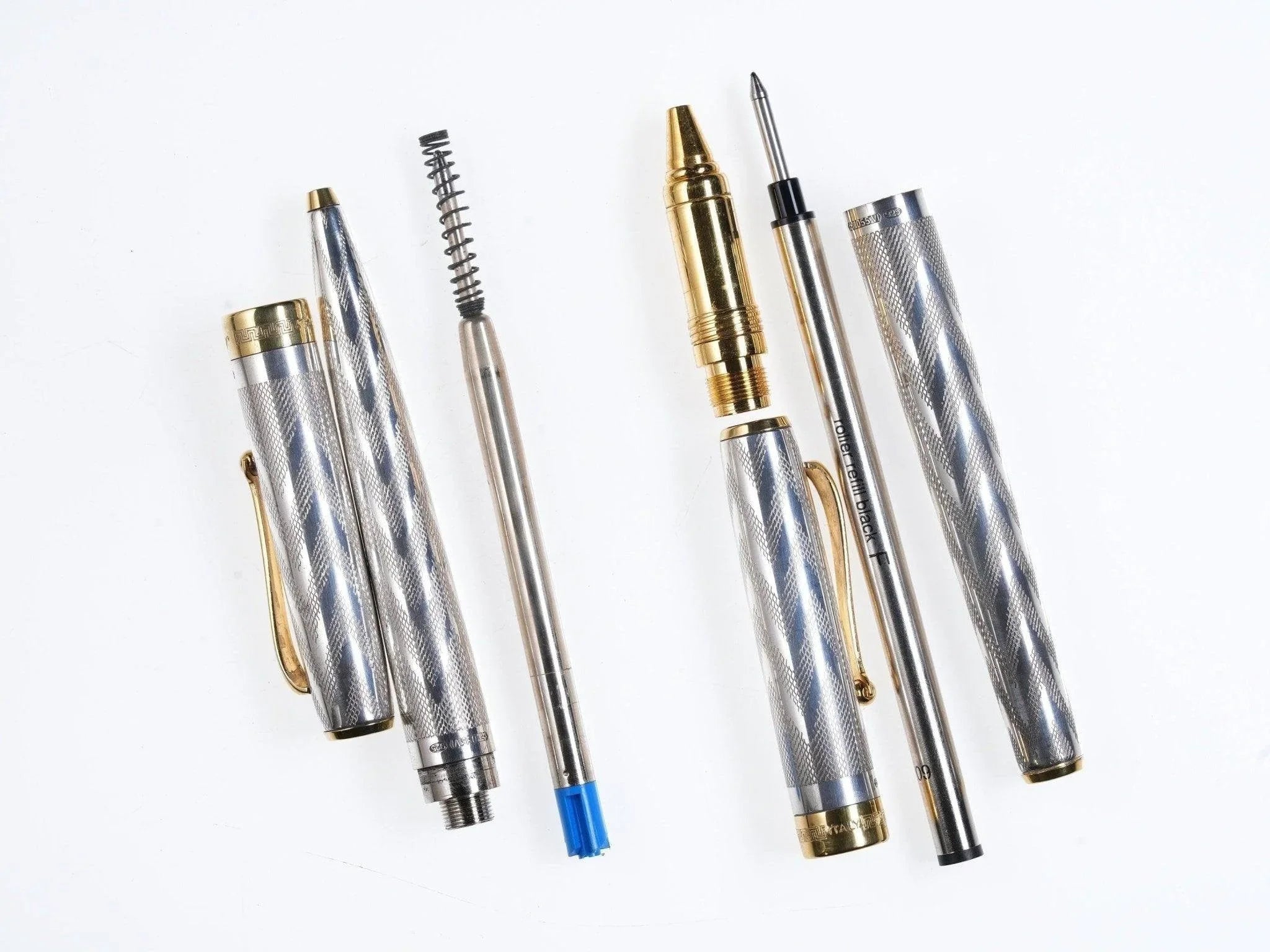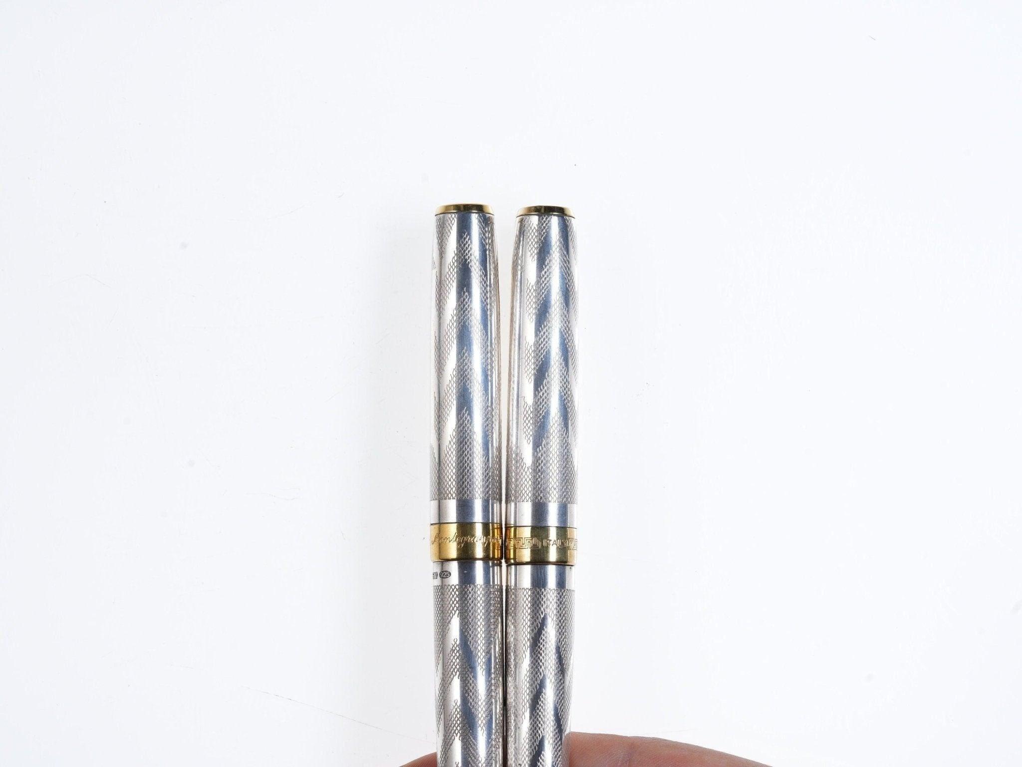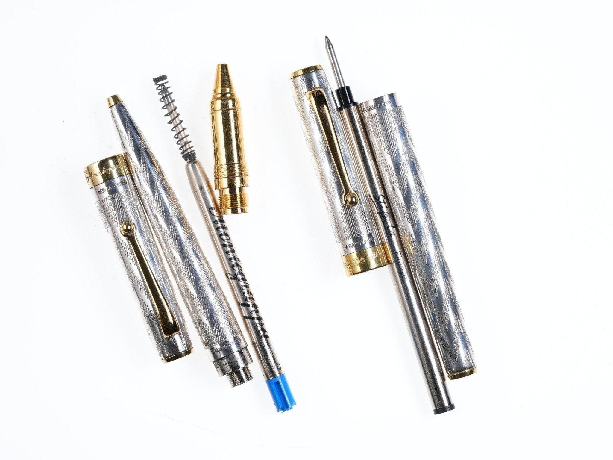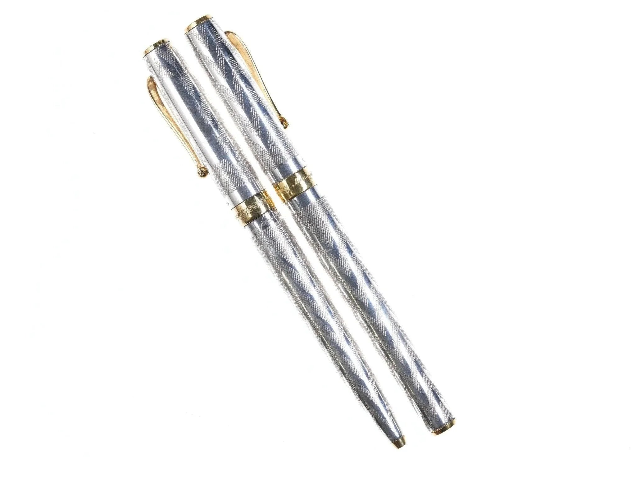 1980's Sterling Italian Montegrappa 402 pen set. Selling both pens in very clean<br>condition, both functional, one with good cartridge, one needed cartridge as<br>it's dry. No dents or major wear to either pen.<br><br>The 300 and 400 series were discontinued in the early 1990’s and are now<br>difficult to find in good condition. This was the flagship version of the 402,<br>with both pens being crafted from sterling silver and featuring a CANOVA<br>guilloche design on the barrel and cap – the trim is vermeil, so gold-plating<br>over silver. The pens have the 1055 VI hallmark, which indicates that it was<br>produced by the older Aquila owned company, prior to them selling to Richemont.<br>The newer Aquila pens have a 2670 VI hallmark.<br><br>The 402 was based on a model from the 1930’s and they’re incredibly comfortable<br>writing instruments to use, even for longer writing sessions.