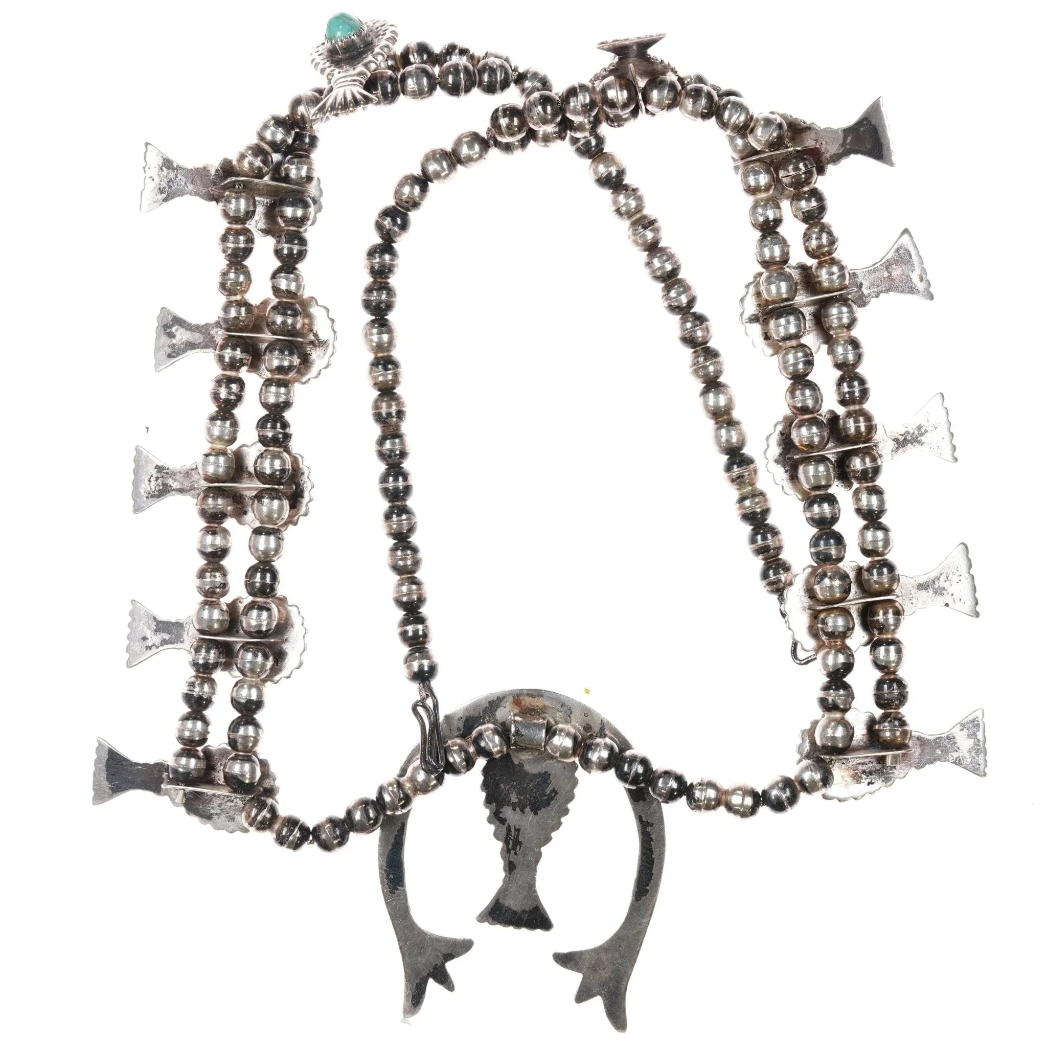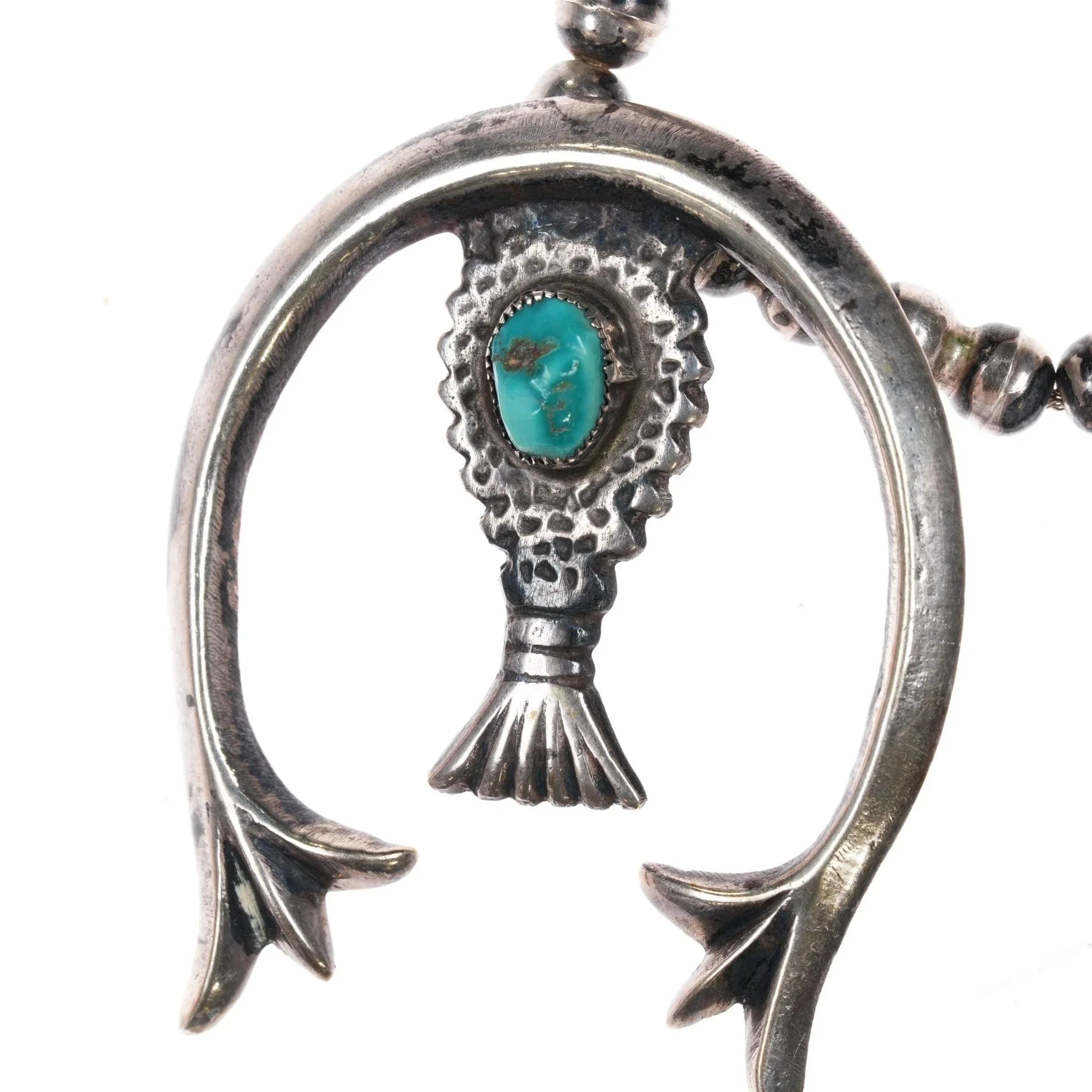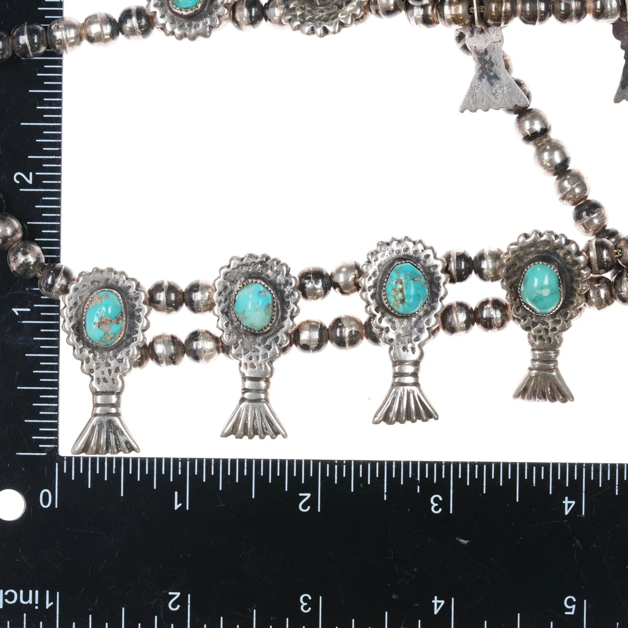 27" c1960‘s Native American cast silver and turquoise squash blossom necklace. No issues, weight and measurements in pics, solid sterling. Unmarked as typical of this era.