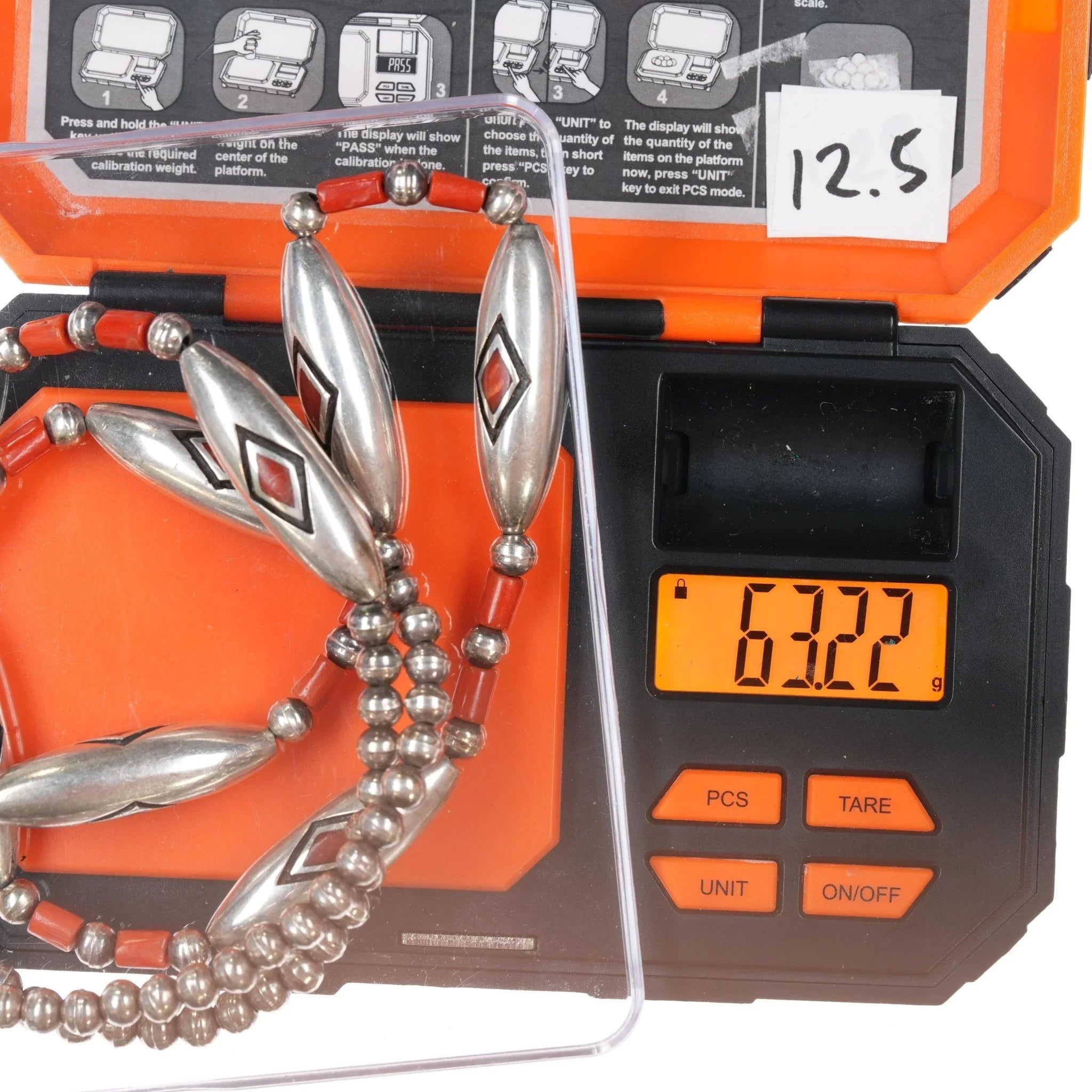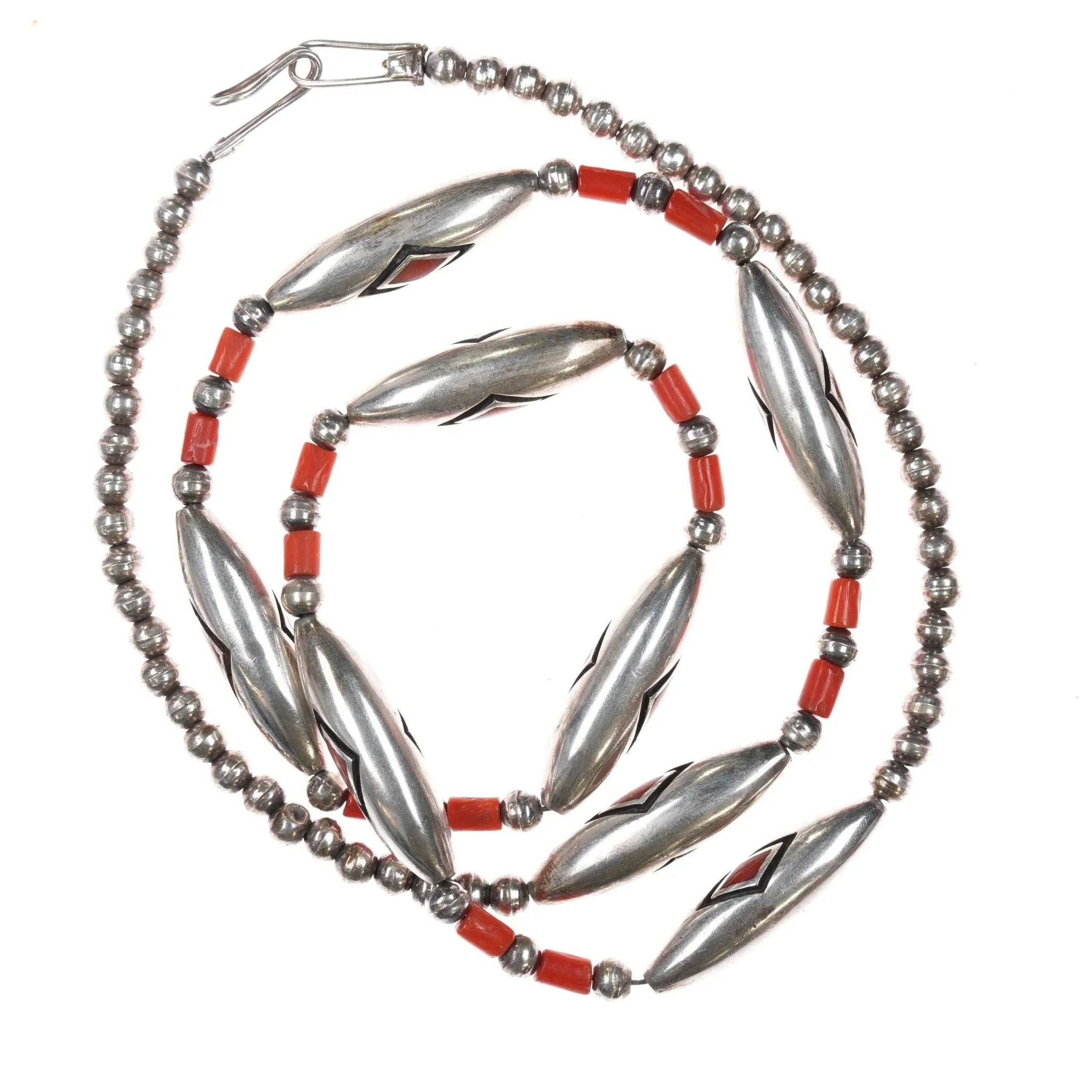 28" Amazing Native American flush inlay coral sterling beaded necklace. No issues, weight and measurements in pics, solid sterling. No apparent markings.