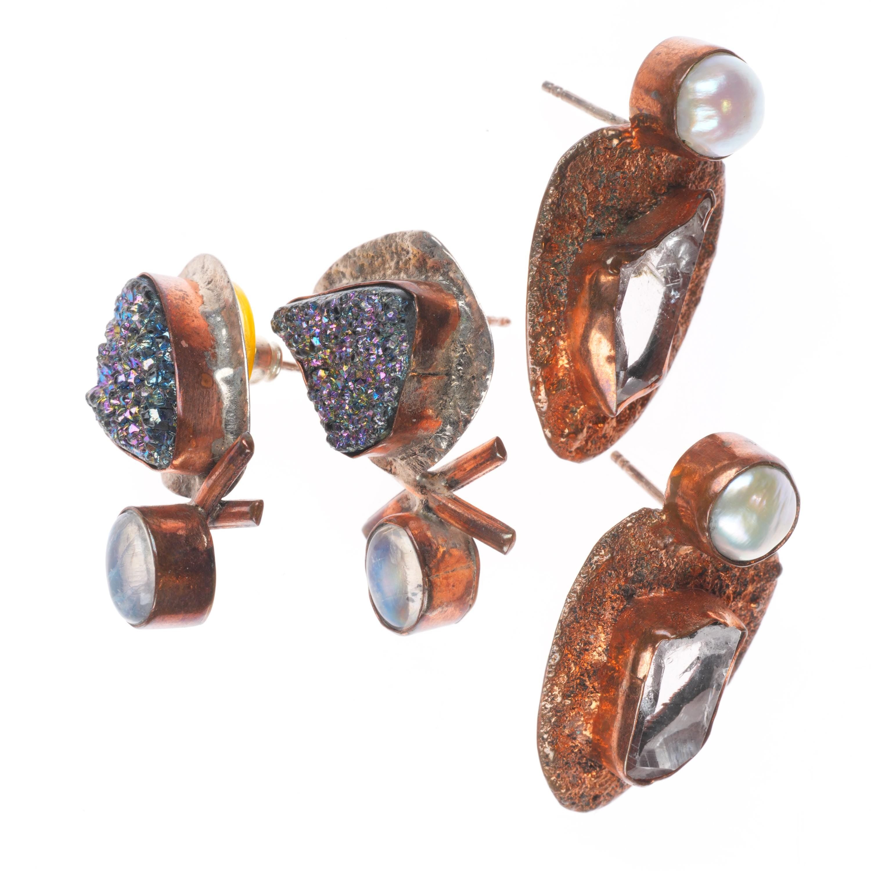 2pr retro Sterling silver, copper, pearl, crystal, labradorite earrings