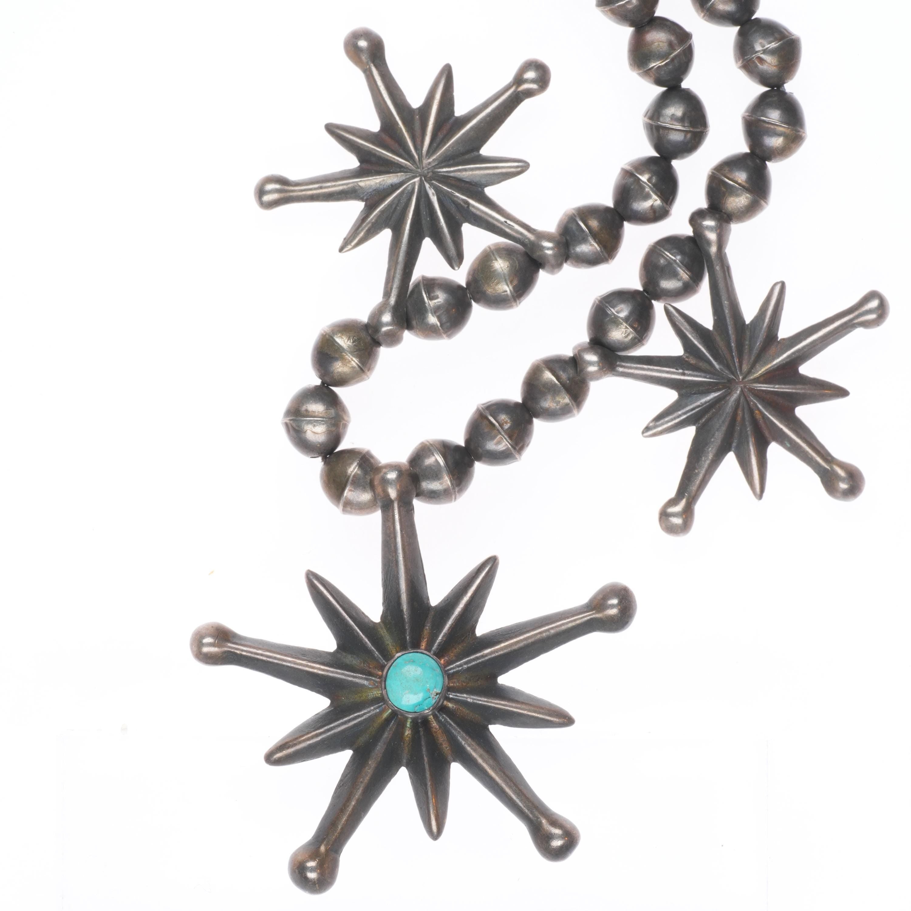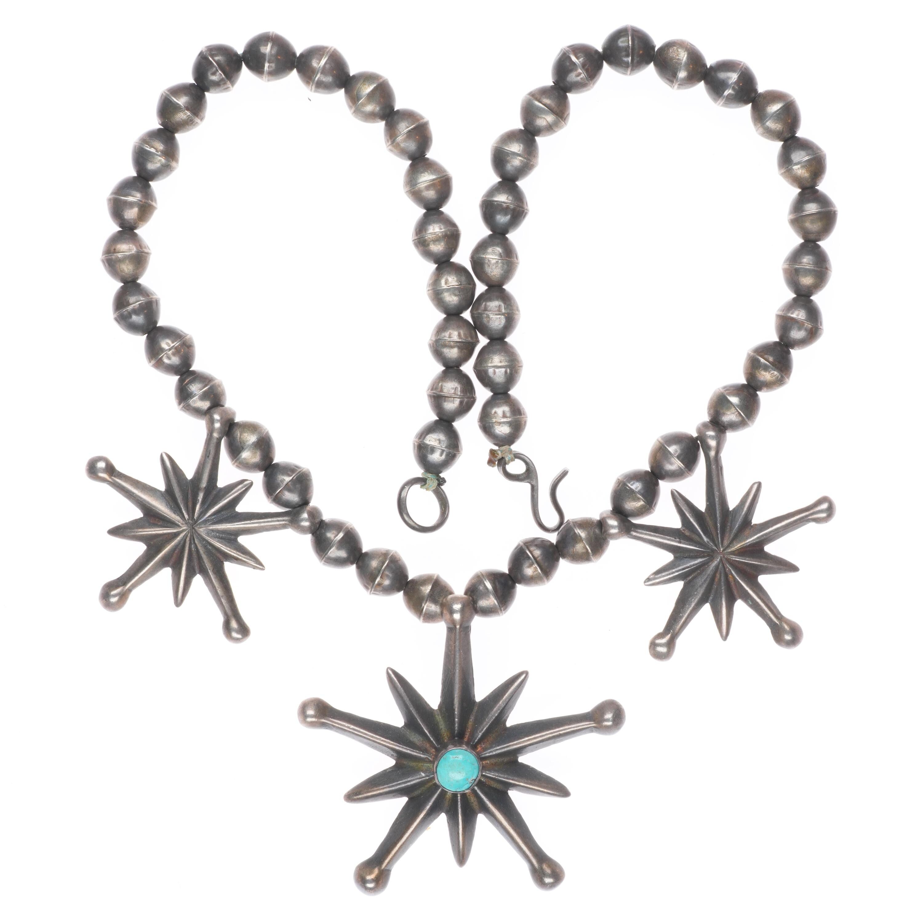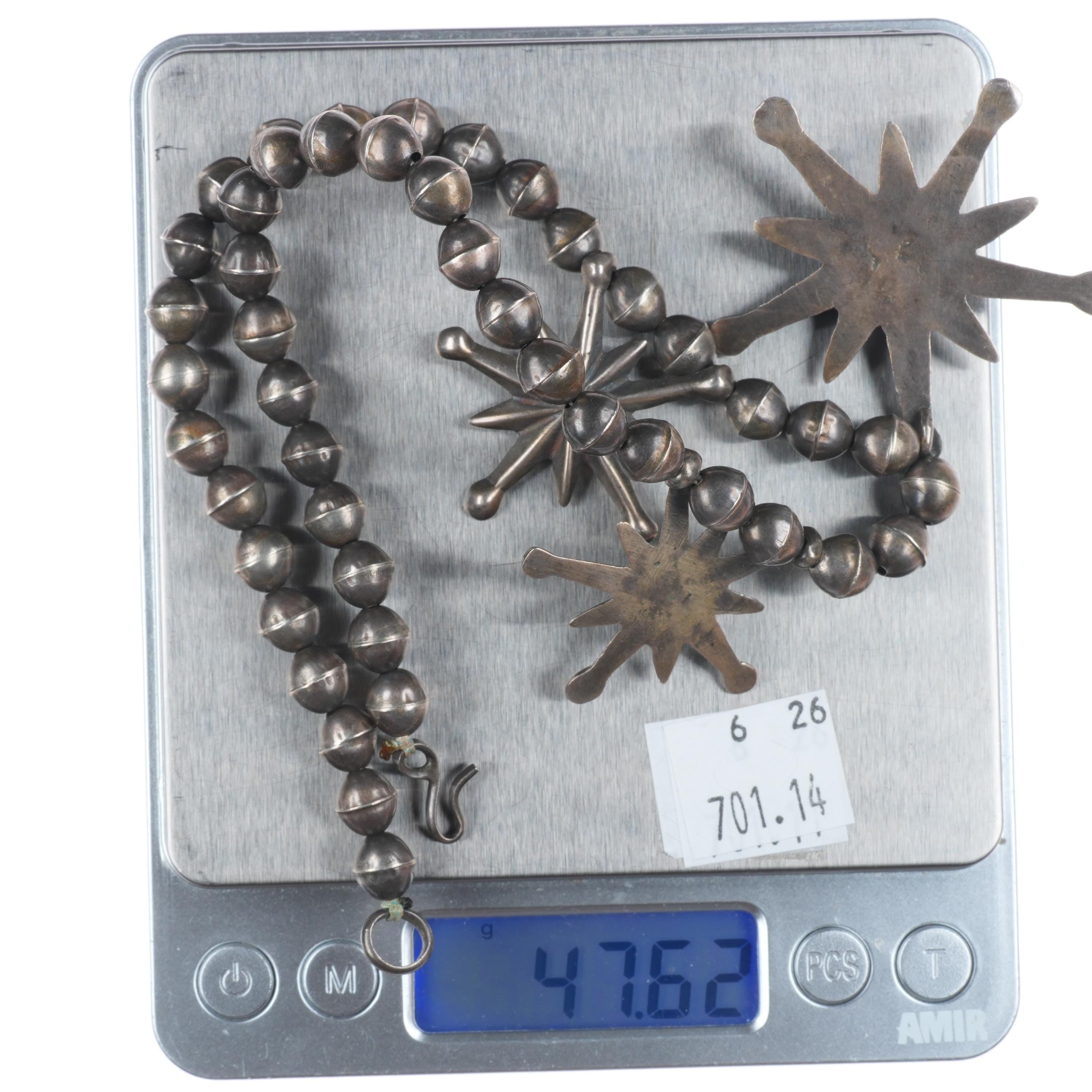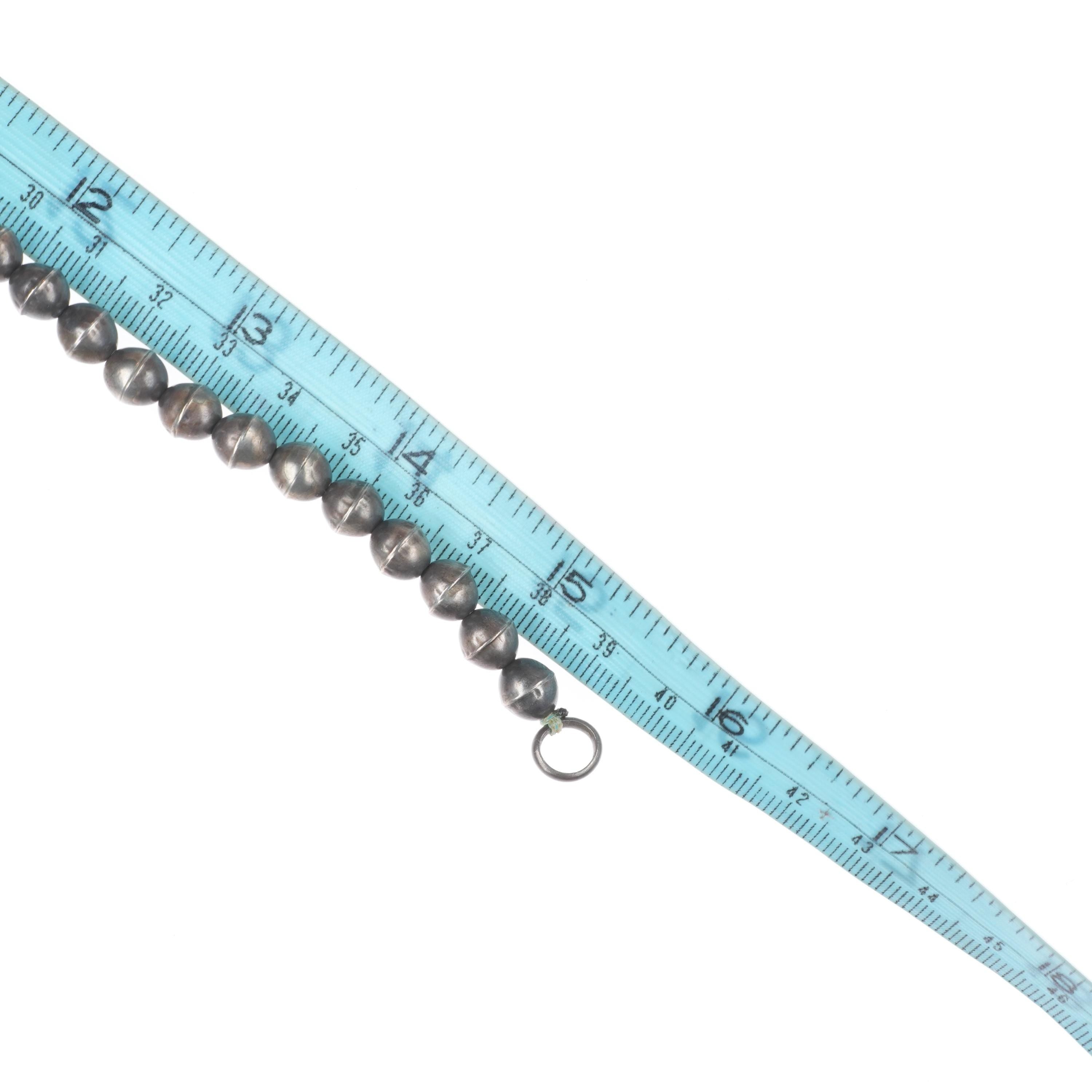30's-40's Vintage Zuni or Navajo cast sterling silver beaded necklace turquoise. Selling the necklace shown in good condition with measurements in pictures. Tested and guaranteed solid sterling silver. Weight and measurements in pictures. Circa second quarter of the 20th century. 15.75" long