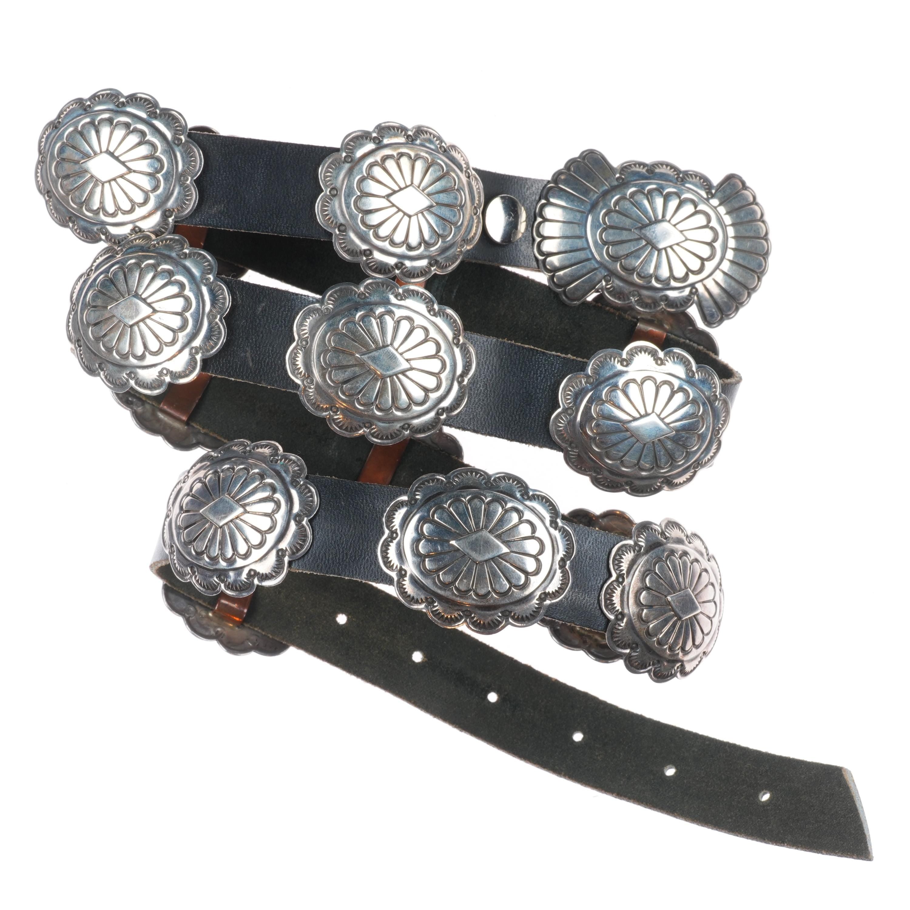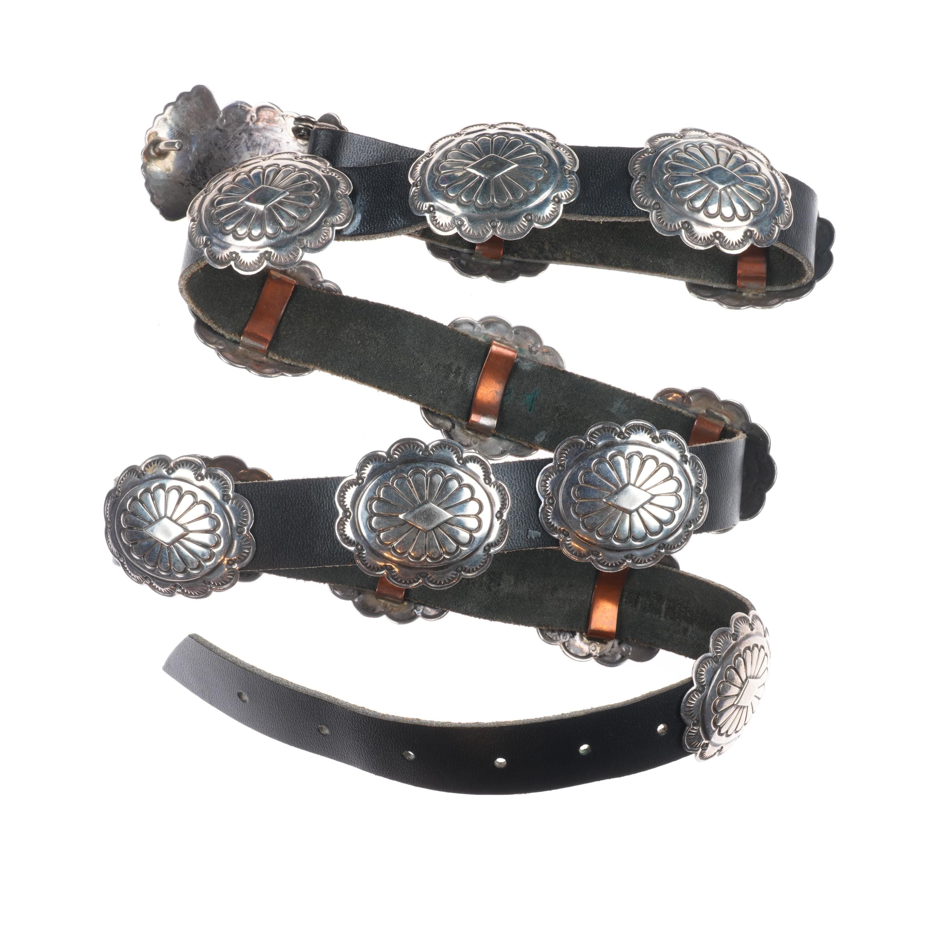 36" Vintage TL Navajo sterling silver slim/sturdy stamped concho belt Fits up to a 36" waist but obviously could be worn shorter. Tape measure shown in pics.. Weight and measurements in pictures. No damage or issues, tested and guaranteed solid sterling silver. 15 Conchos and one buckle, circa last quarter of the 20th century, hallmarked as shown.