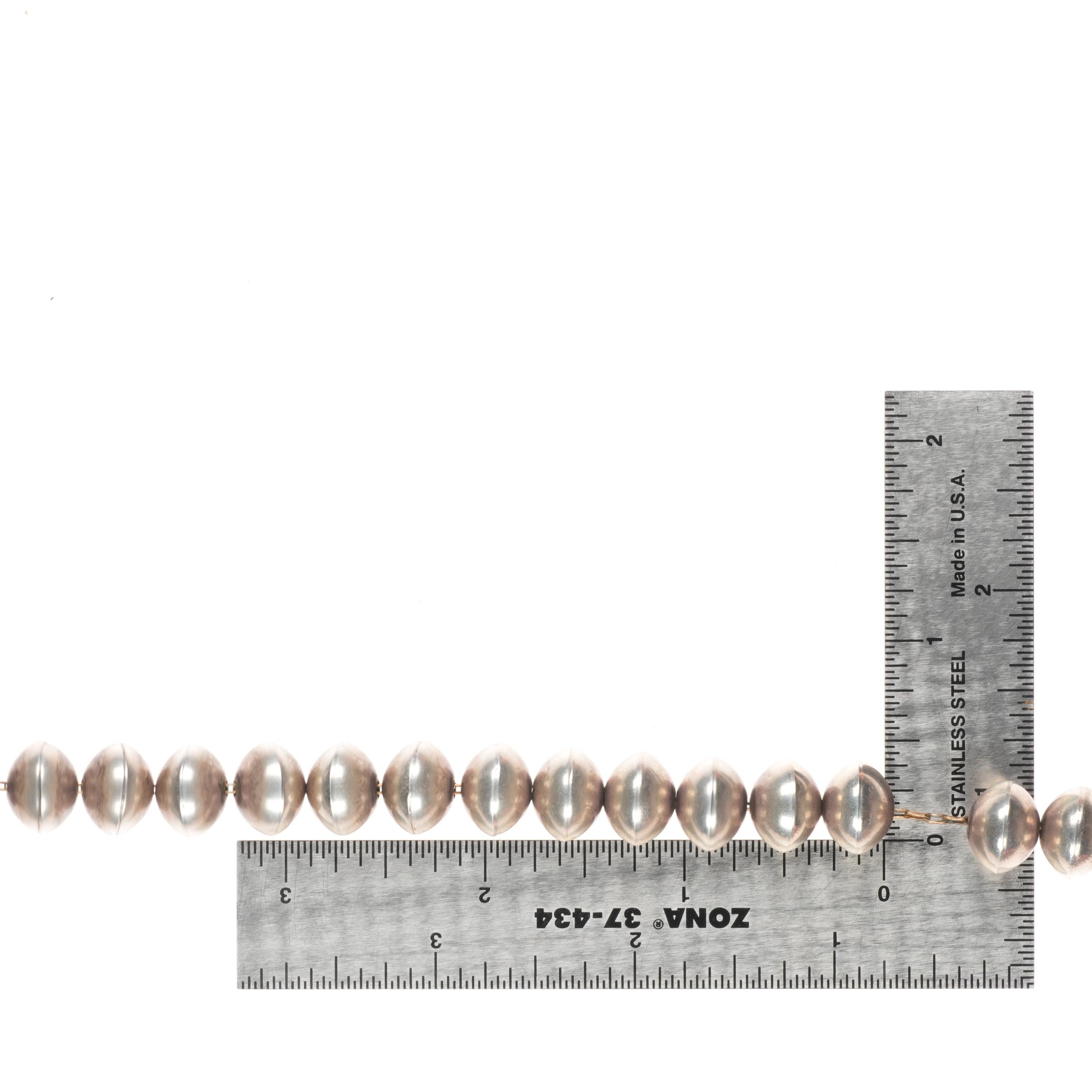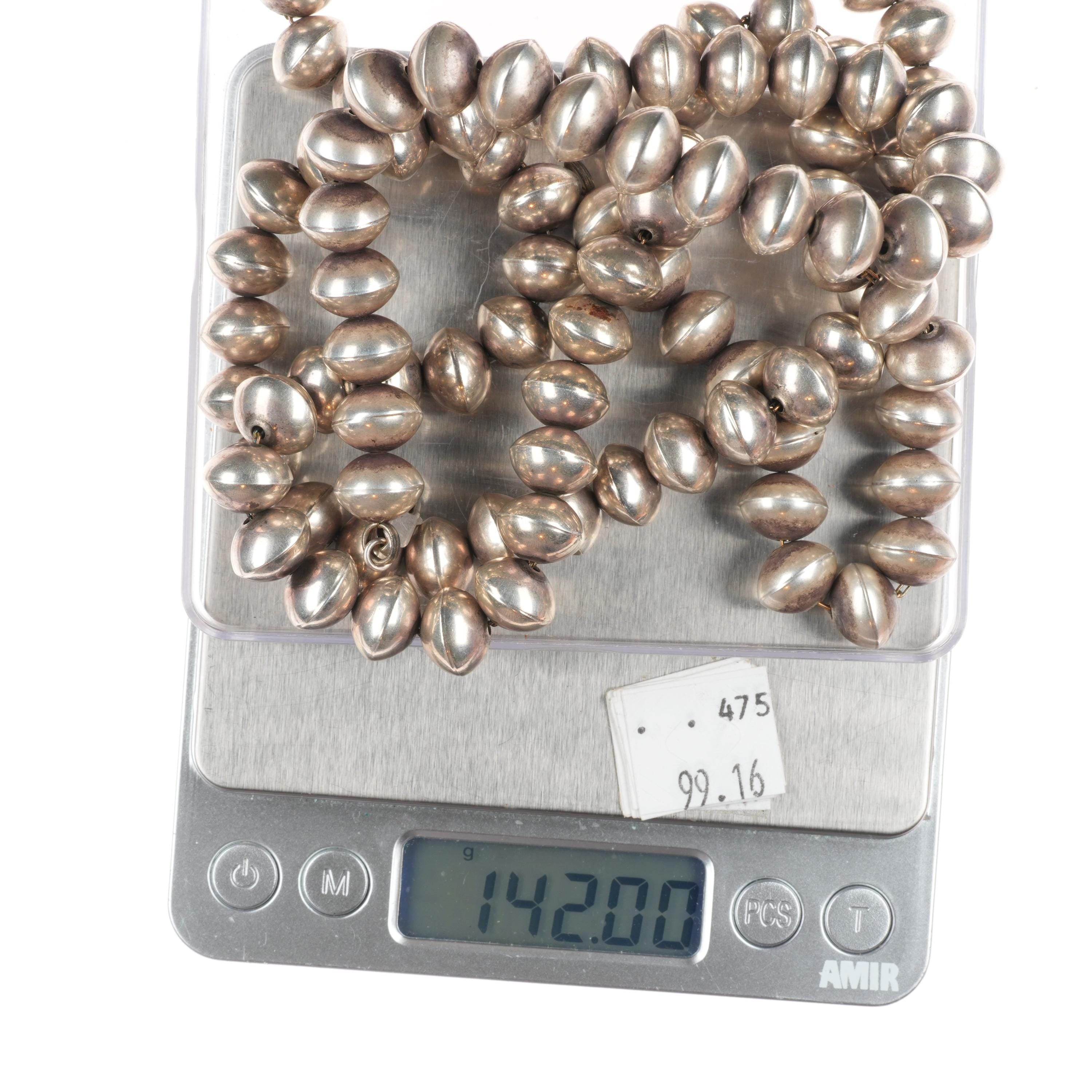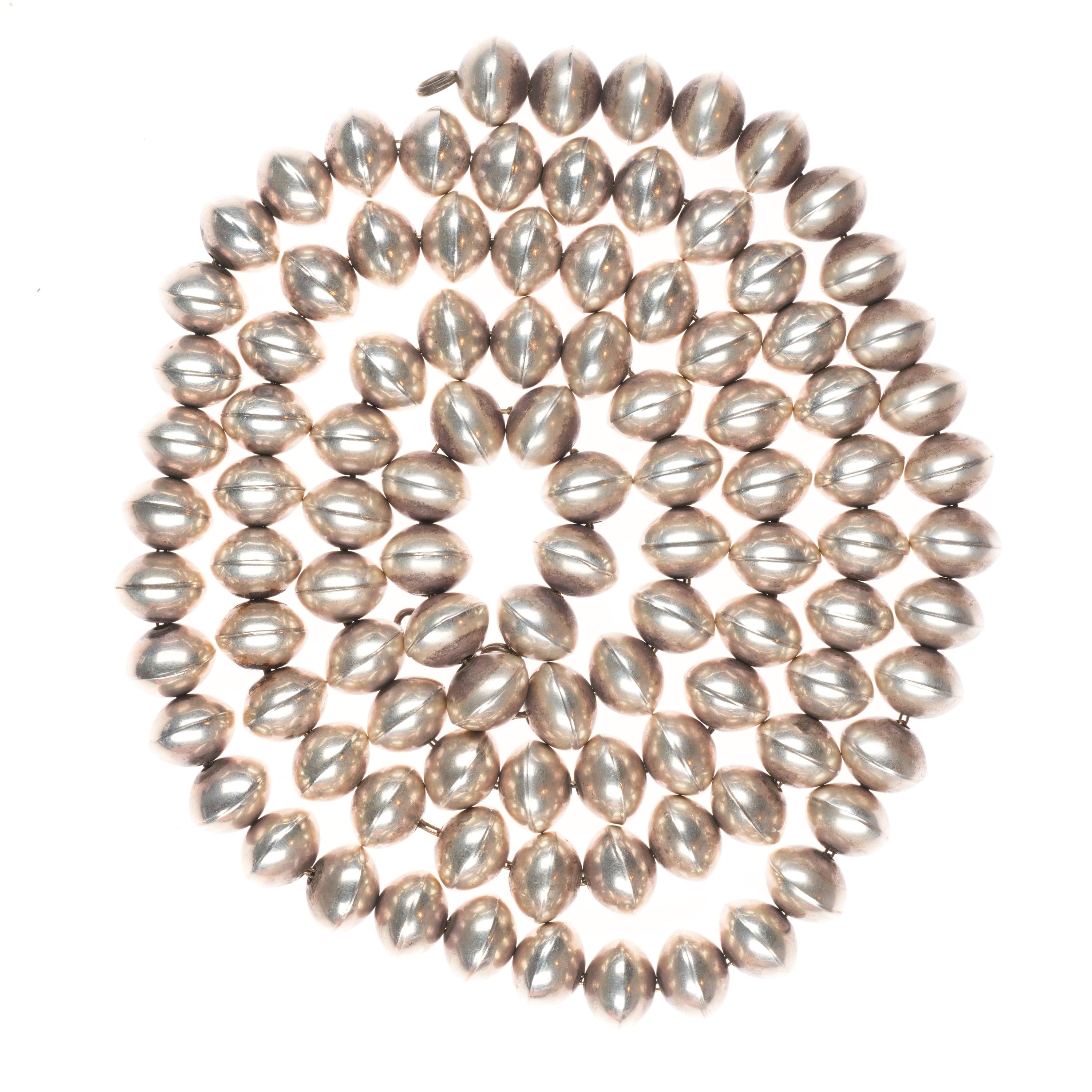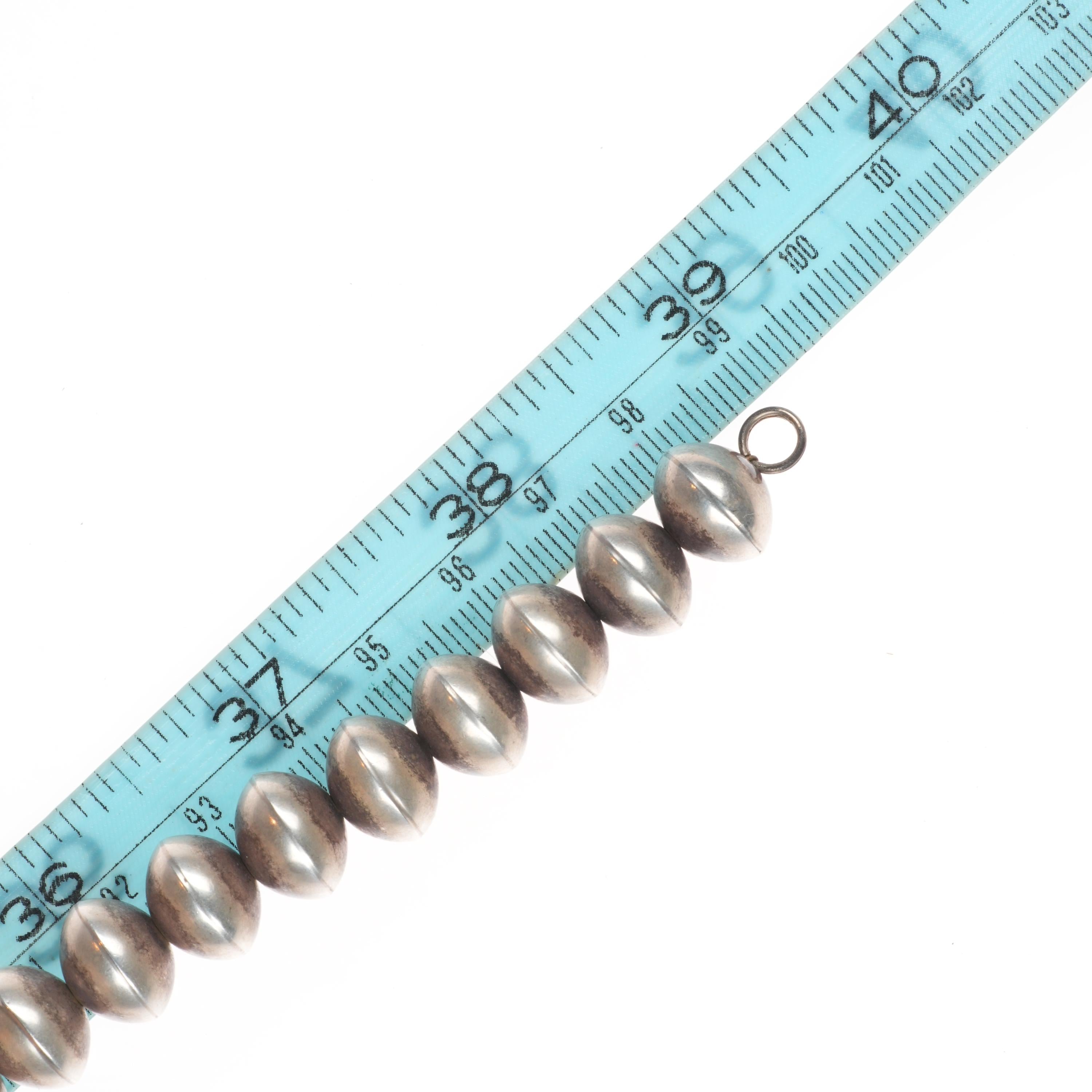 39" Vintage Navajo pearls sterling silver beaded necklace. Circa third quarter of the 20th century, tested and guaranteed solid sterling silver. Very well made, handmade beads, replacement clasp that I did not notice until after it was photographed.