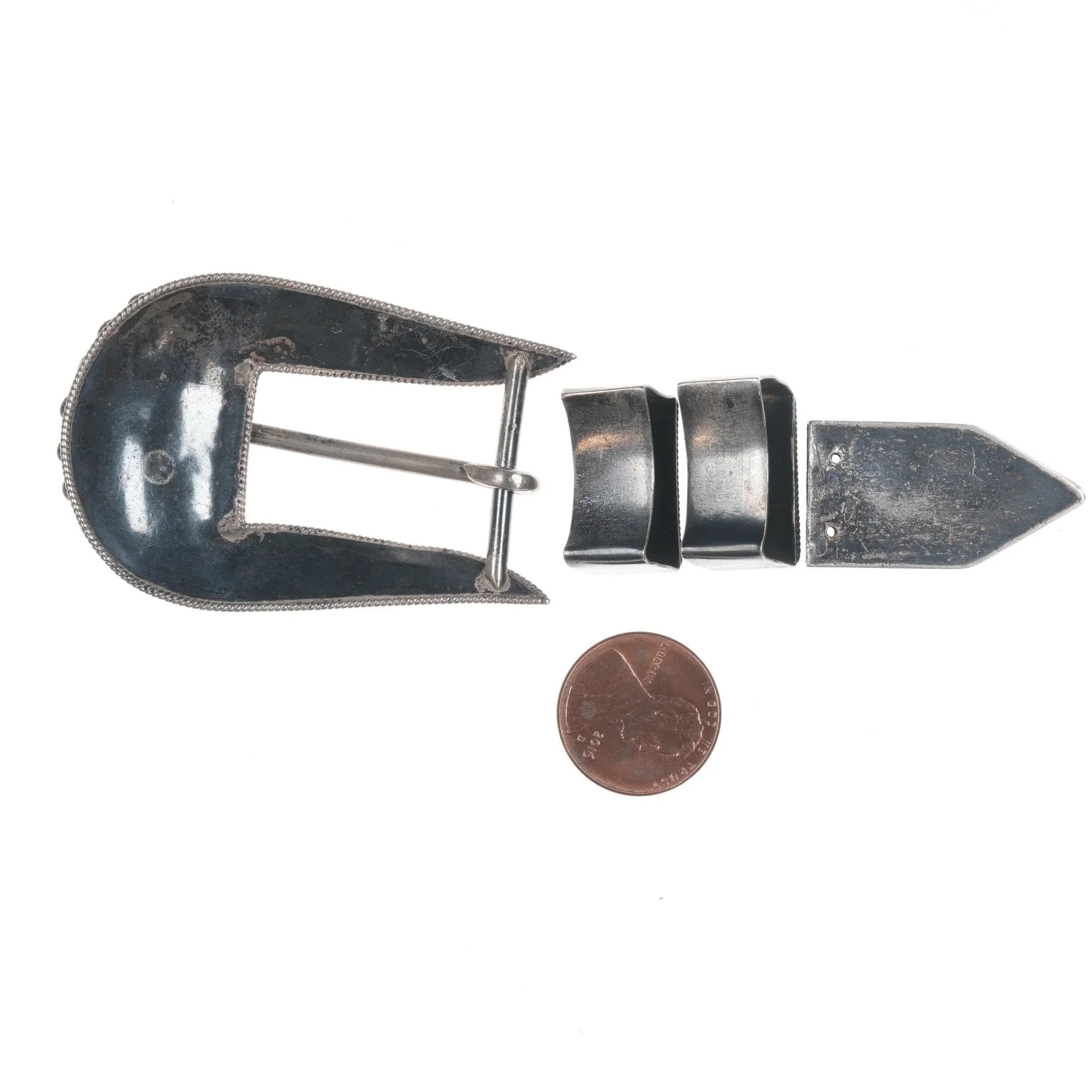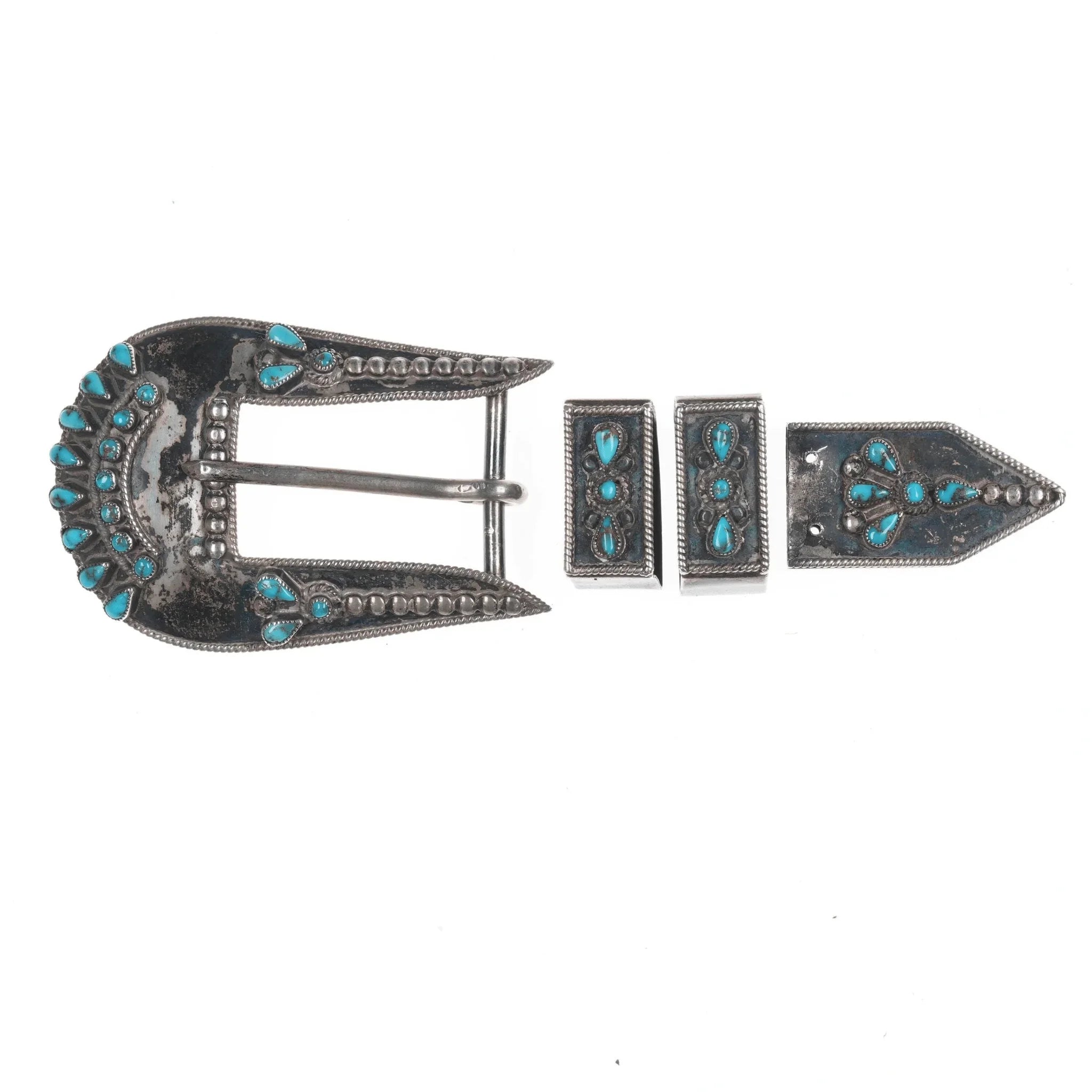 40's-50's Zuni High grade Turquoise petit point silver ranger belt buckle set. This turquoise really looks like high grade Bisbee, It's the most attractive turquoise I have seen in this type of work. If it's Bisbee, I guess it would have to be from after 1950. Fits a 3/4" belt, the buckle measures 2.25" x 1 5/8". 27.8 grams total <br><br>Marked or unmarked as shown in pics, weight and other measurements in pics. Sorry but my jewelry is stored in a secure location and cannot be accessed for more pictures,<br>videos, or measurements until sold. If you look at pictures/description your<br>question should be answered. Thank you so much for your time and consideration! If you would like to chat, that would be great, but lets chat about something that isn't answered in this listing that we put so much effort into already :)<br><br>All precious metals are tested and guaranteed. A Native American jewelry piece referred to as "silver" or "ingot" is guaranteed to be at least 90% silver. I rarely use the word "sterling" when referring to older Native American silver or really any older silver jewelry as silver contents vary and "sterling" is 92.5% silver. No older jewelry is going to be exactly 92.5% silver, some a little over, some a little under. It wasn't an exact thing with handmade jewelry. I've seen thousands of pieces xrf'd to prove this. Bracelets are photographed on a 6" women's wrist.