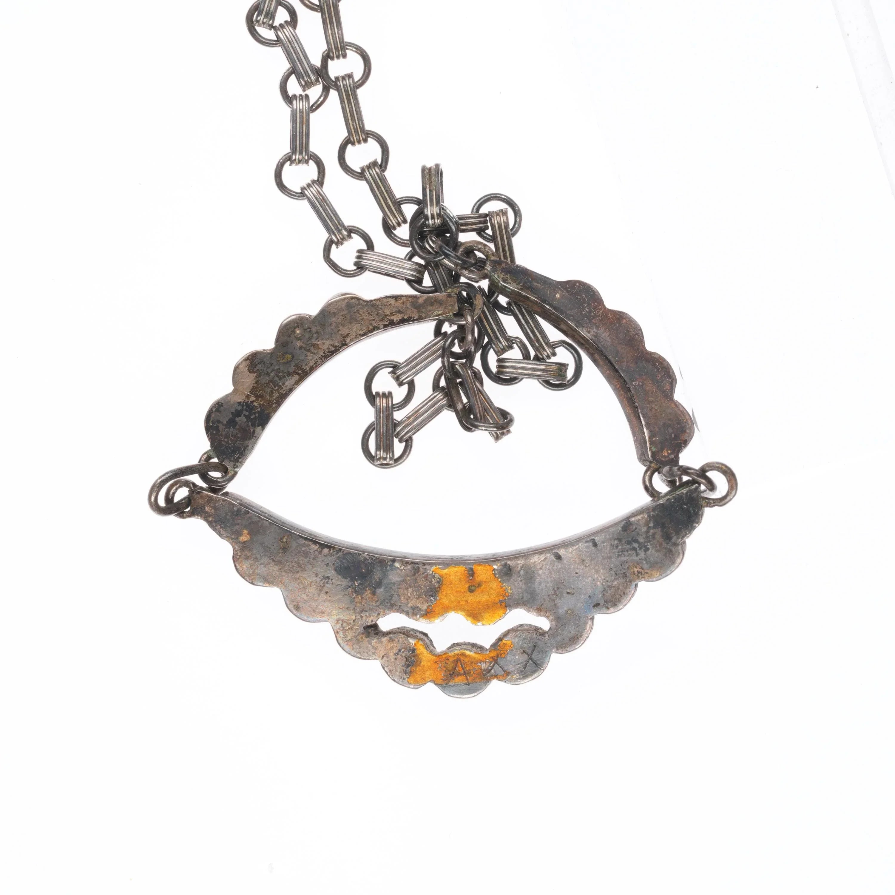 Some of his most spectacular pieces are belts with conchas of inlaid spiny oyster shell. Homer also made inlaid Knife Wings and Rainbow Gods, and he is credited with the first use of the Gan dancer as a jewelry design motif.
