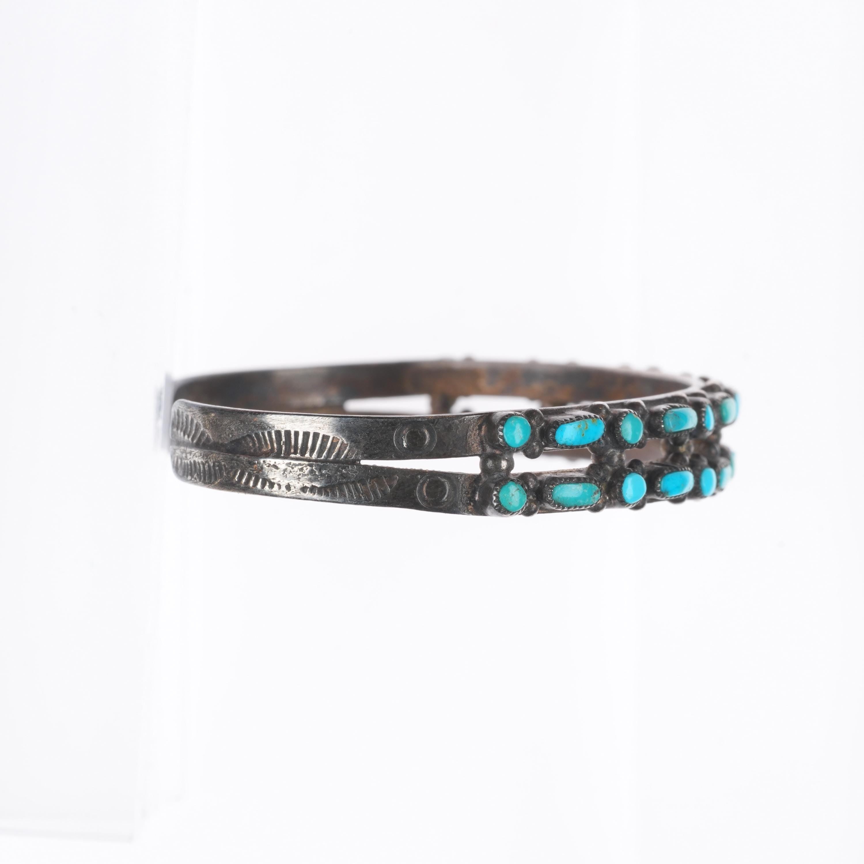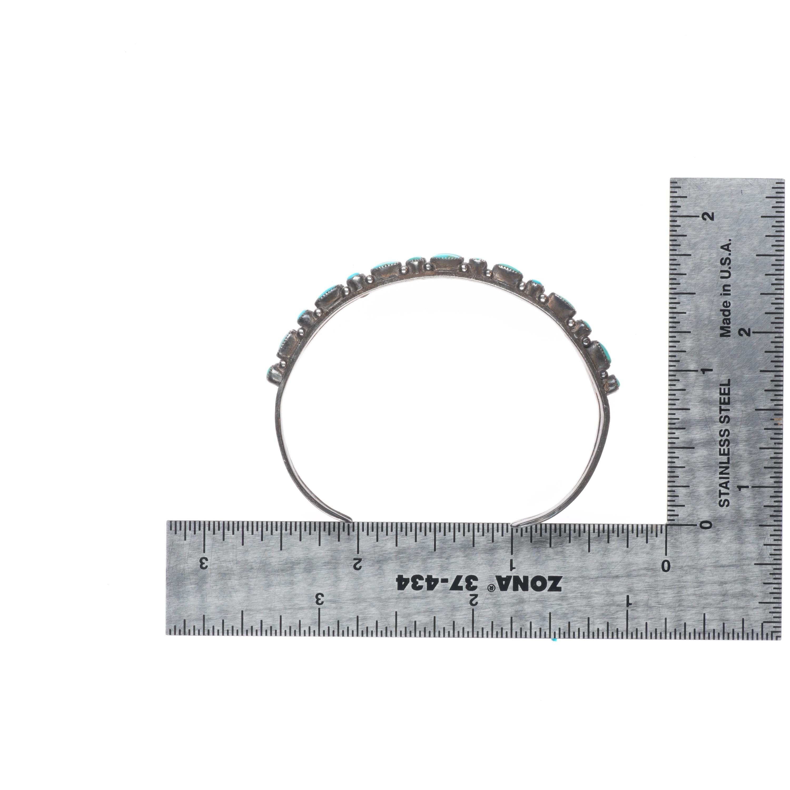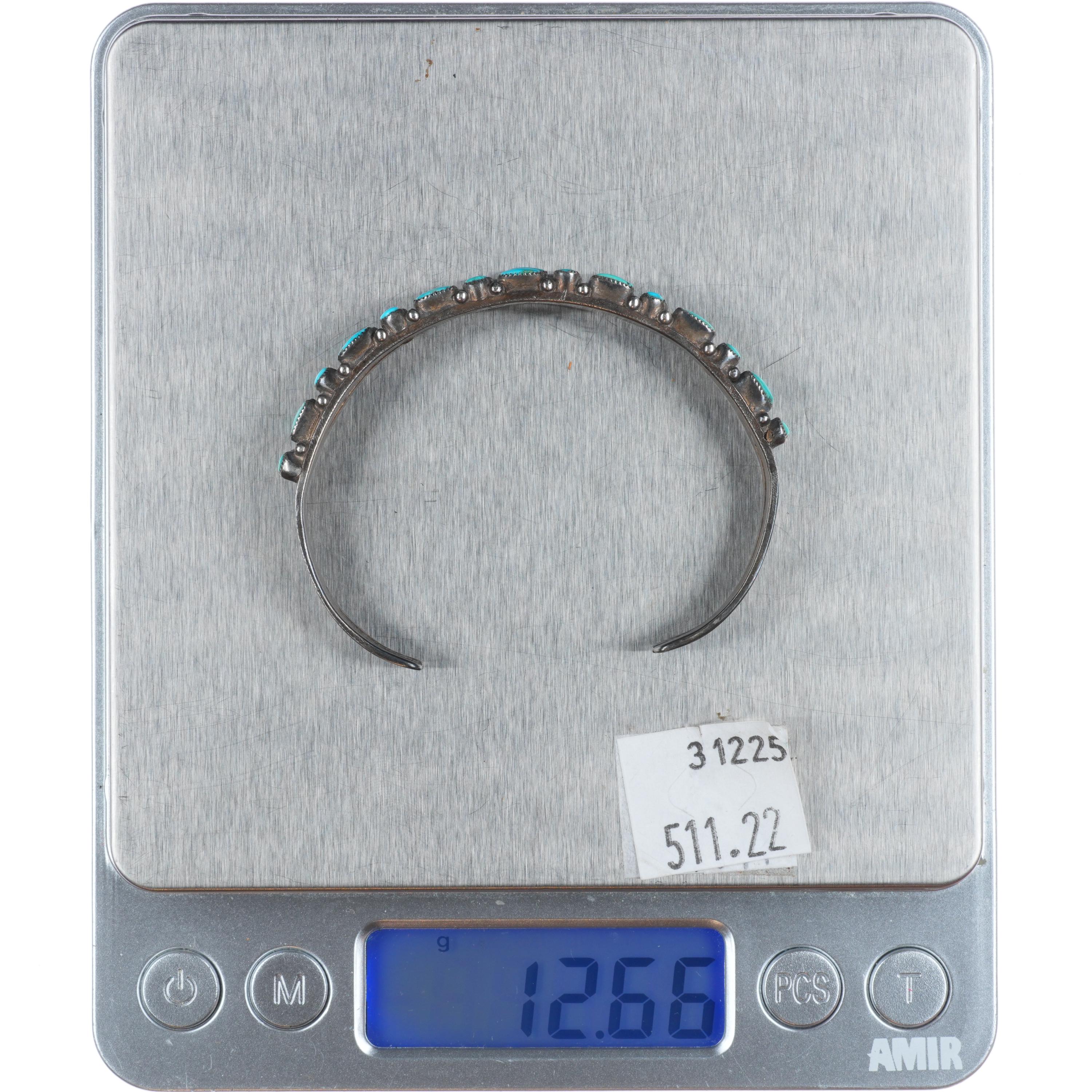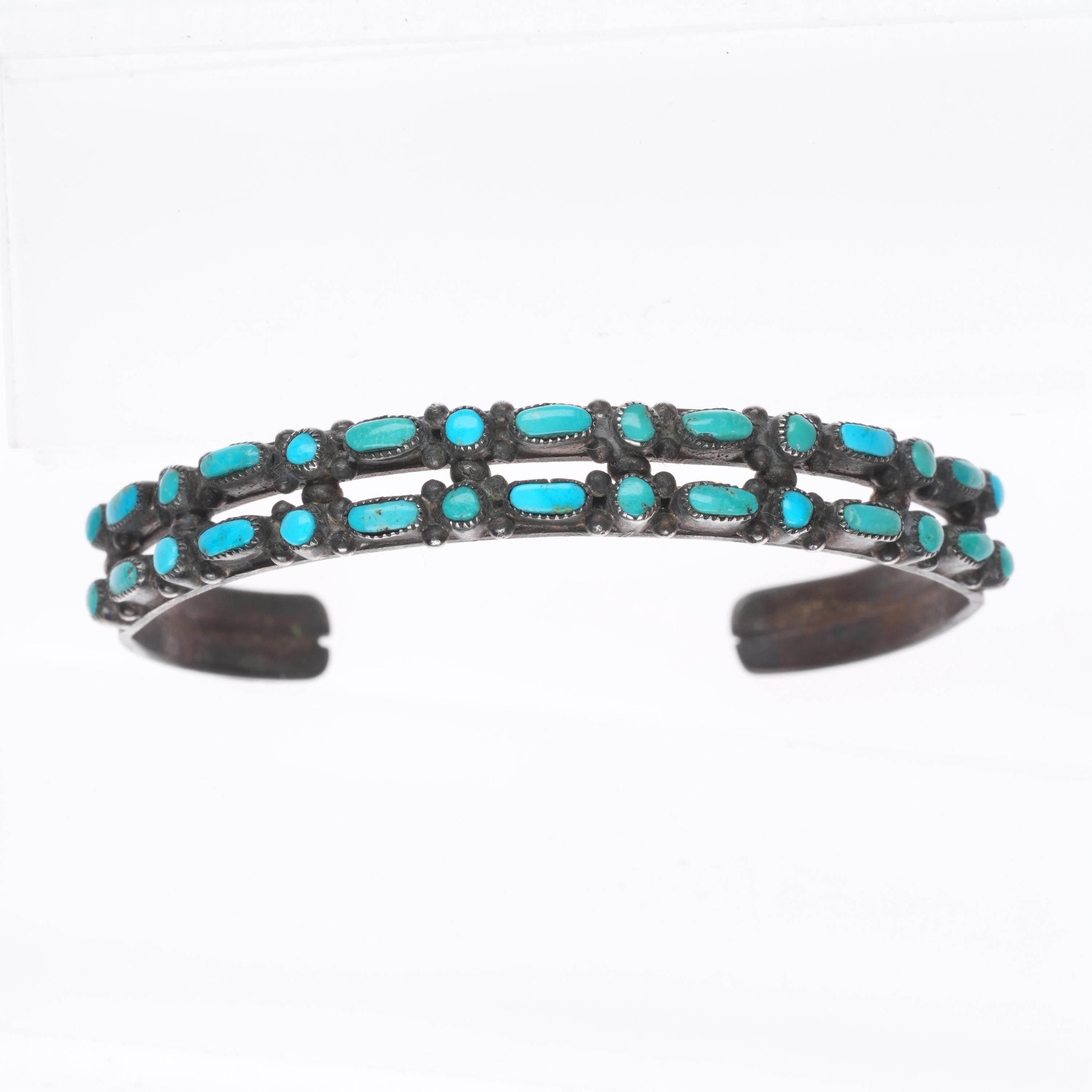 5.75" 1940‘s Vintage Zuni sterling silver dot-dot-dash turquoise cuff bracelet. Tested and guaranteed solid sterling silver with weight and measurements in pictures. Circa second quarter of the 20th century with some expected age appropriate wear.
