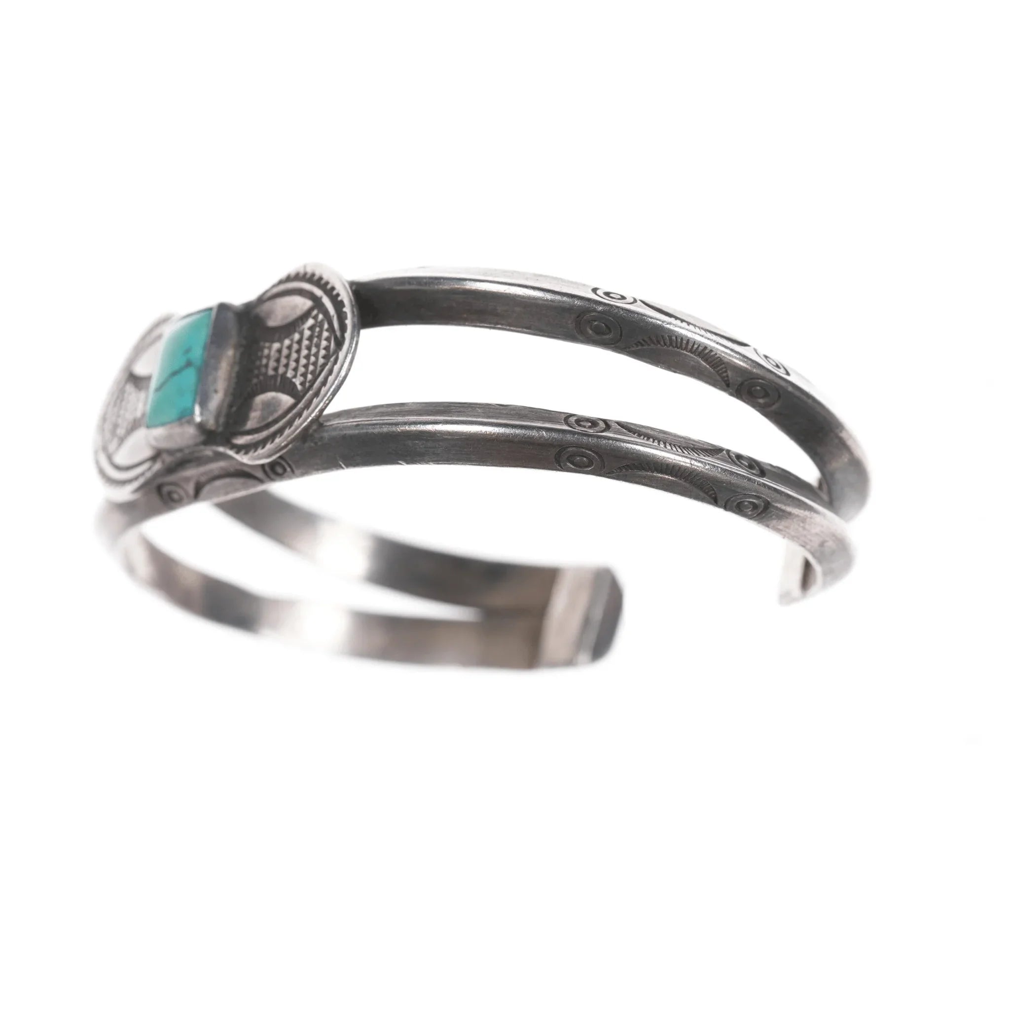 5.75" c1920's Navajo ingot silver cuff double shank stamped cuff bracelet with turquoise