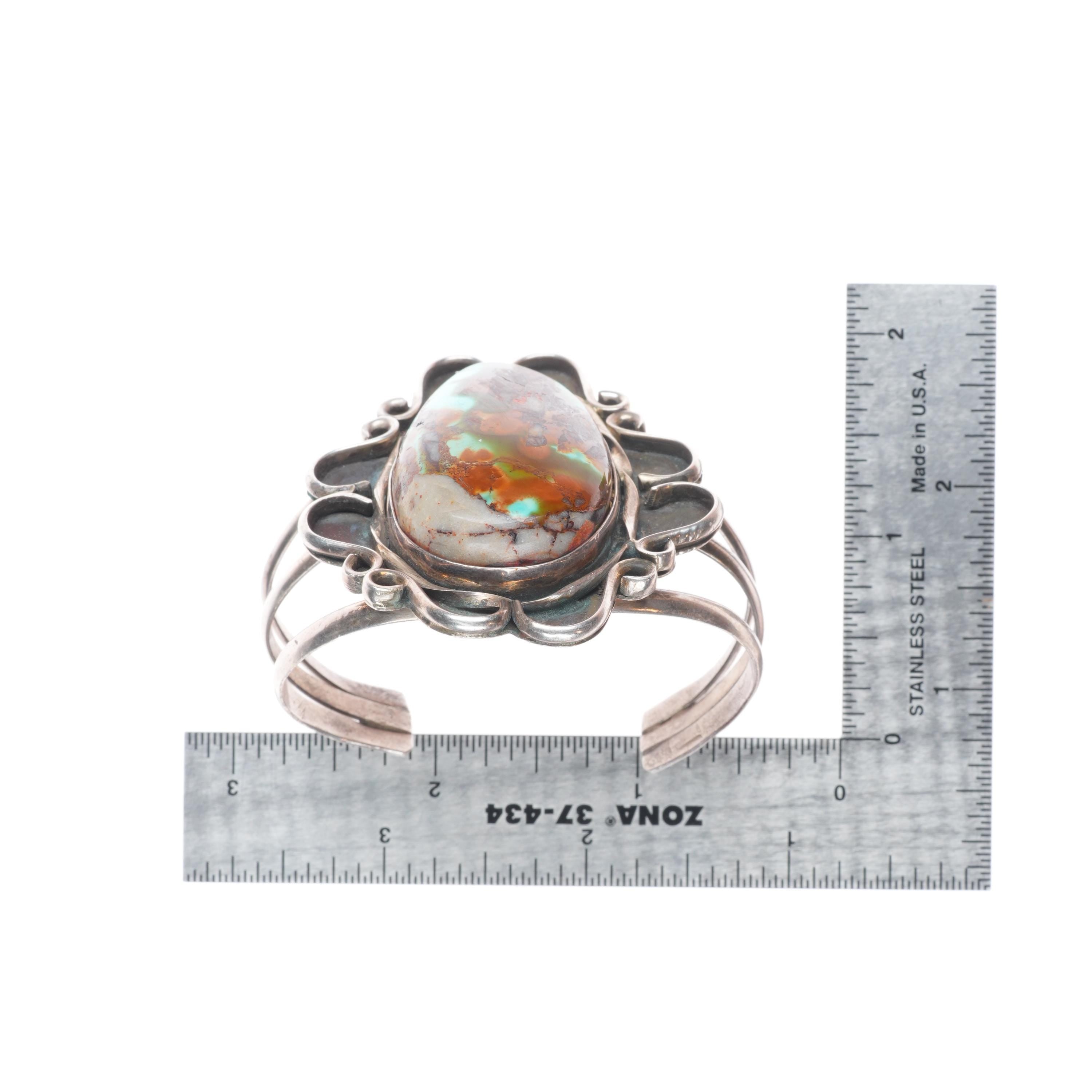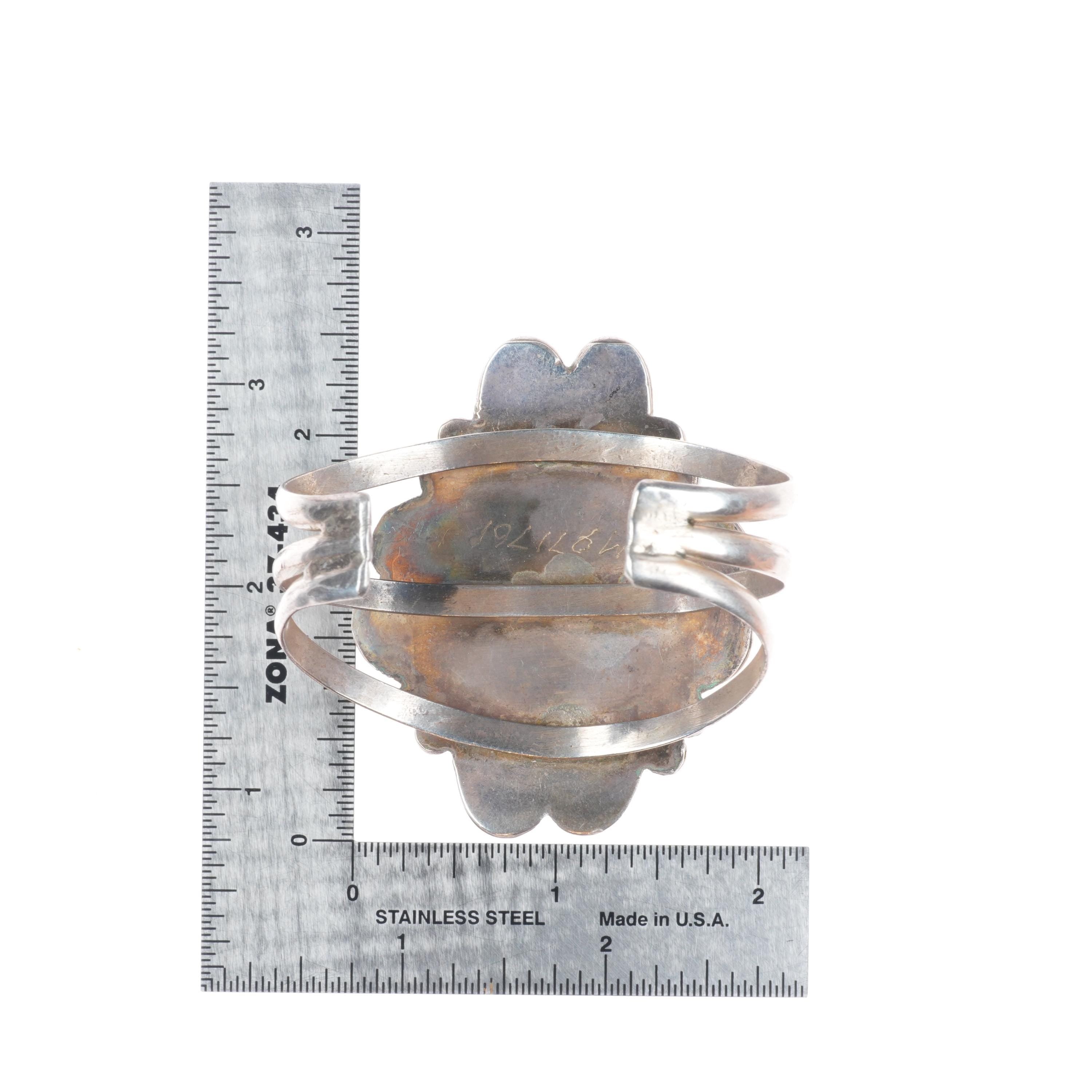 5.8" Vintage Navajo sterling silver cuff bracelet with nice Royston turquoise. Tested and guaranteed solid sterling silver with weight and measurements in pictures. Circa third quarter of the 20th century with some expected age appropriate wear.