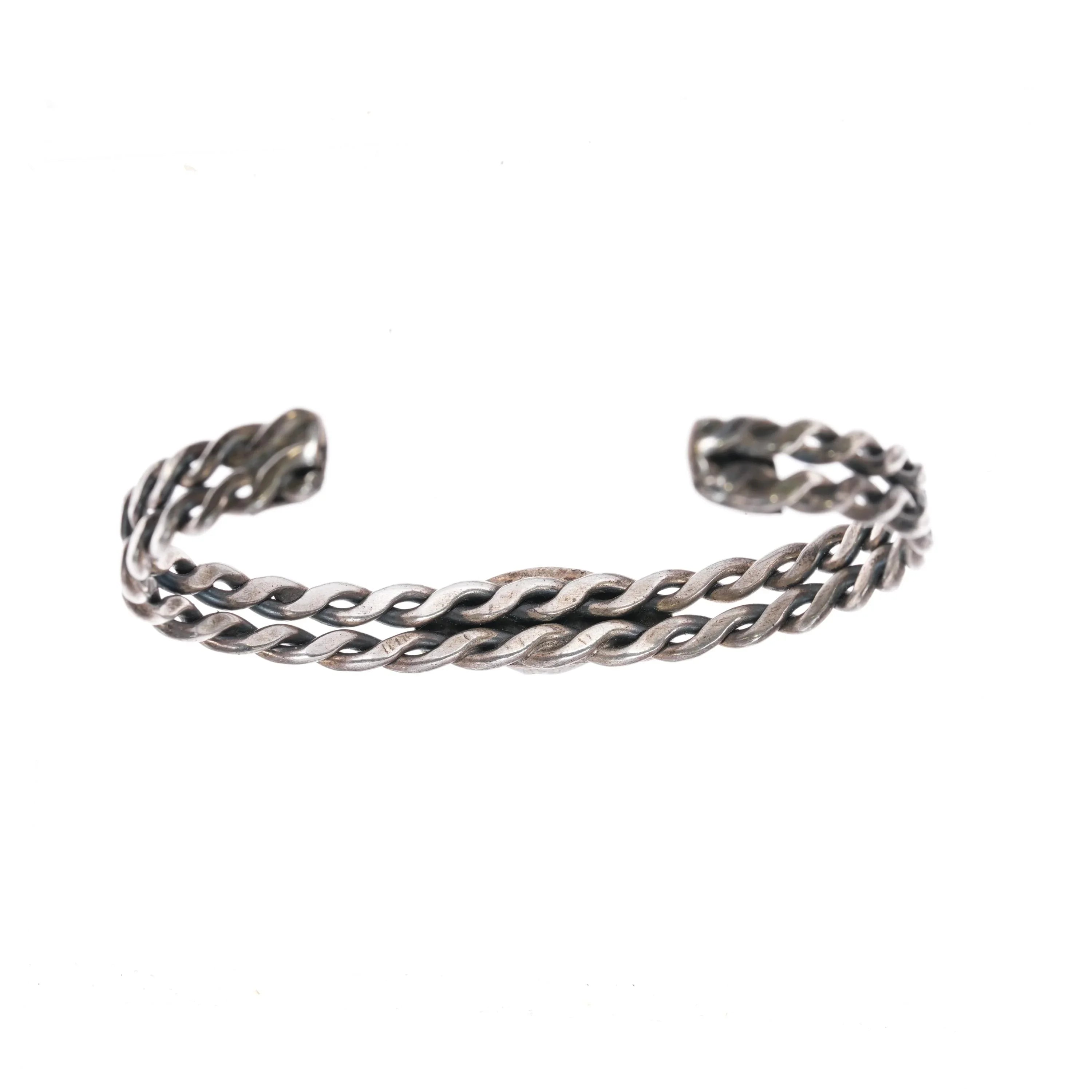 6 1/8" Vintage Pueblo silver twisted wire turquoise cuff bracelet. Solid sterling silver guaranteed, weight and measurement in pics. No damage. Unmarked, circa mid 20th century.