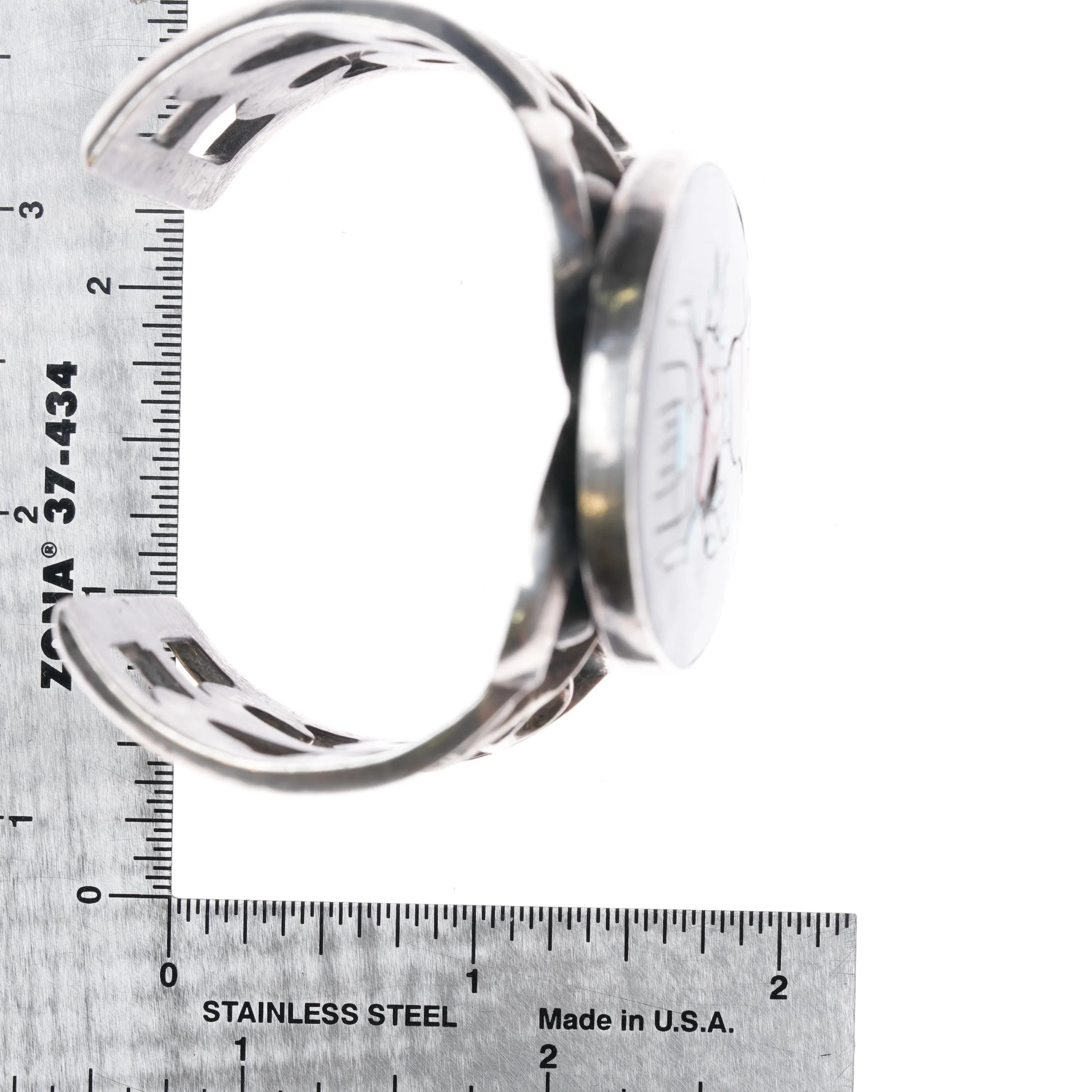 6.1" Vintage Zuni Gaun Dancer Inlaid cuff bracelet cast sterling silver. Weight and measurements in pictures, unmarked, circa mid 20th century. Very nice materials used in the inlay, quality work. There is a spot of loss to the shell .25" x 1/8" just to the left of the dancer under her armpit. The inlay is stable and secure.