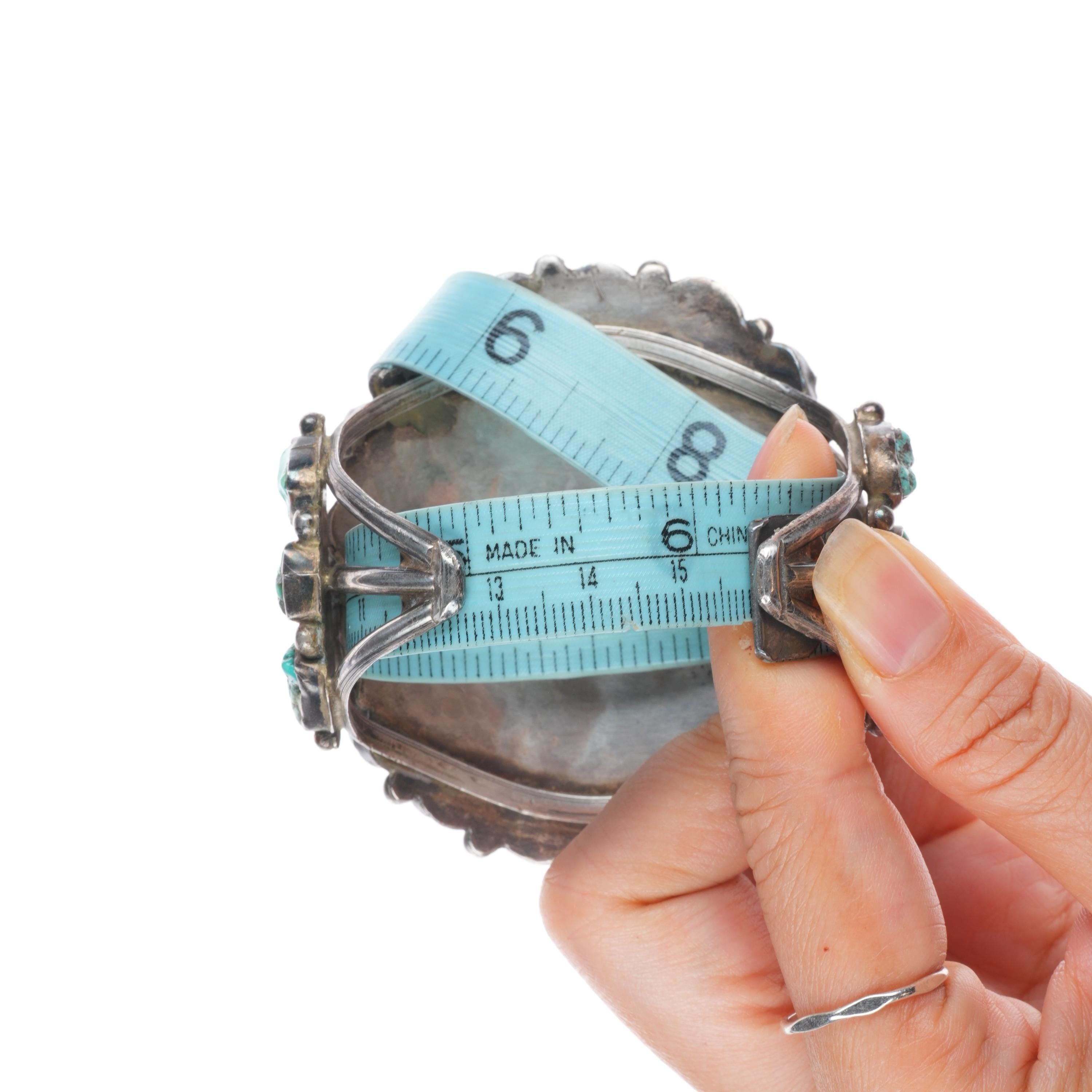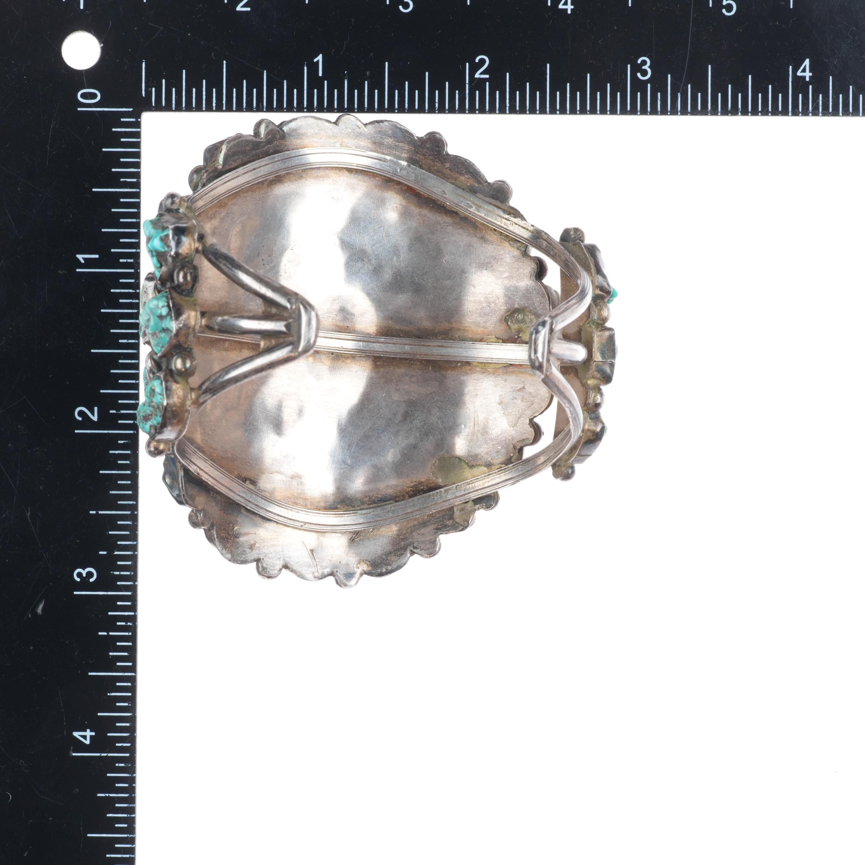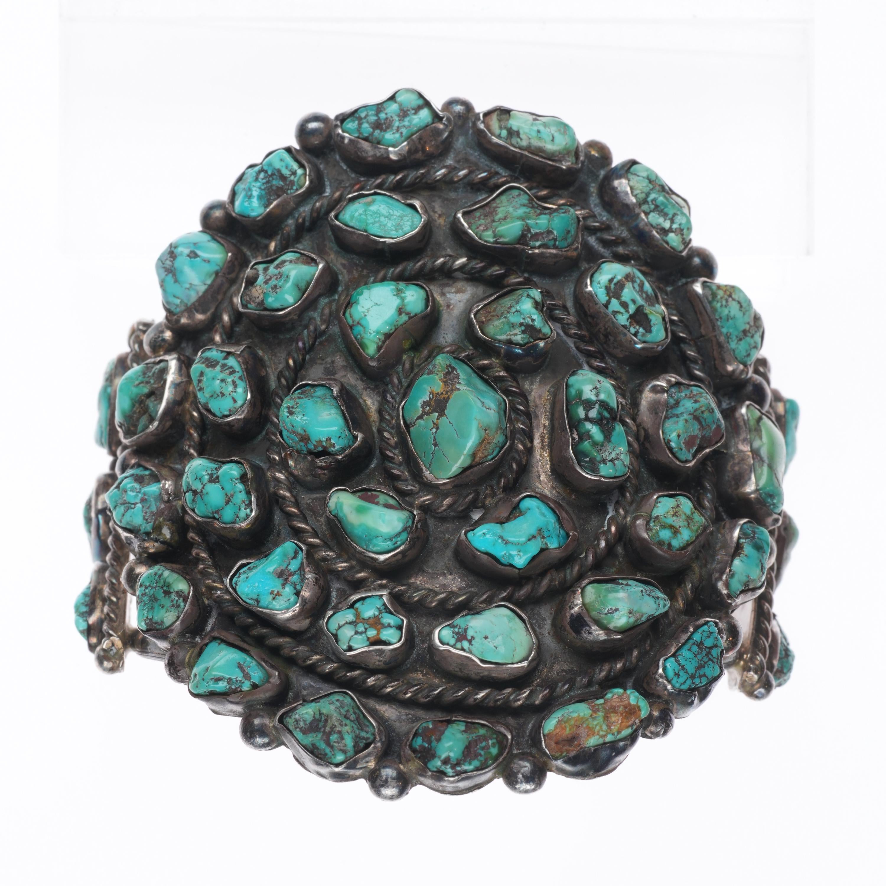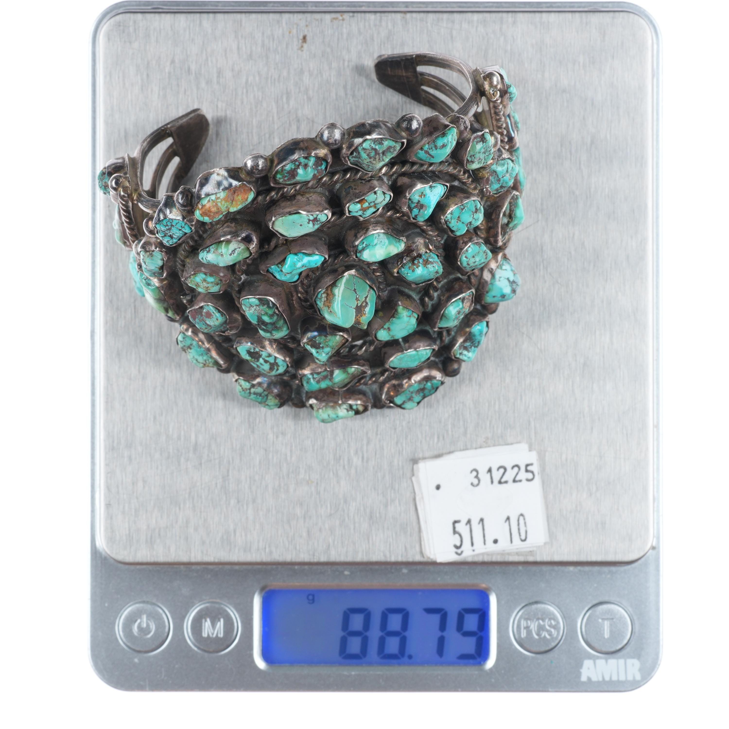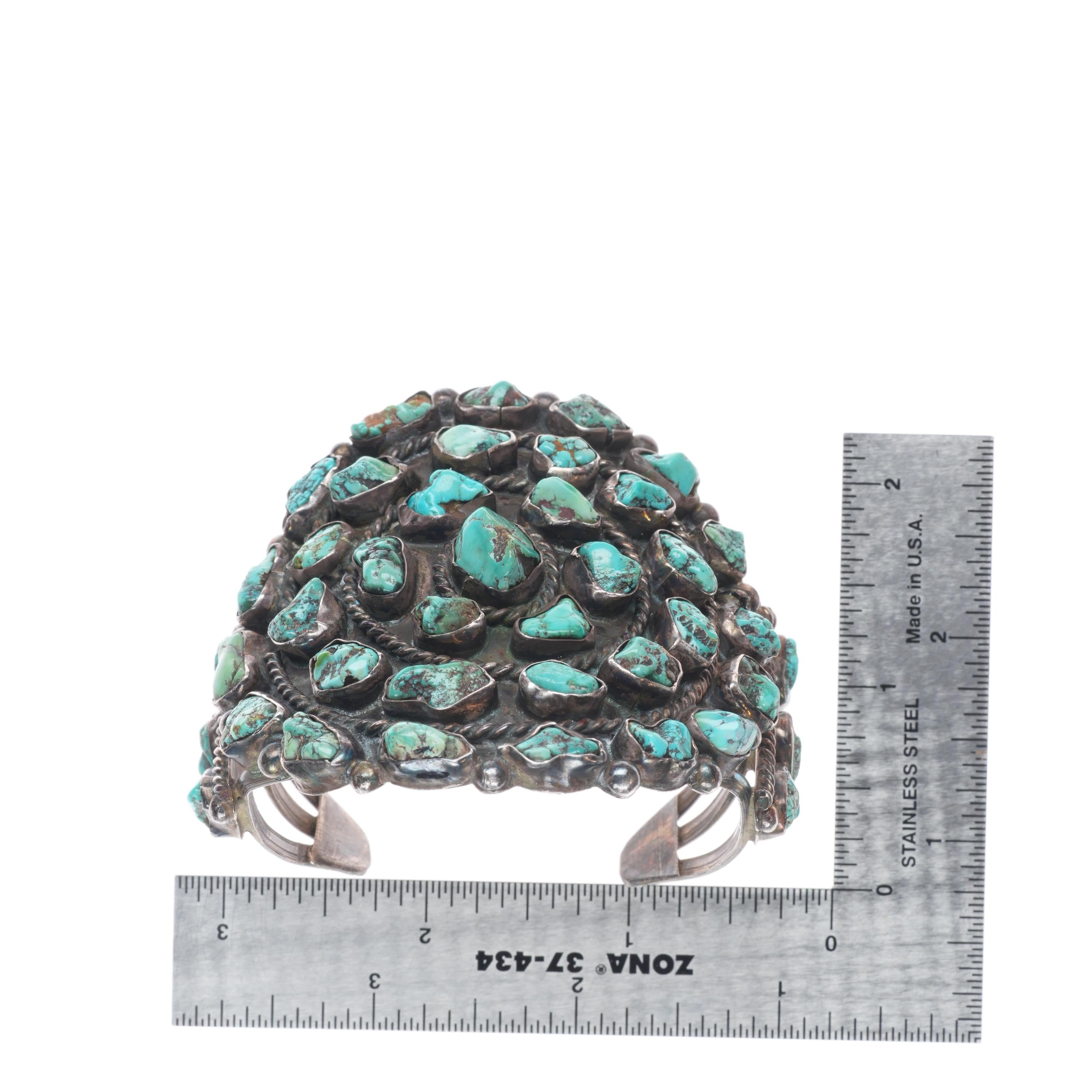 6.1" Vintage Zuni sterling silver turquoise nugget cluster cuff bracelet. Tested and guaranteed solid sterling silver with weight and measurements in pictures. Circa third quarter of the 20th century with age appropriate wear.. No apparent markings.