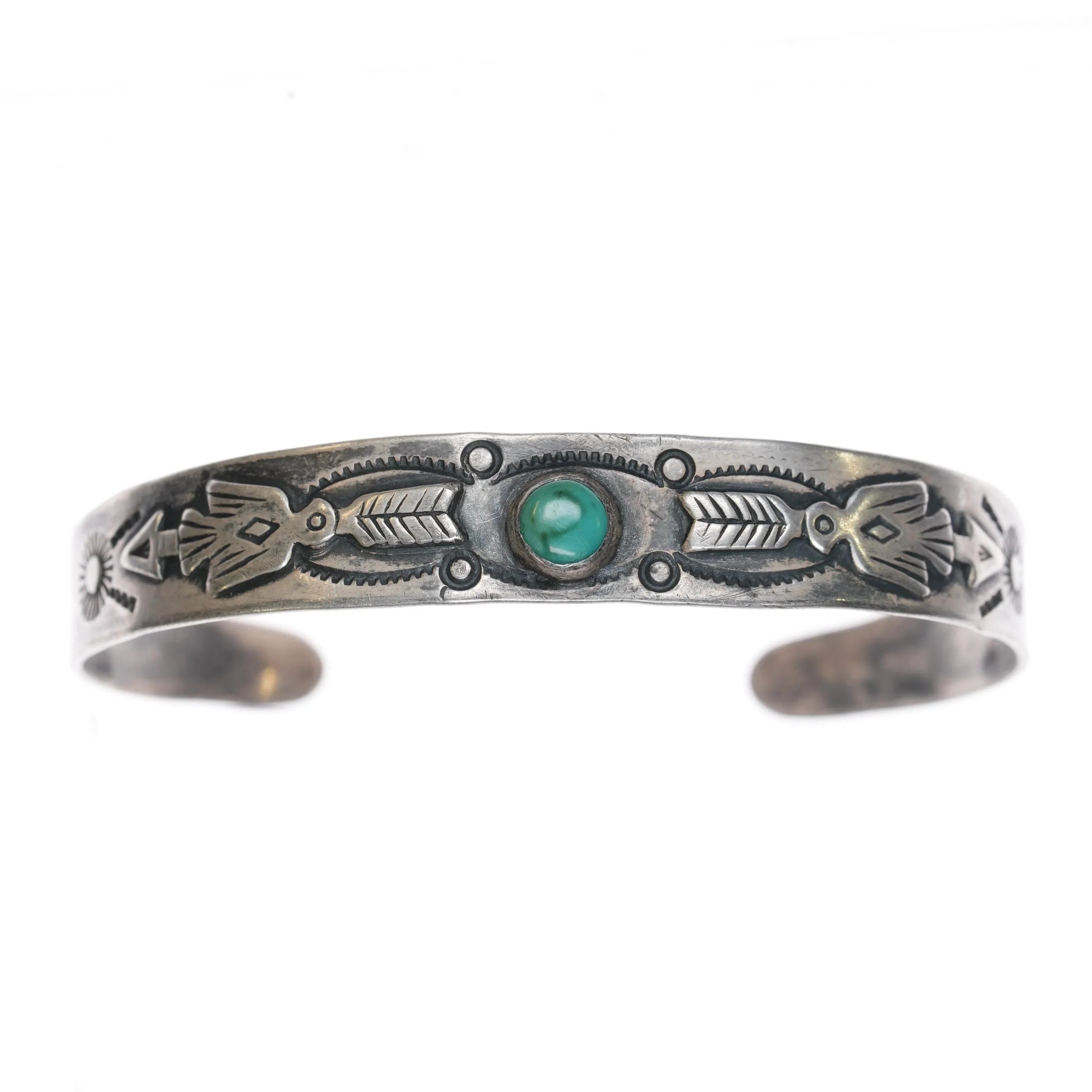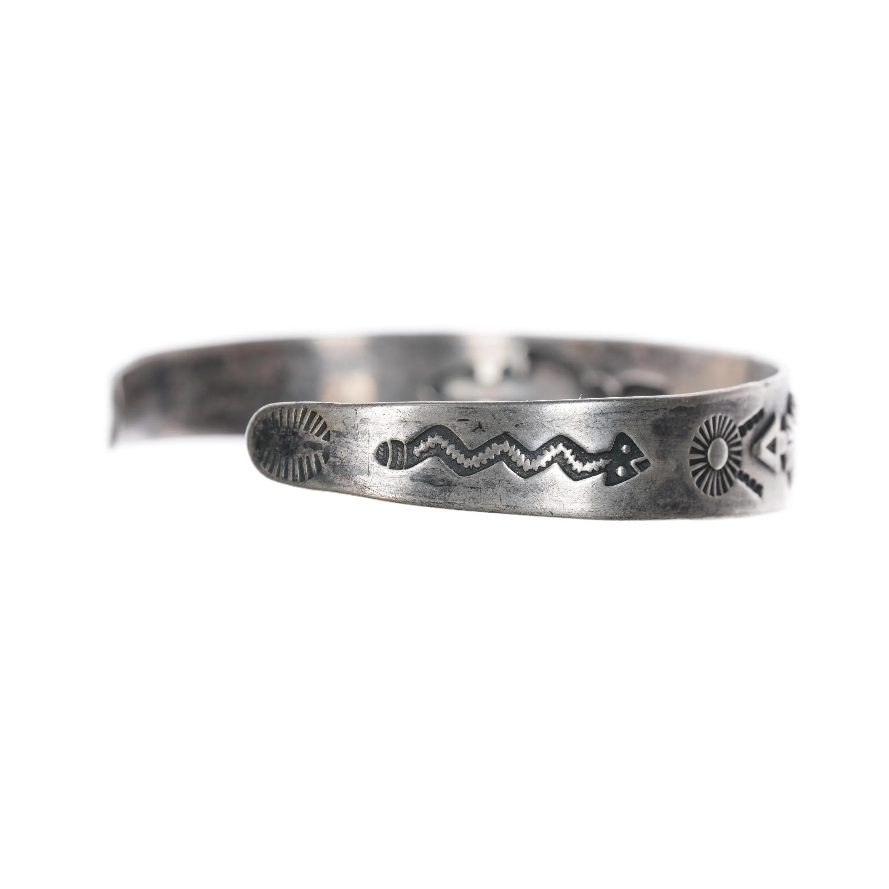 6.2" c1940 Fred Harvey Sterling silver snakes, arrows turquoise cuff bracelet