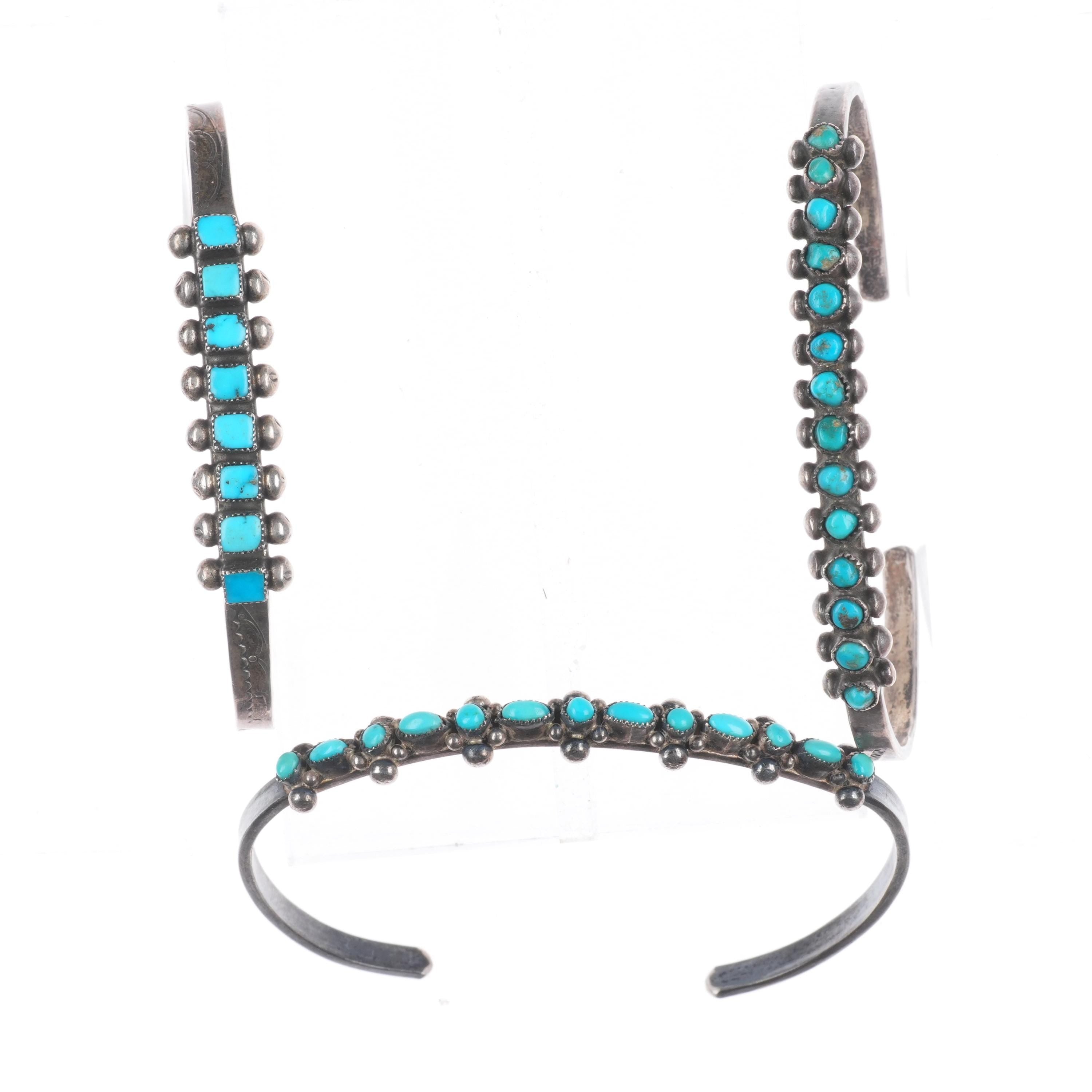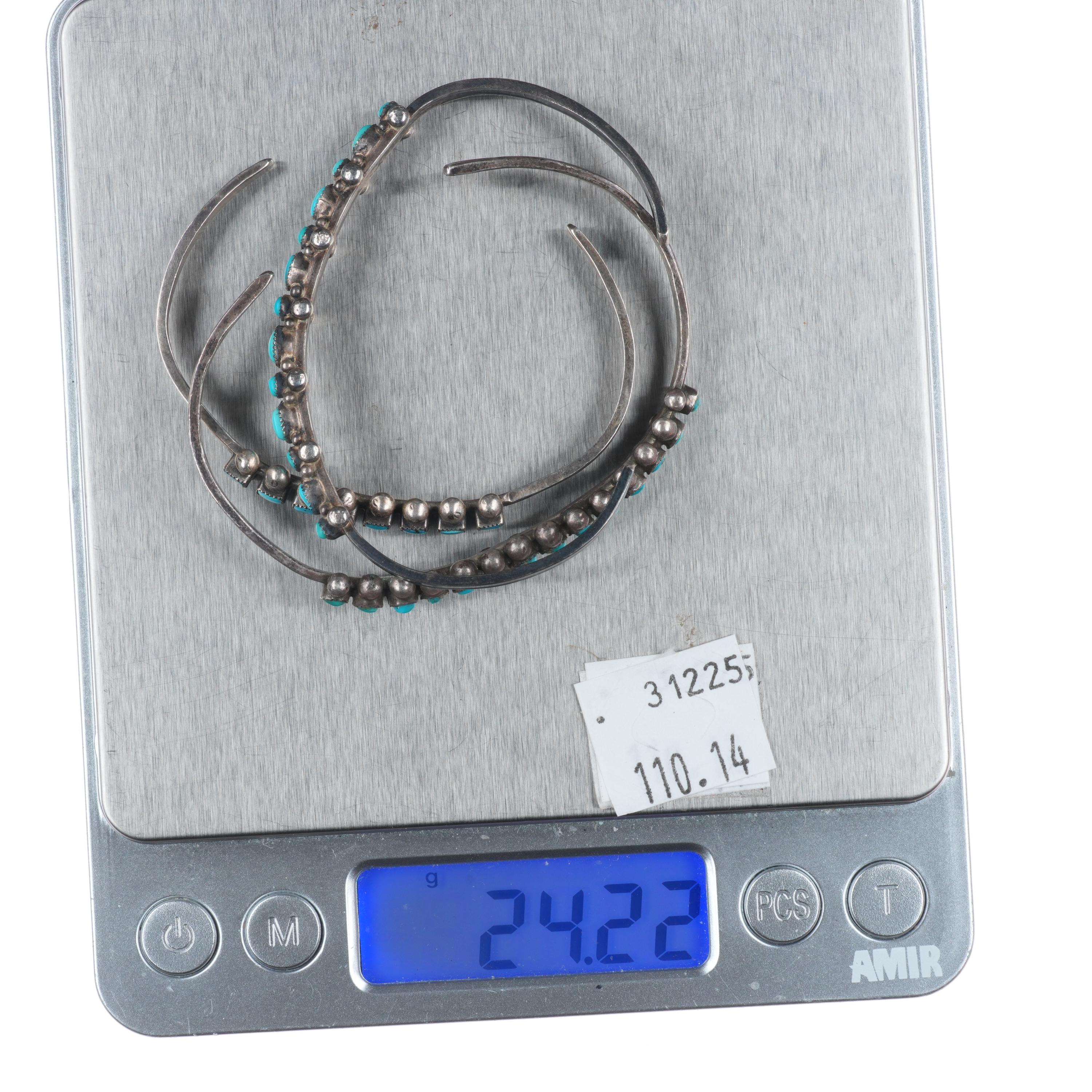 6.2" Zuni sterling silver dot-dot-dash/snake eye/square turquoise cuff bracelets