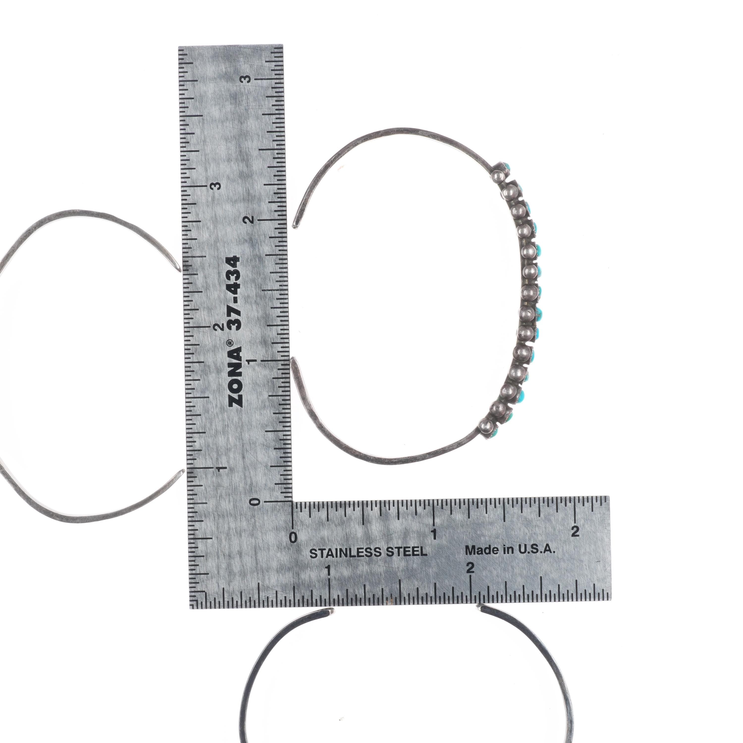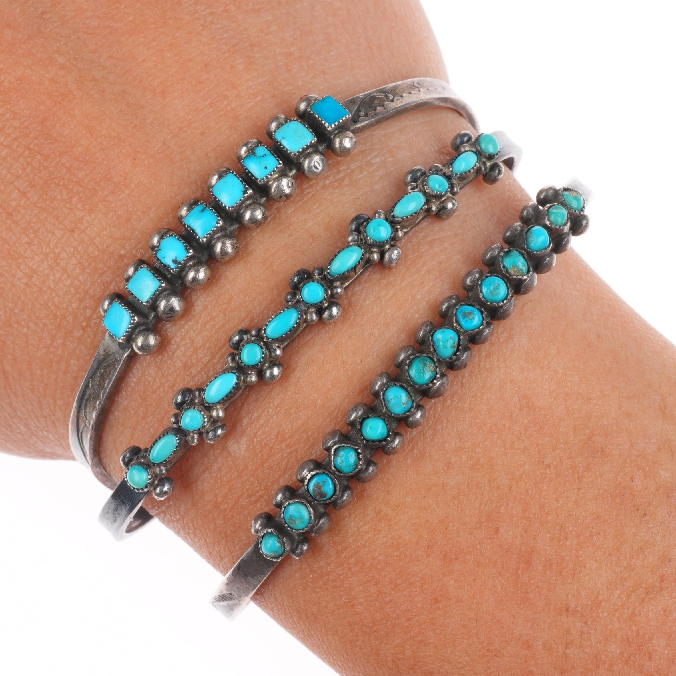 6.2" Zuni sterling silver dot-dot-dash/snake eye/square turquoise cuff bracelets. Tested and guaranteed solid sterling silver with weight and measurements in pictures. Ranging from 6" to 6.25" and can be slightly adjusted. All mid 20th century, selling all three.