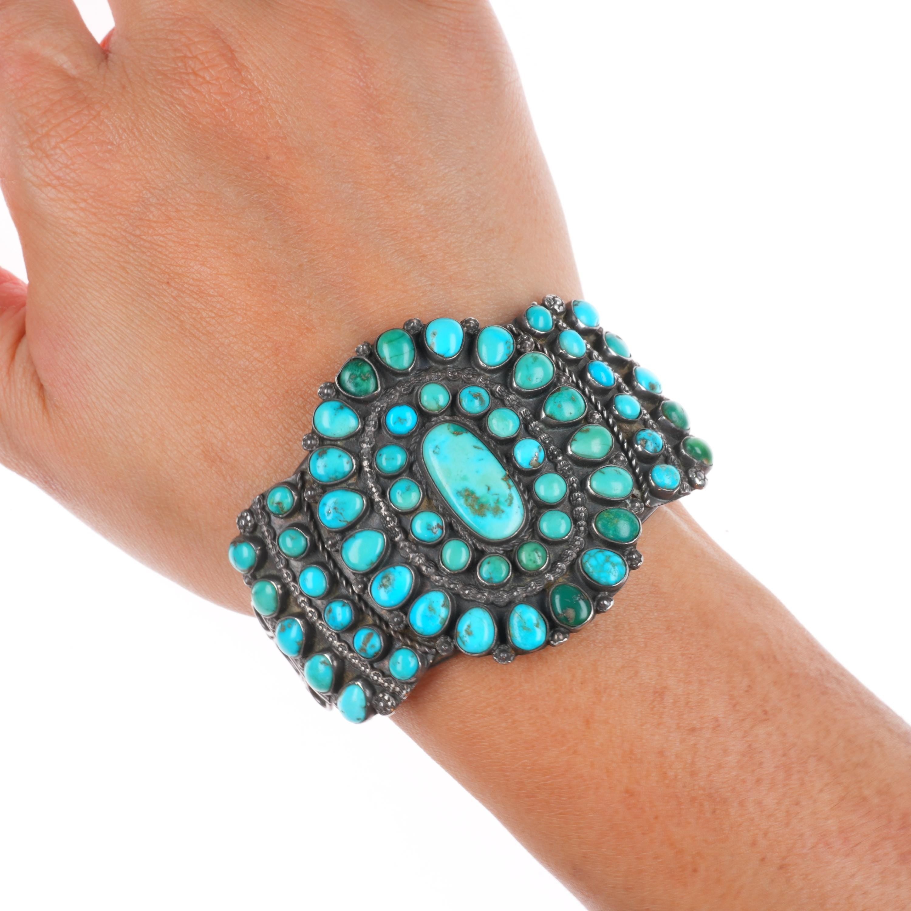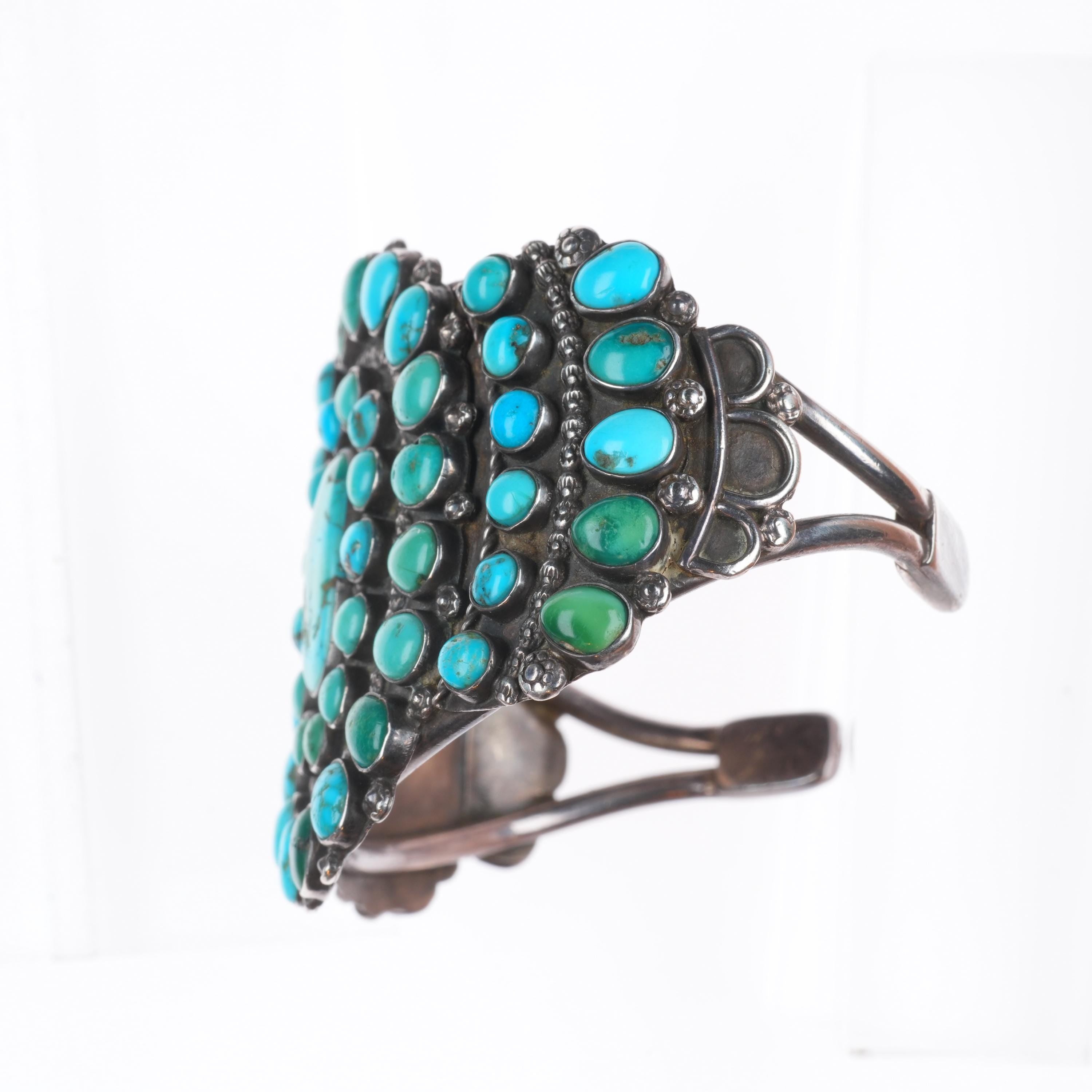 6.25" 1930‘s Zuni turquoise cluster cuff bracelet ingot/sterling silver. Tested and guaranteed solid sterling silver with weight and measurements in pictures. Circa second quarter of the 20th century with age appropriate wear..