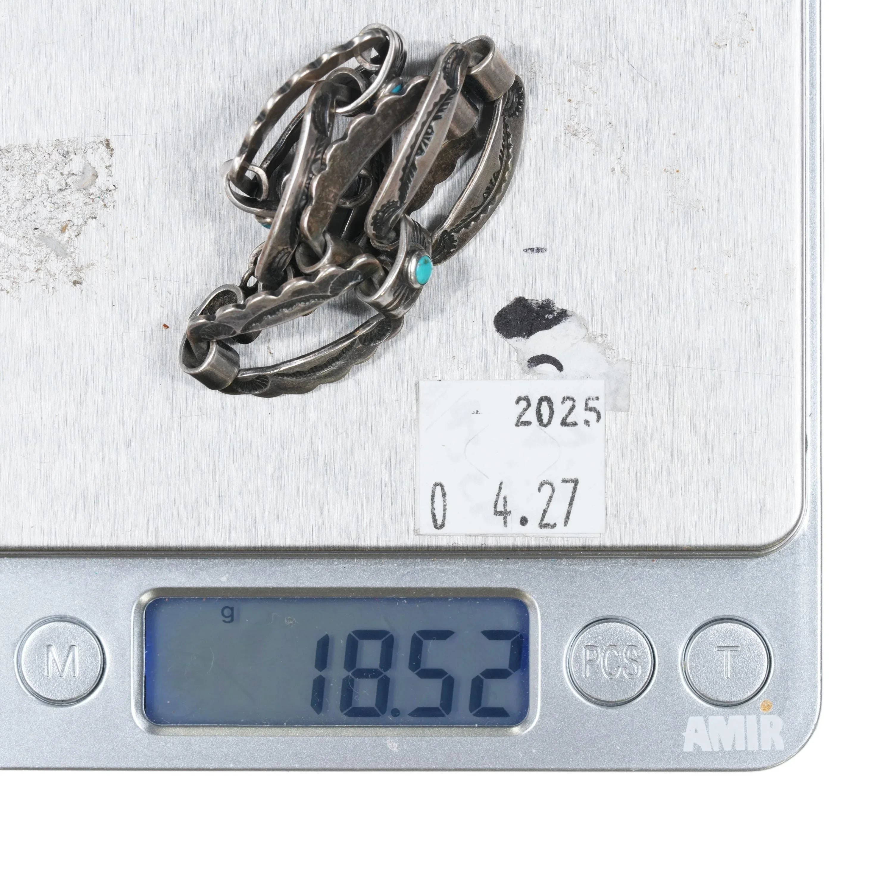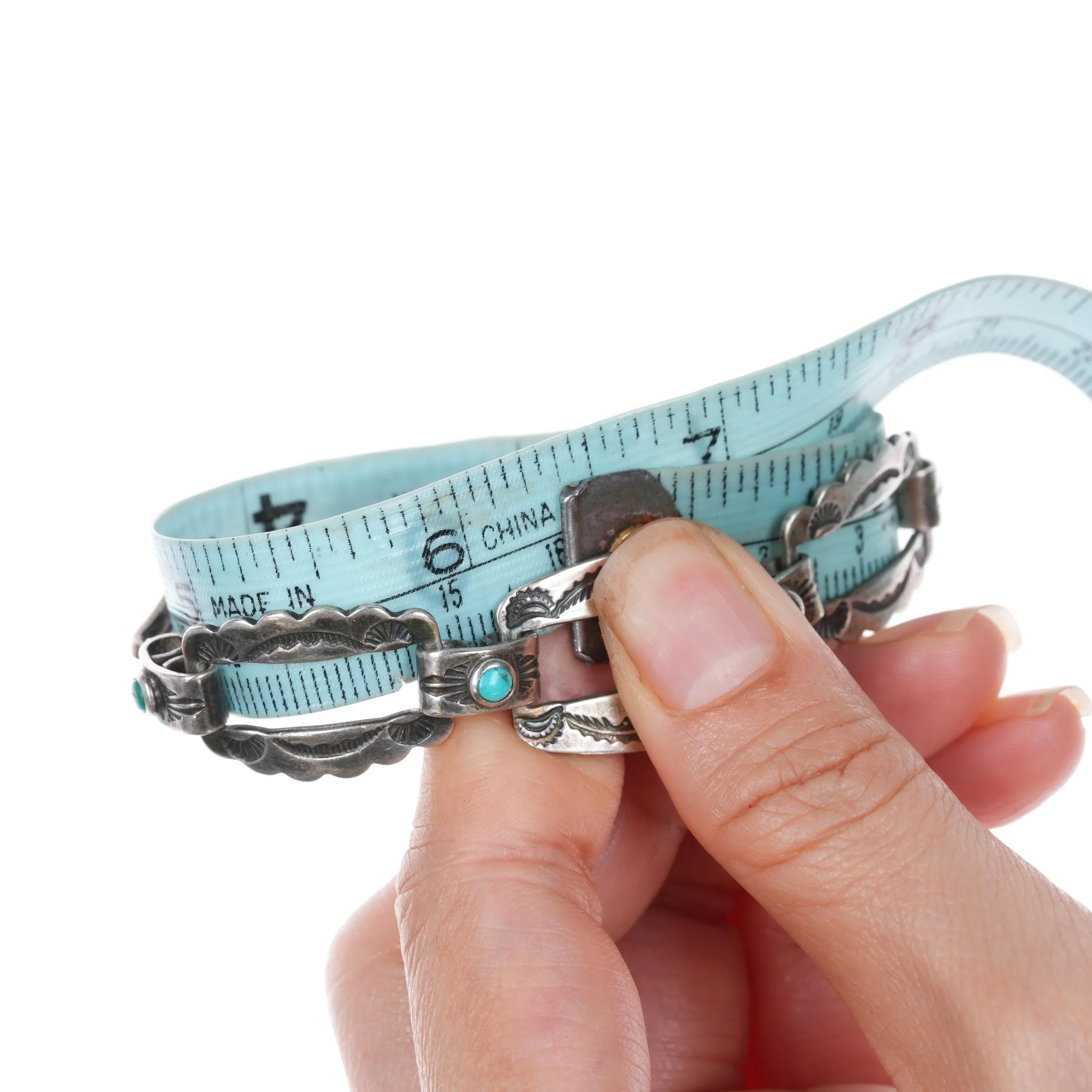 6.25" 1940‘s Navajo Fred Harvey sterling silver link bracelet w/turquoise. Weight and measurements in pictures, solid sterling silver. No detectable markings, circa second quarter of the 20th century.