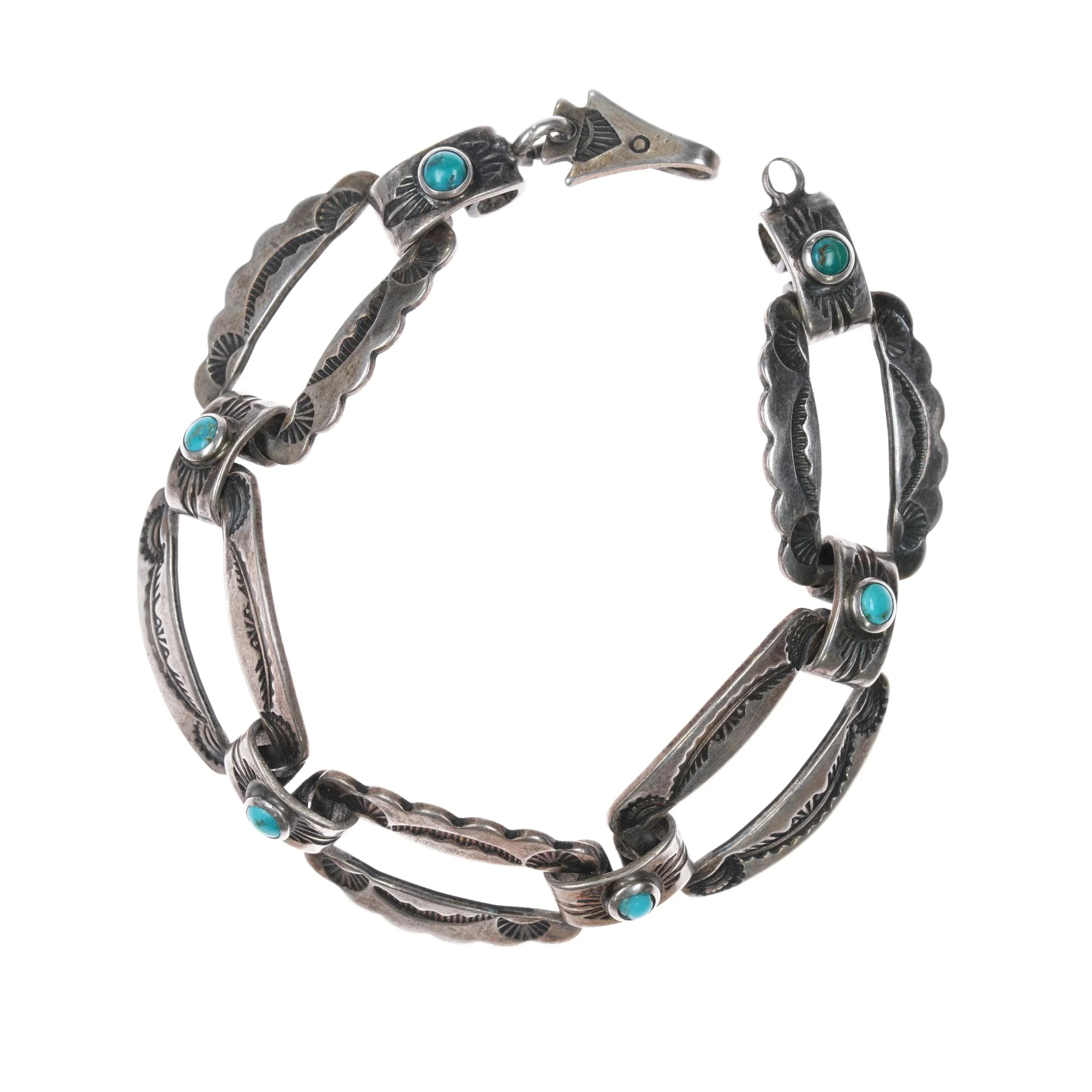 6.25" 1940's Navajo Fred Harvey sterling silver link bracelet w/turquoise