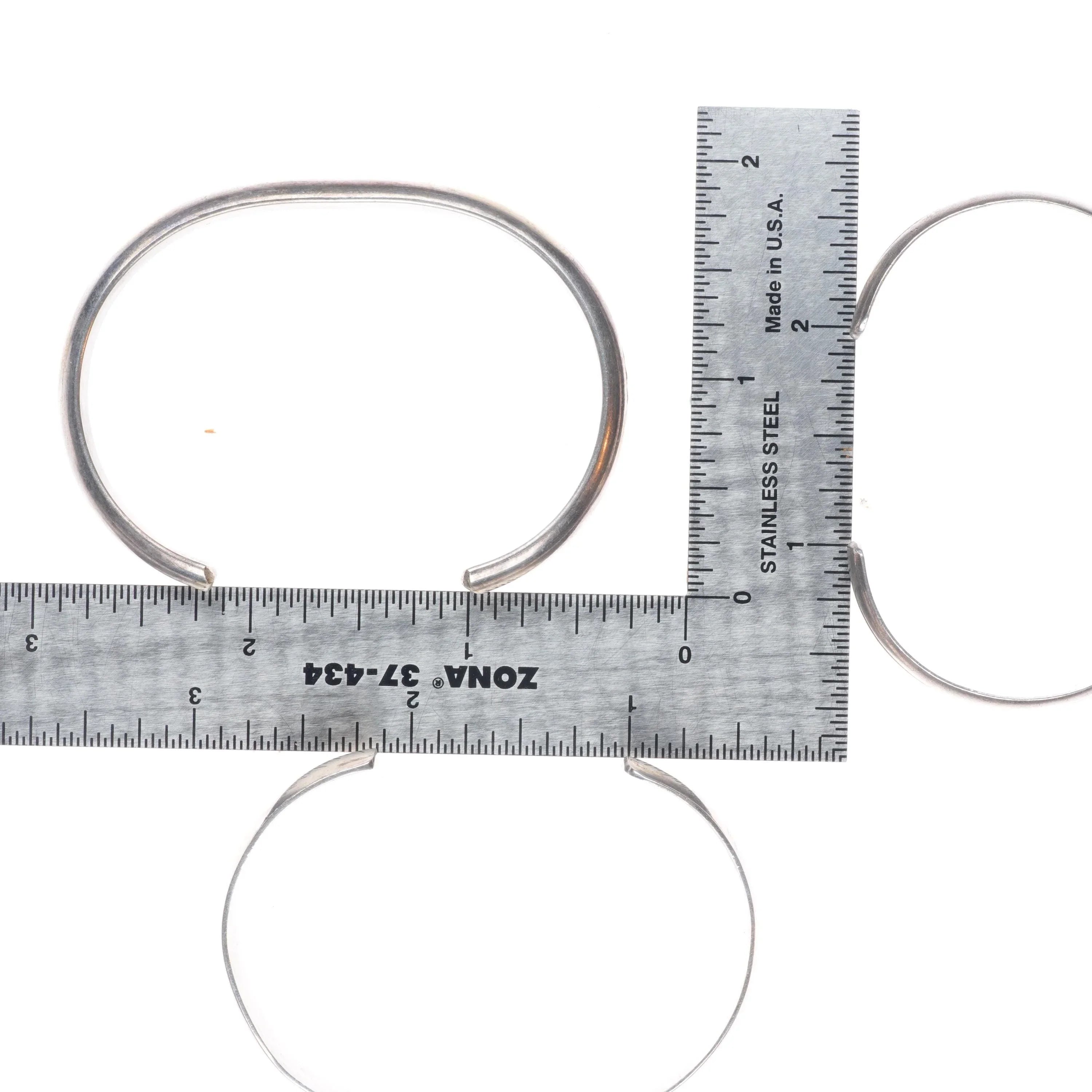 6.25"-6.5" Vintage Navajo sterling silver hand stamped stacker cuff bracelets. Tested and guaranteed solid sterling silver with weight and measurements in pictures. Circa last half of the 20th century. Selling all three, no apparent markings unless shown in pictures.