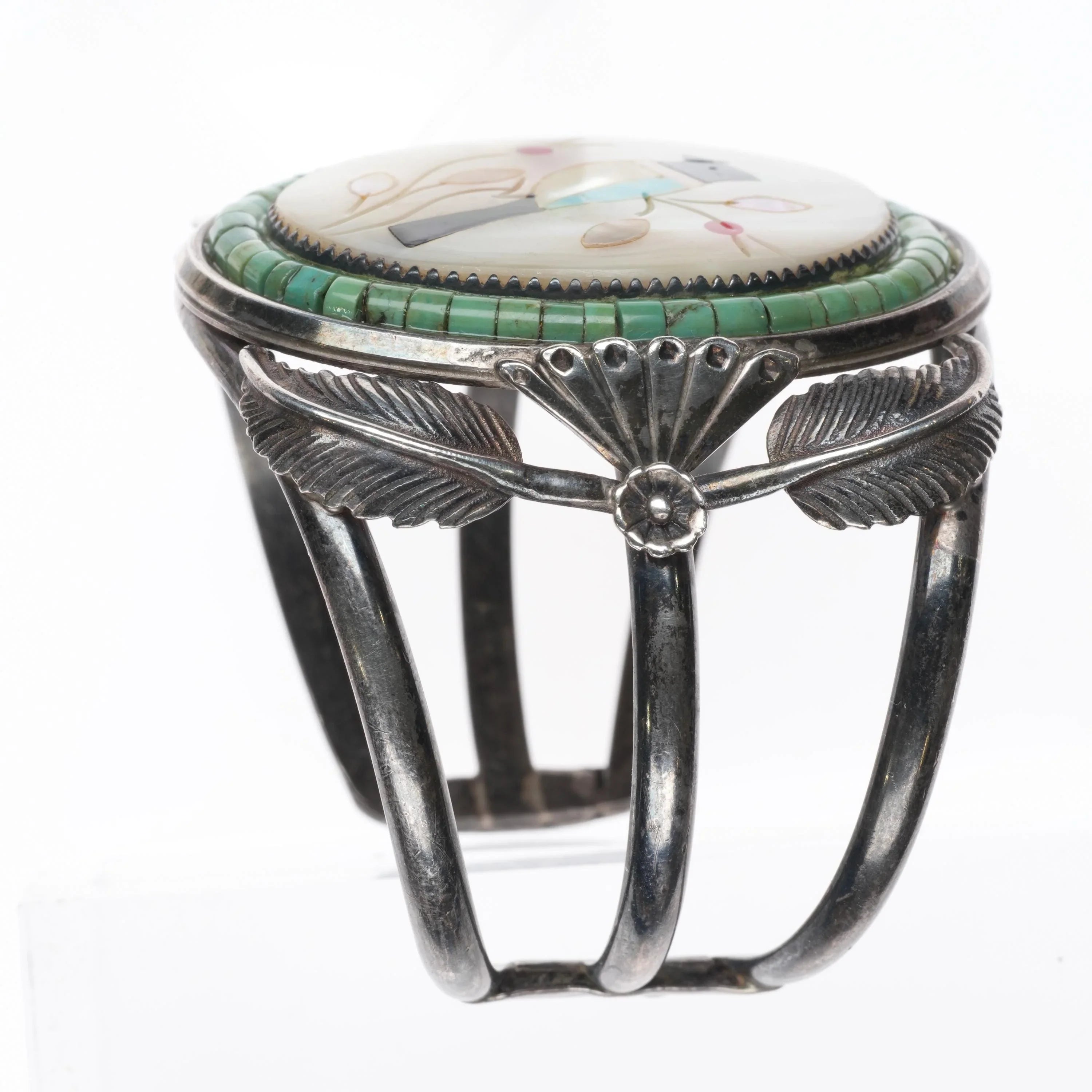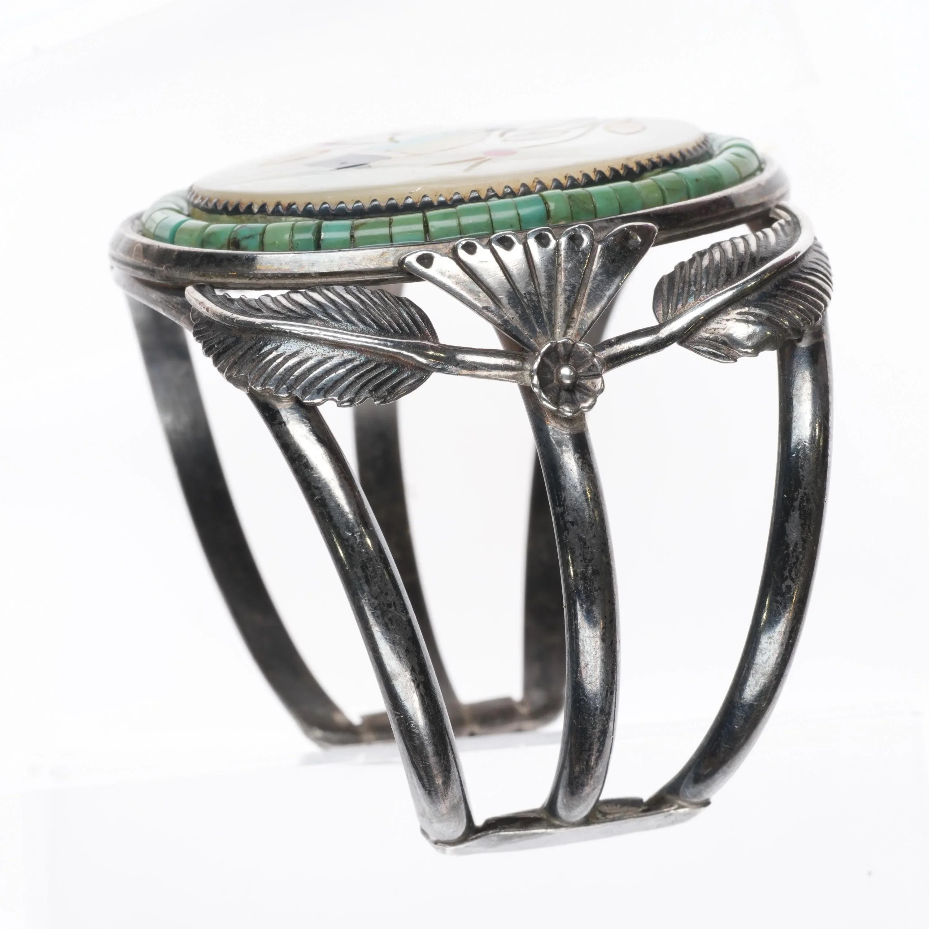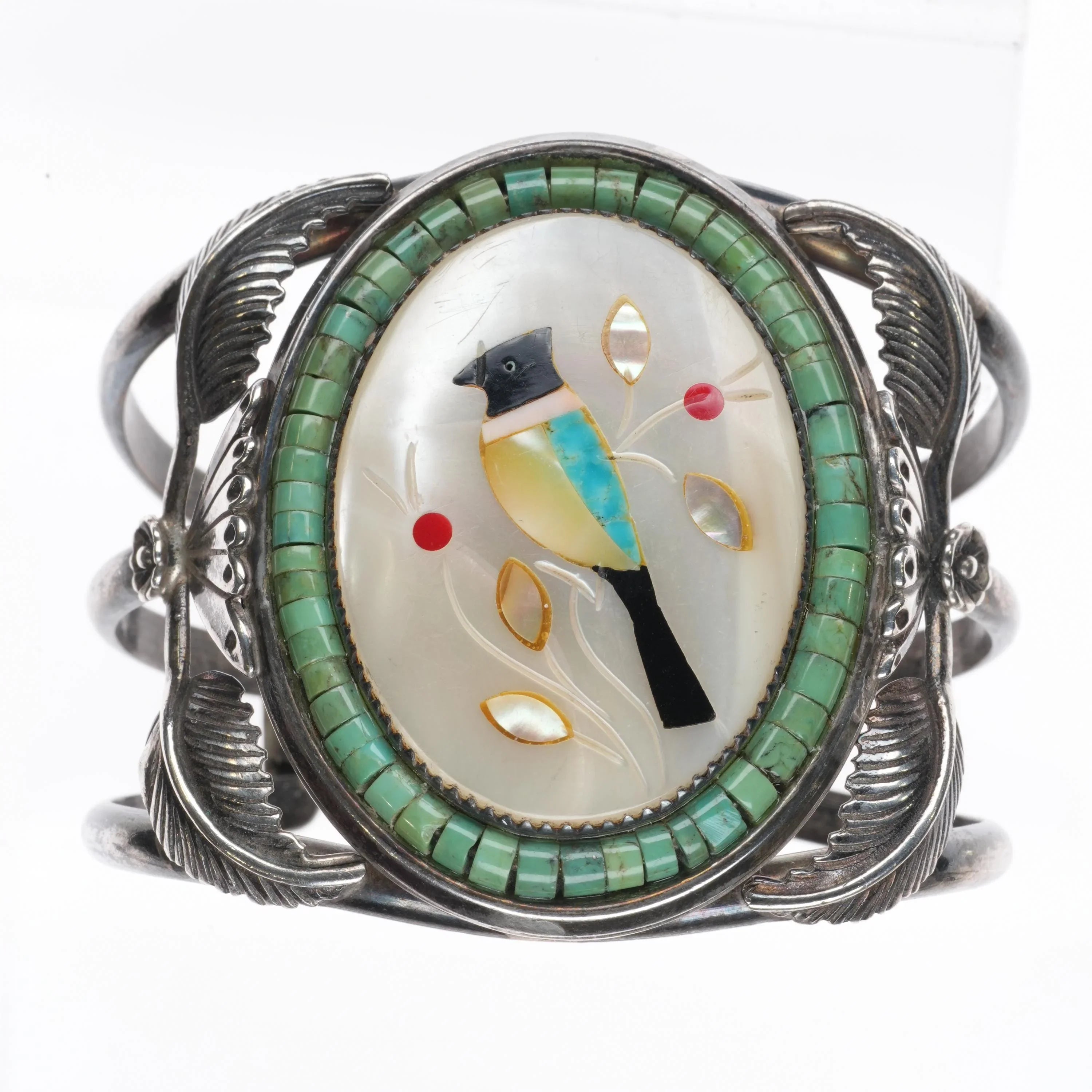 6.25" 60's-70's Zuni sterling silver Bird inlay Turquoise Heishi cuff bracelet