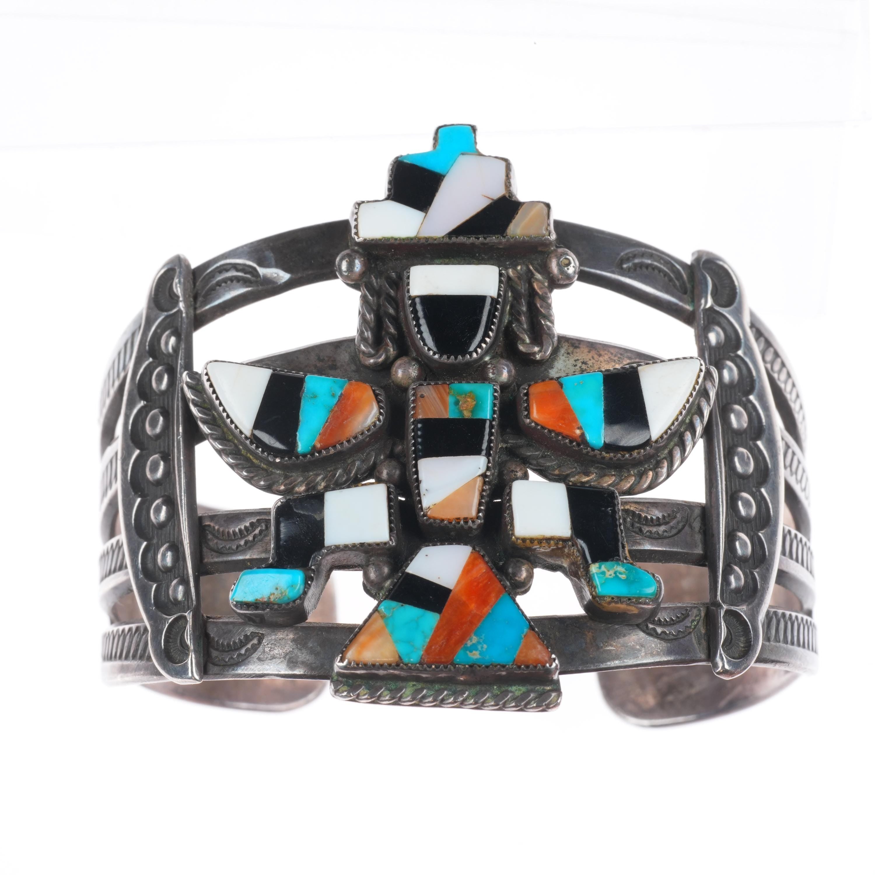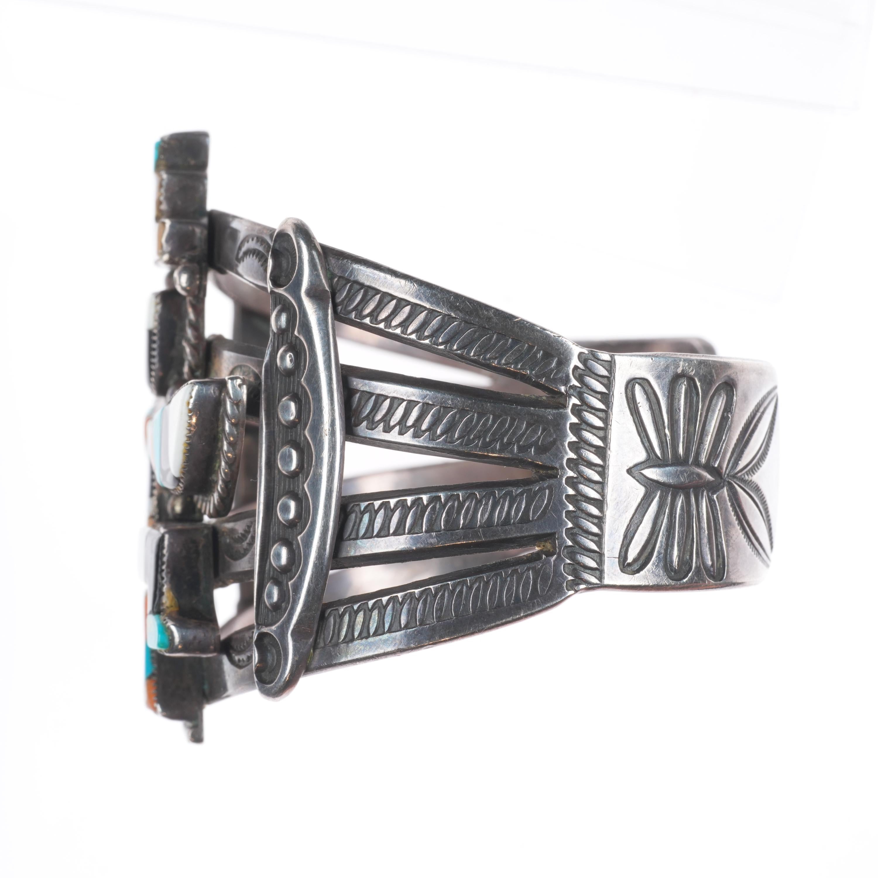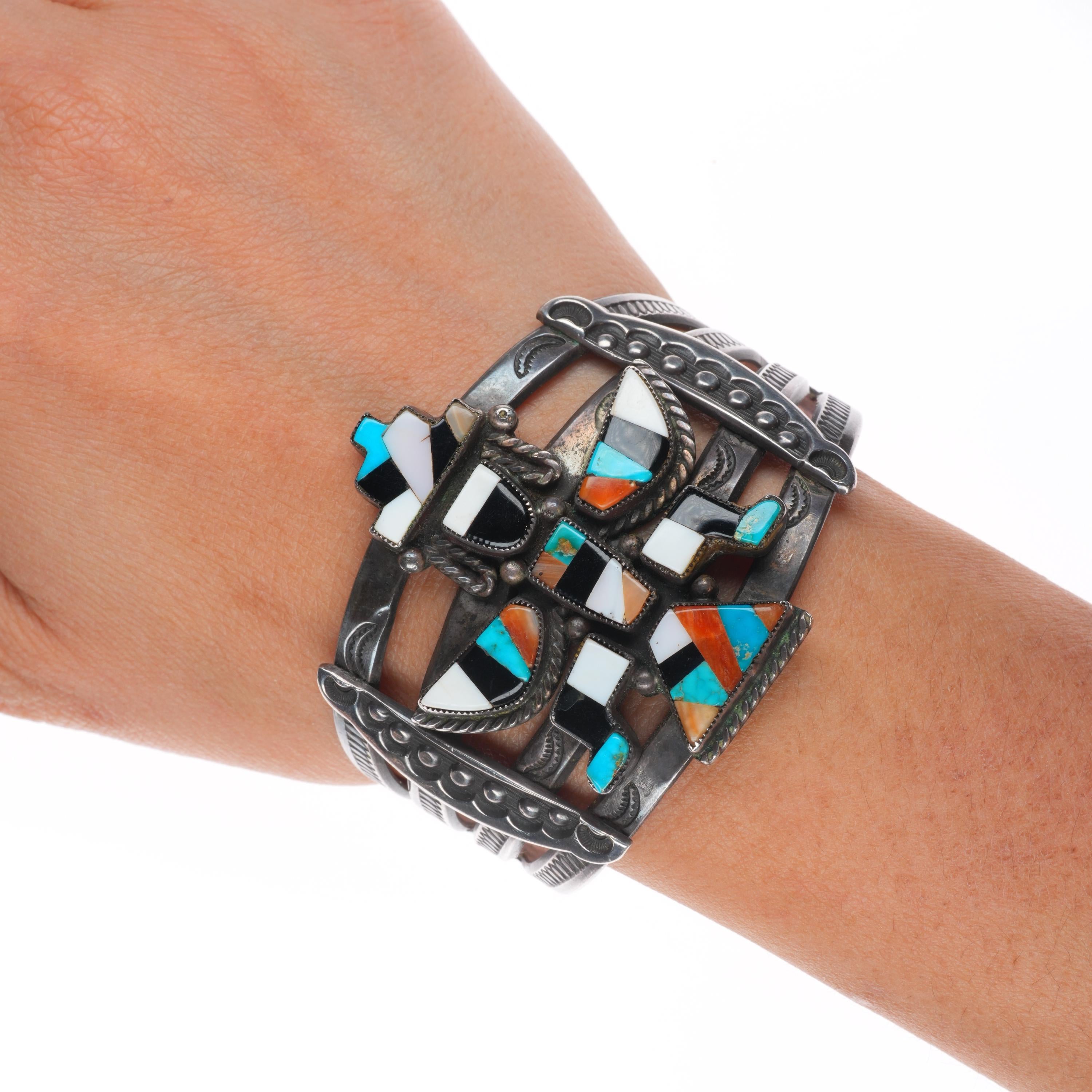 6.25" c1940‘s Zuni sterling silver multi-stone inlay knifewing cuff bracelet. Tested and guaranteed solid sterling silver with weight and measurements in pictures. Circa second quarter of the 20th century with age appropriate wear..