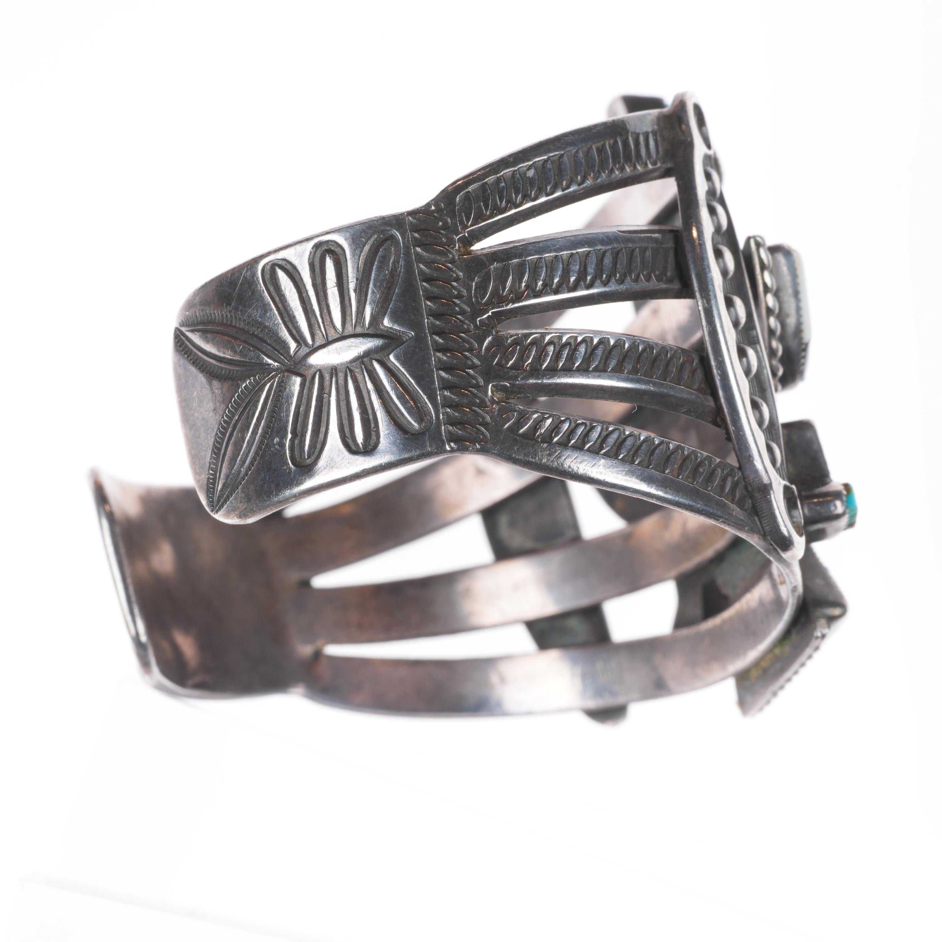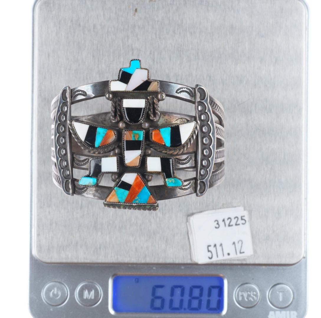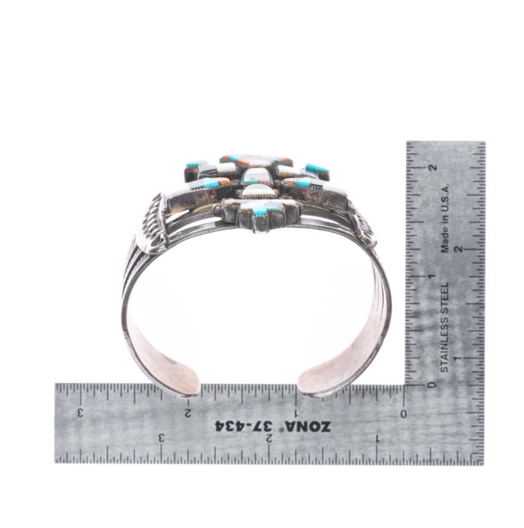 6.25" c1940‘s Zuni sterling silver multi-stone inlay knifewing cuff bracelet. Tested and guaranteed solid sterling silver with weight and measurements in pictures. Circa second quarter of the 20th century with age appropriate wear..