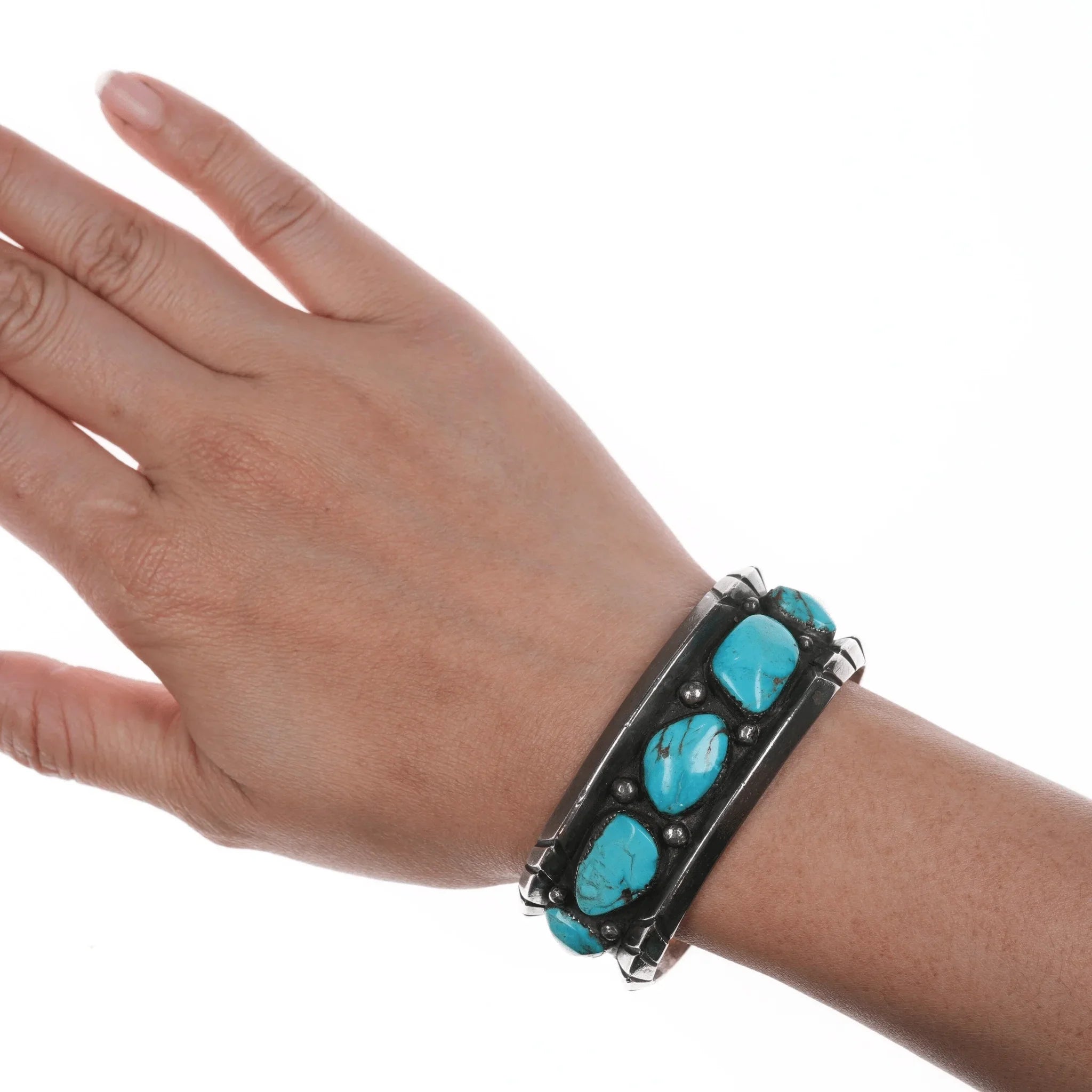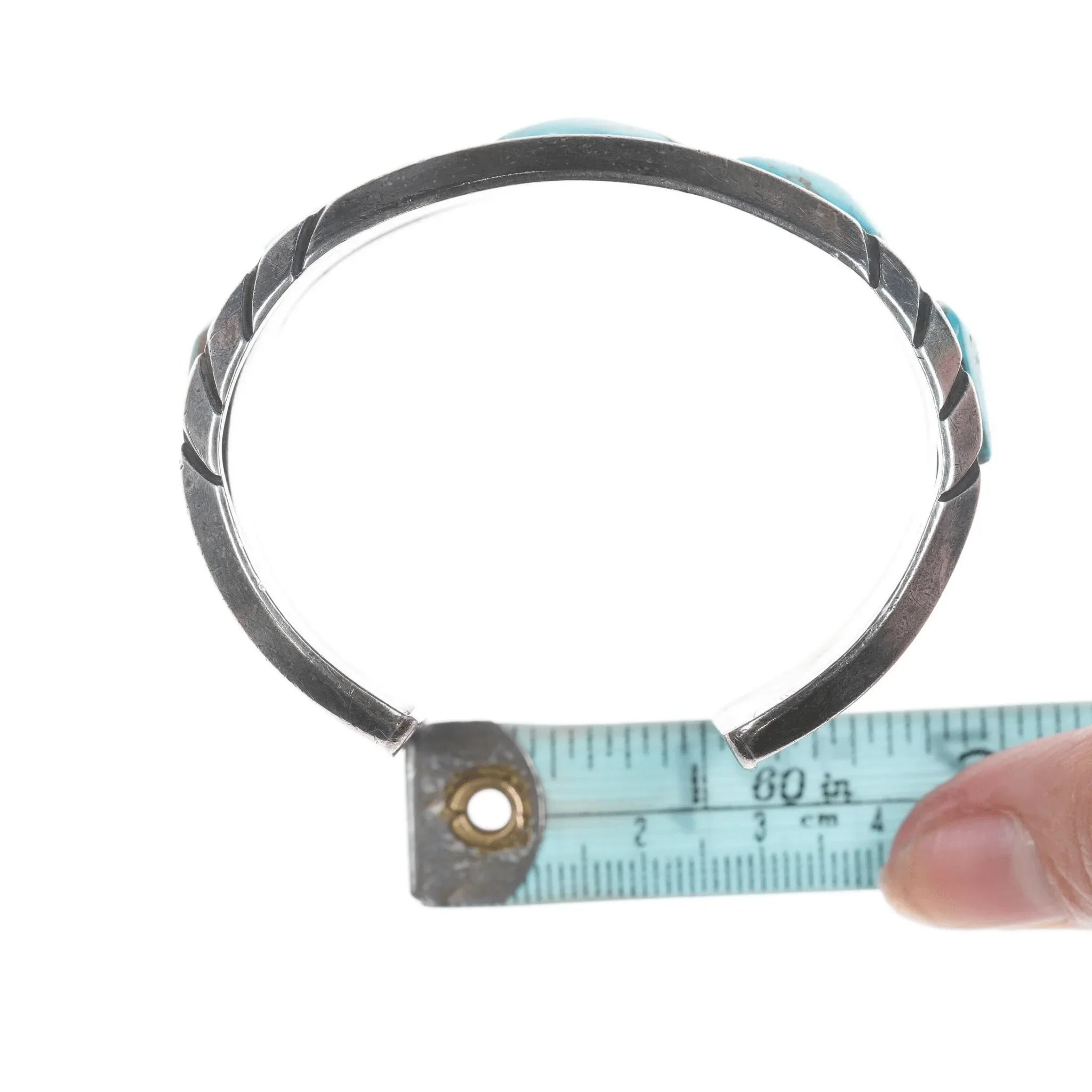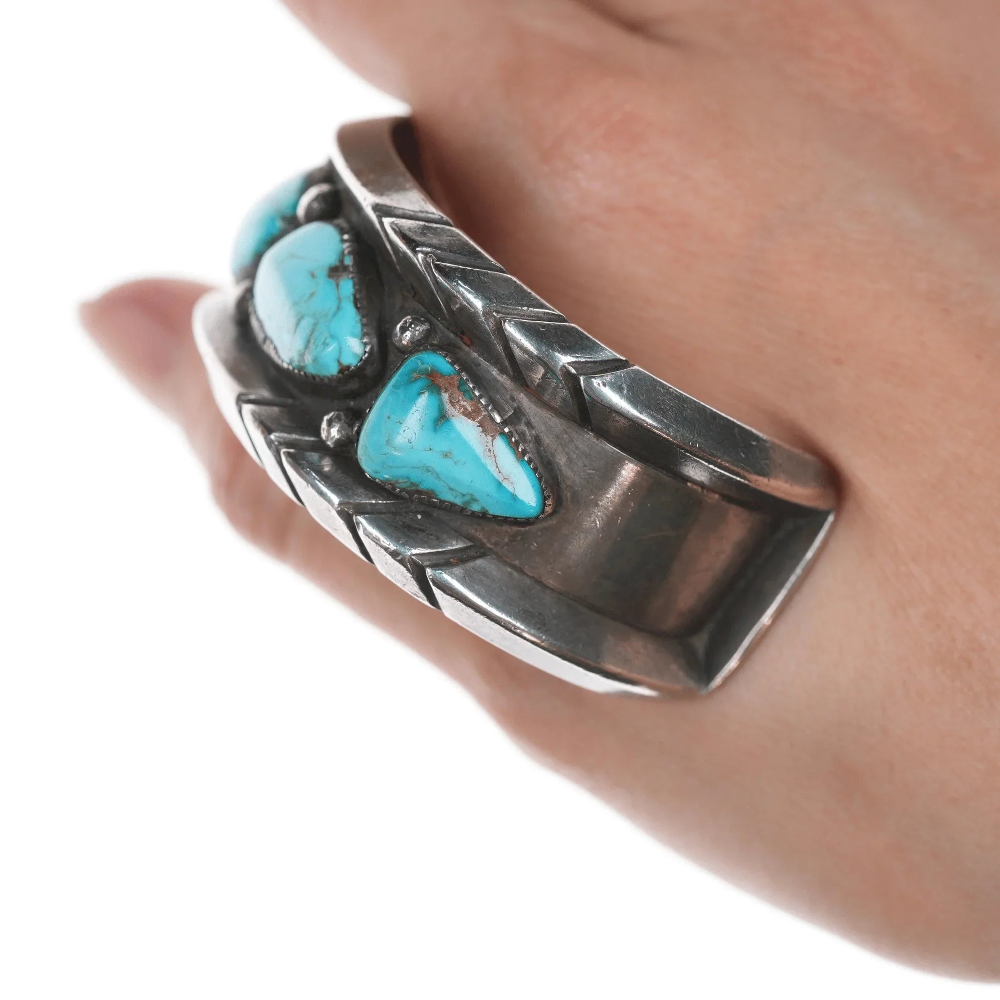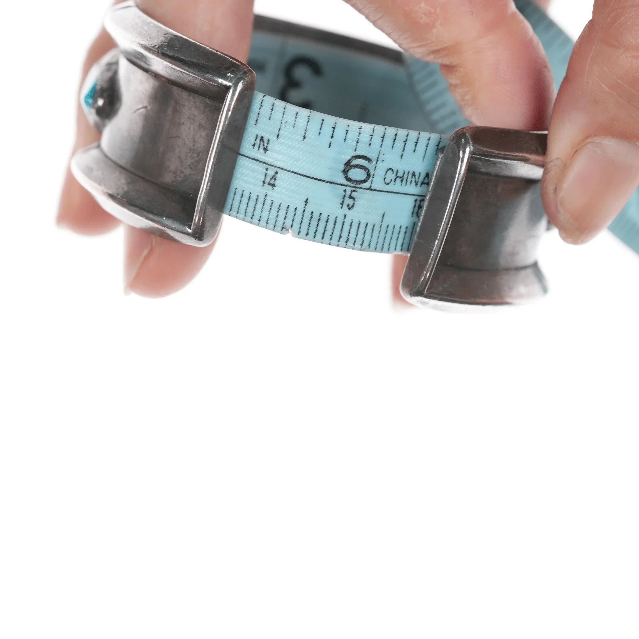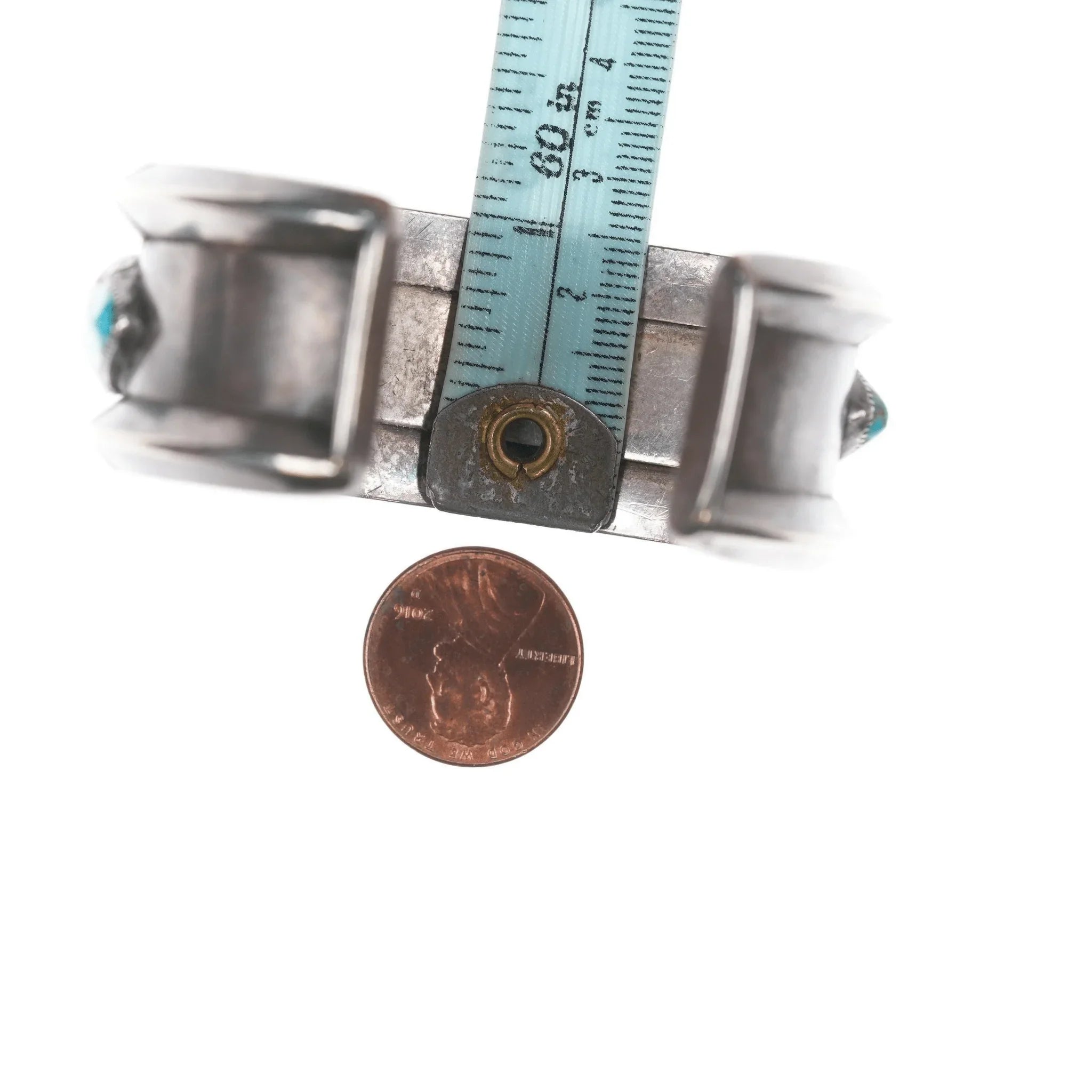 6.25" c1950's-60's Navajo silver cuff bracelet with turquoise<br><br>Marked or unmarked as shown in pics, weight and other measurements in pics. Sorry but my jewelry is stored in a secure location and cannot be accessed for more pictures,<br>videos, or measurements until sold. If you look at pictures/description your<br>question should be answered. Thank you so much for your time and consideration!<br><br>All precious metals are tested and guaranteed. A Native American jewelry piece referred to as "silver" or "ingot" is guaranteed to be at least 90% silver. Bracelets are photographed on a 6" women's wrist.