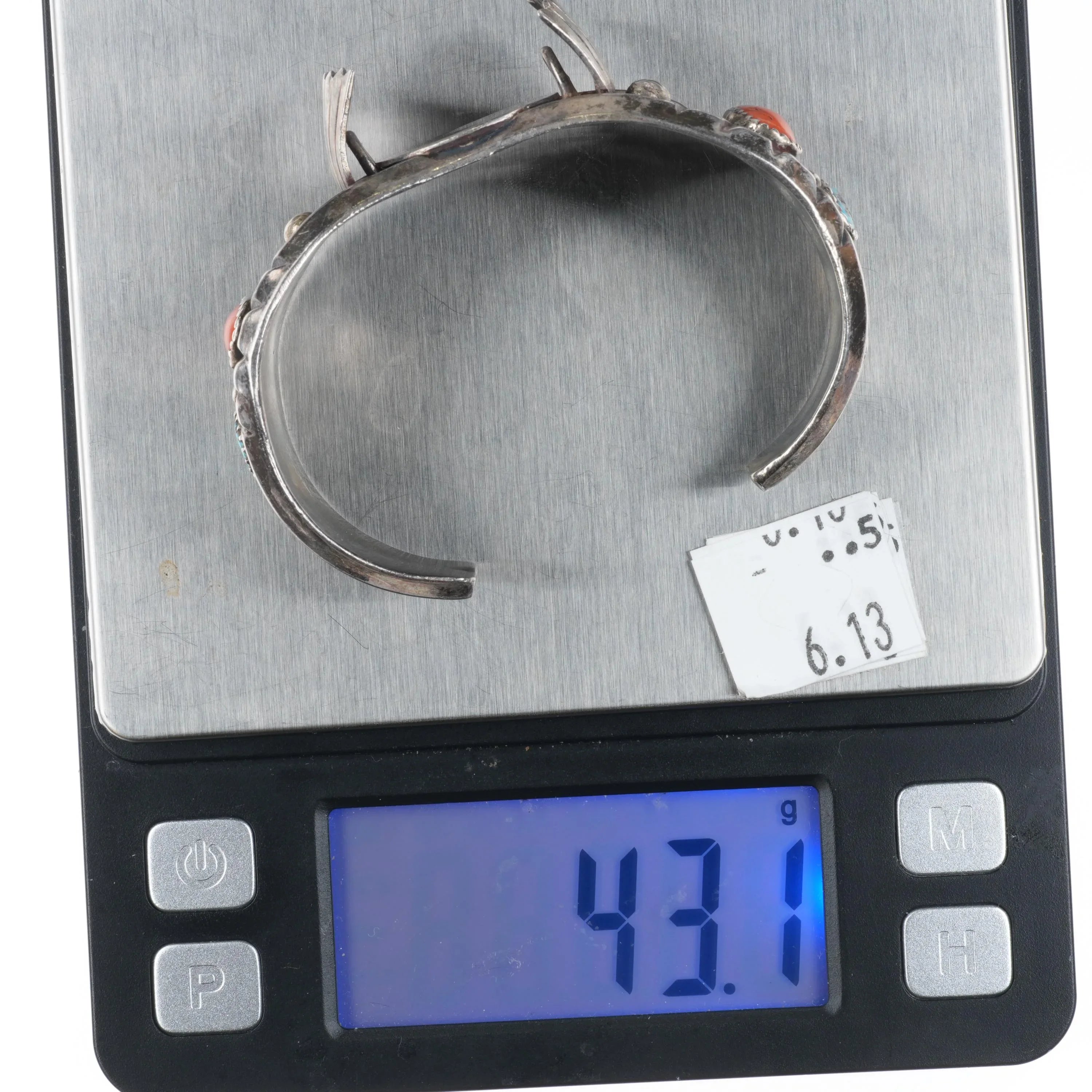 6.25" Gilbert Ortega Navajo sterling silver-turquoise, coral watch cuff bracelet