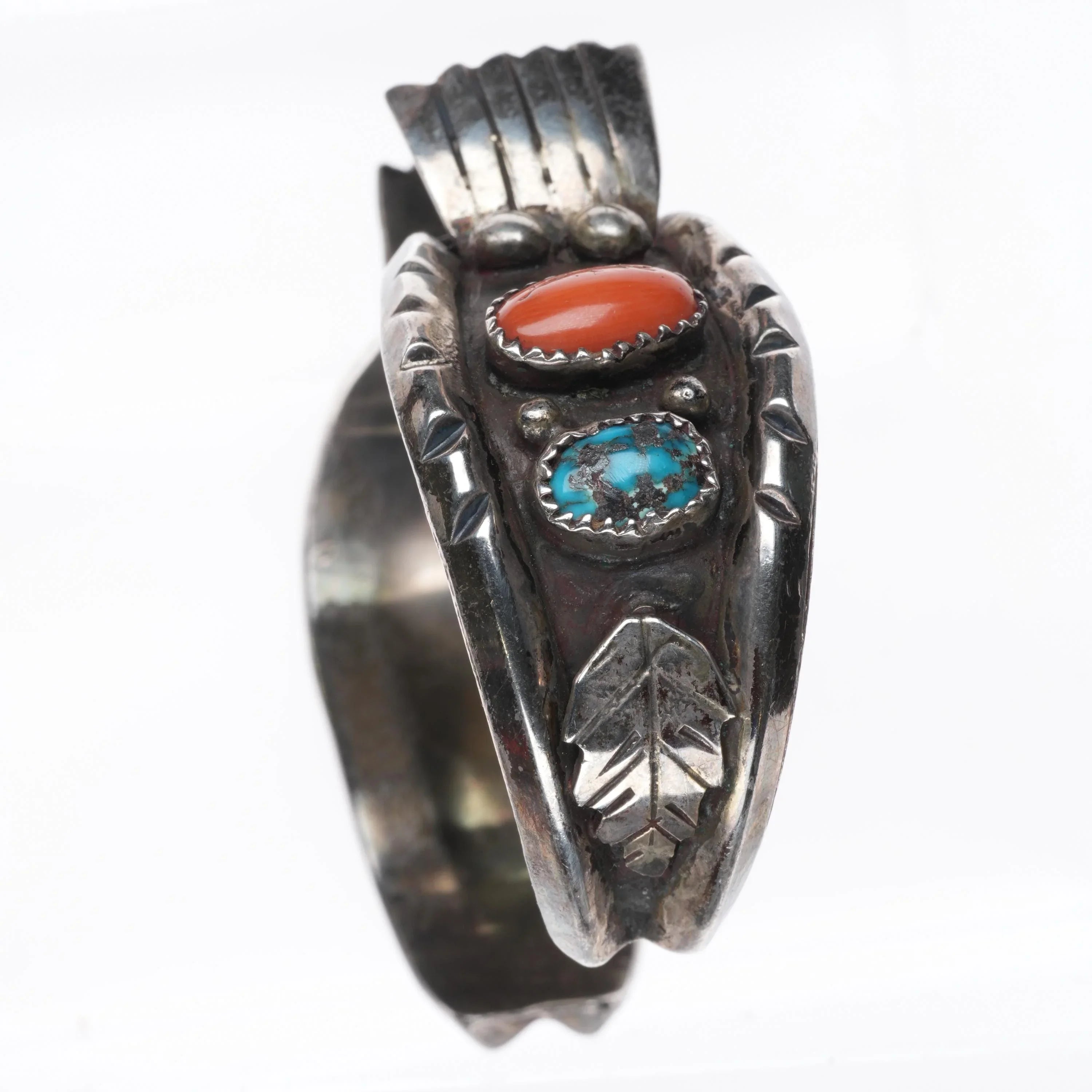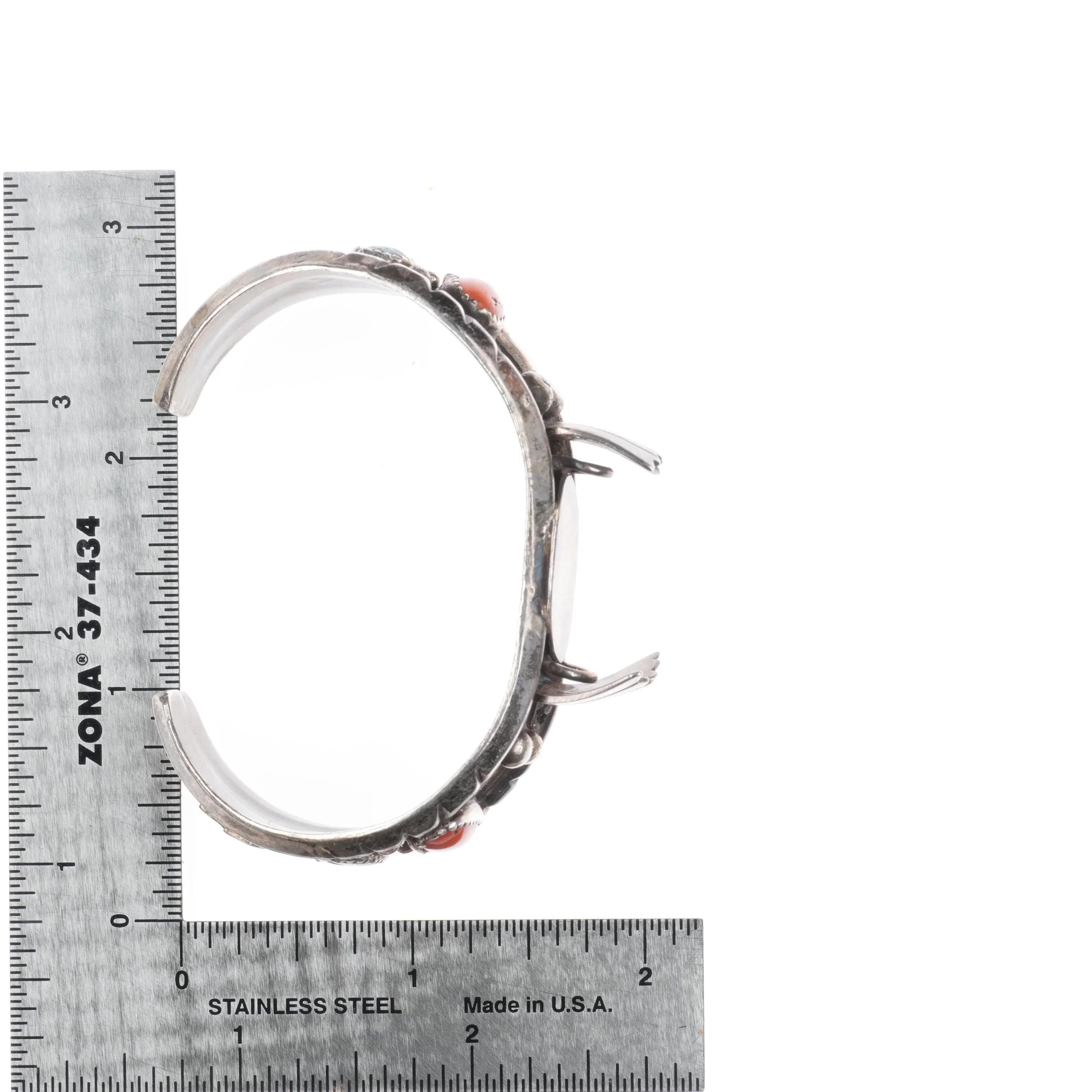6.25" Gilbert Ortega Navajo sterling silver-turquoise, coral watch cuff bracelet. Selling the watch cuff shown, tested and guaranteed solid sterling silver, circa third quarter of the 20th century. Measurements in pictures.
