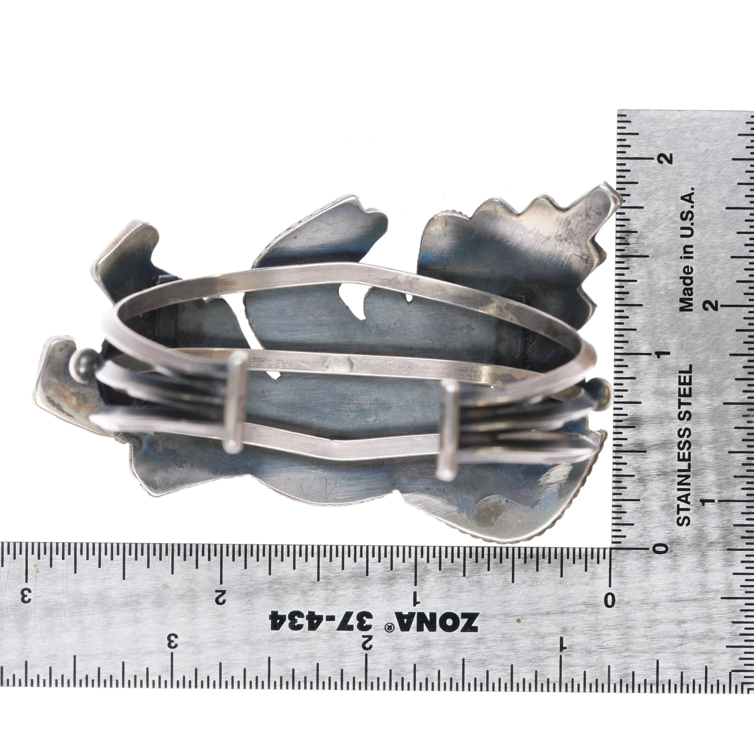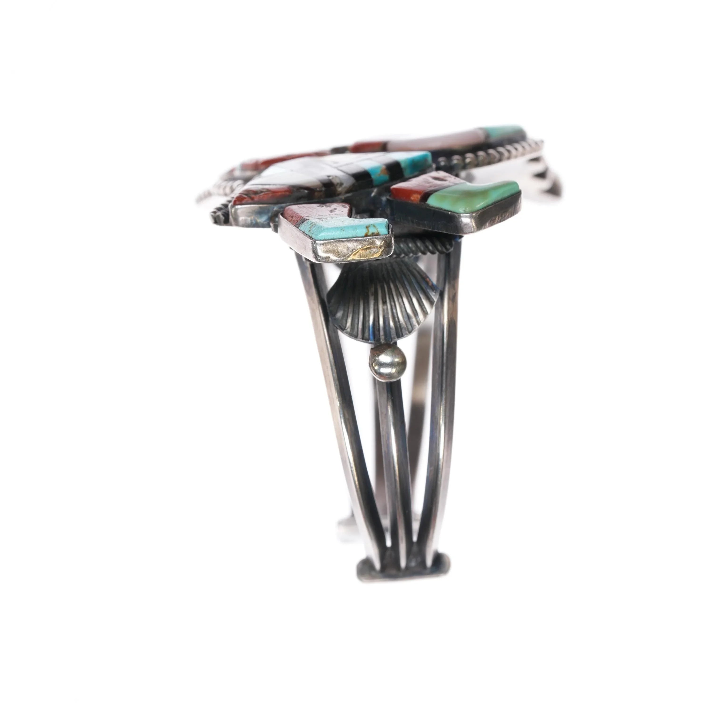 6.25" Henry Morgan Navajo sterling vintage Zuni inlay dancer cuff bracelet. Solid sterling silver. Will fit up to a 6.5" wrist, gap size and other measurements in pictures. Nice, well made bracelet in good condition with no apparent issues. Appears unworn.