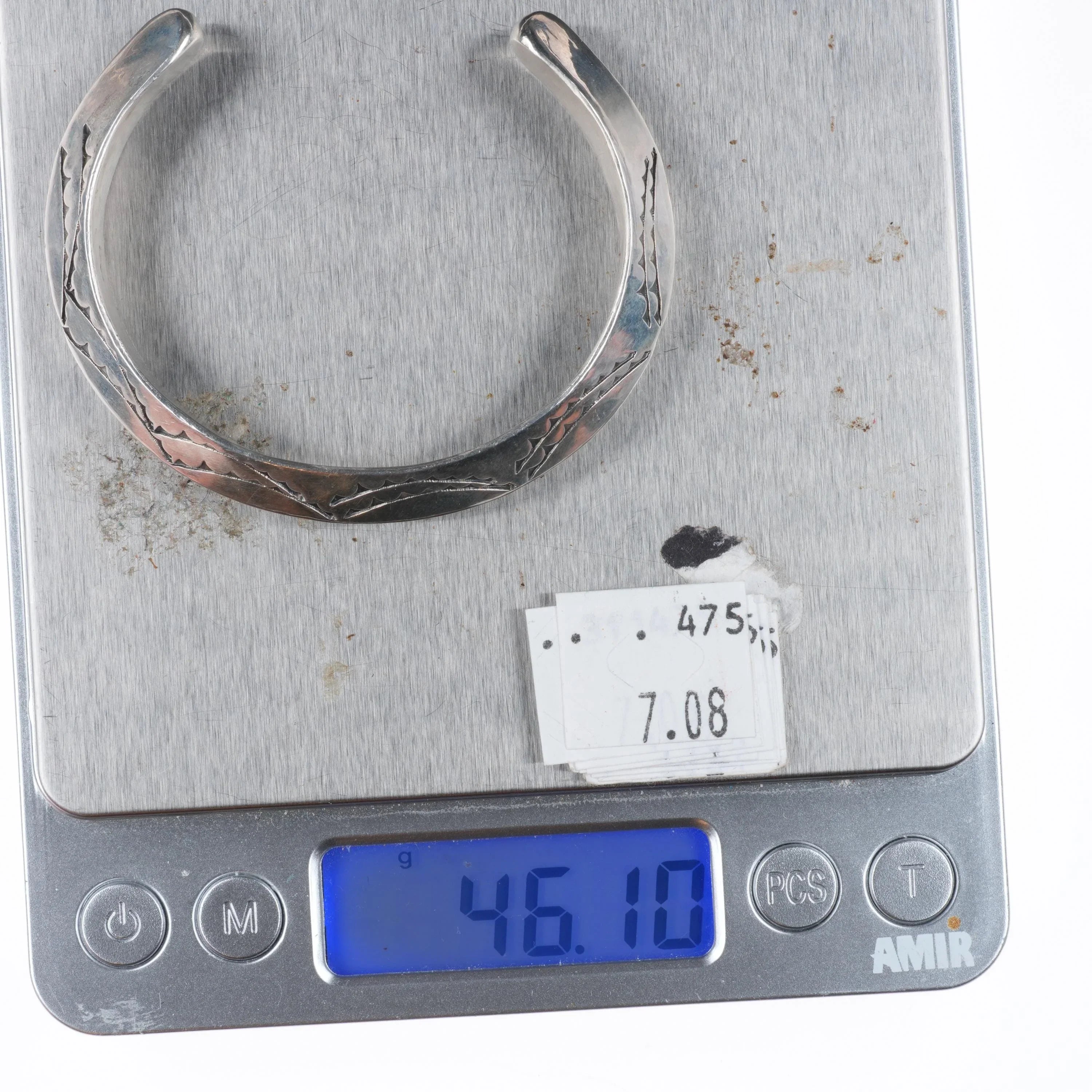 6.25" Vintage Navajo hand stamped carinated sterling silver cuff bracelet. Tested and guaranteed solid sterling silver with weight and measurements in pictures. Good condition, circa third quarter of the 20th century with no damage. Unmarked.