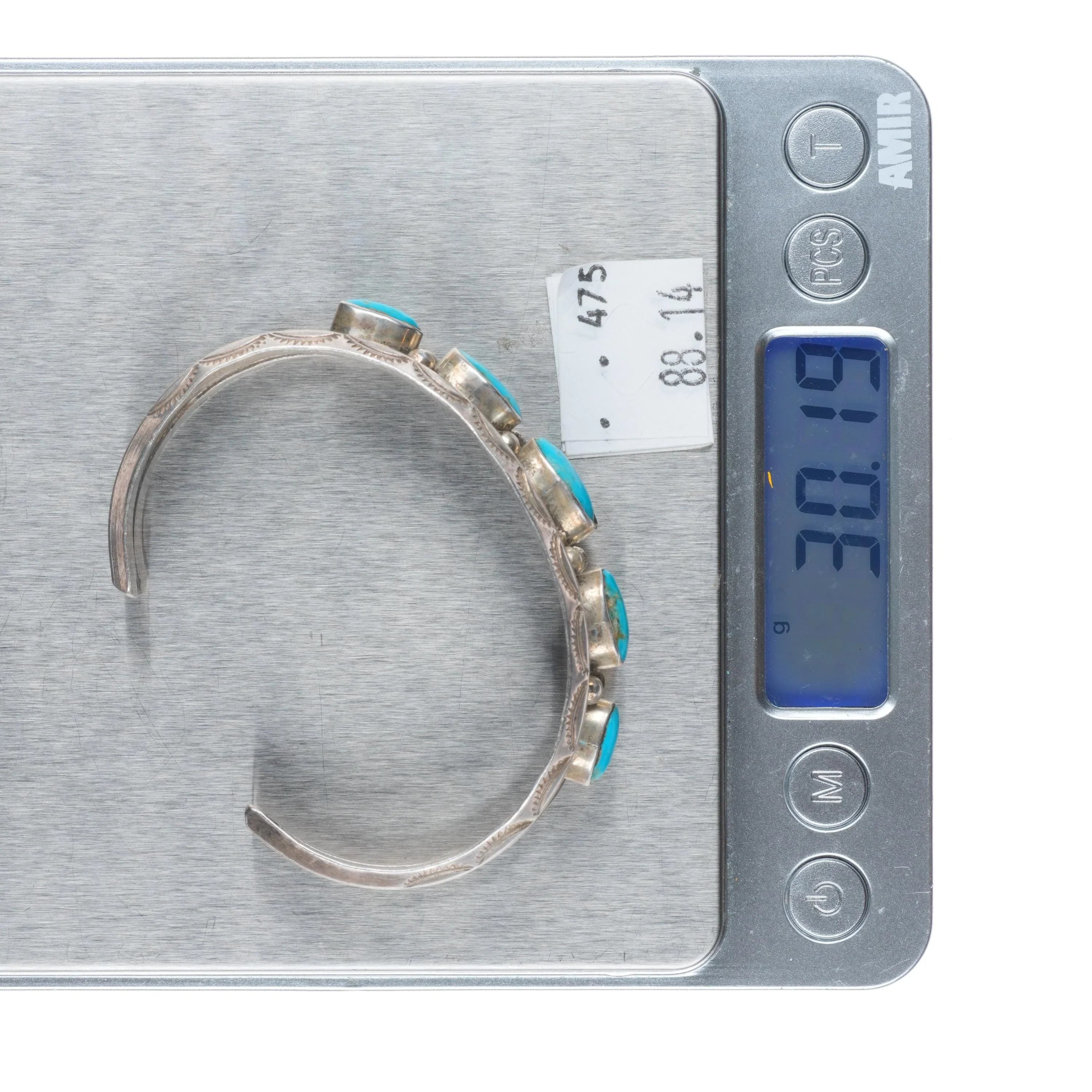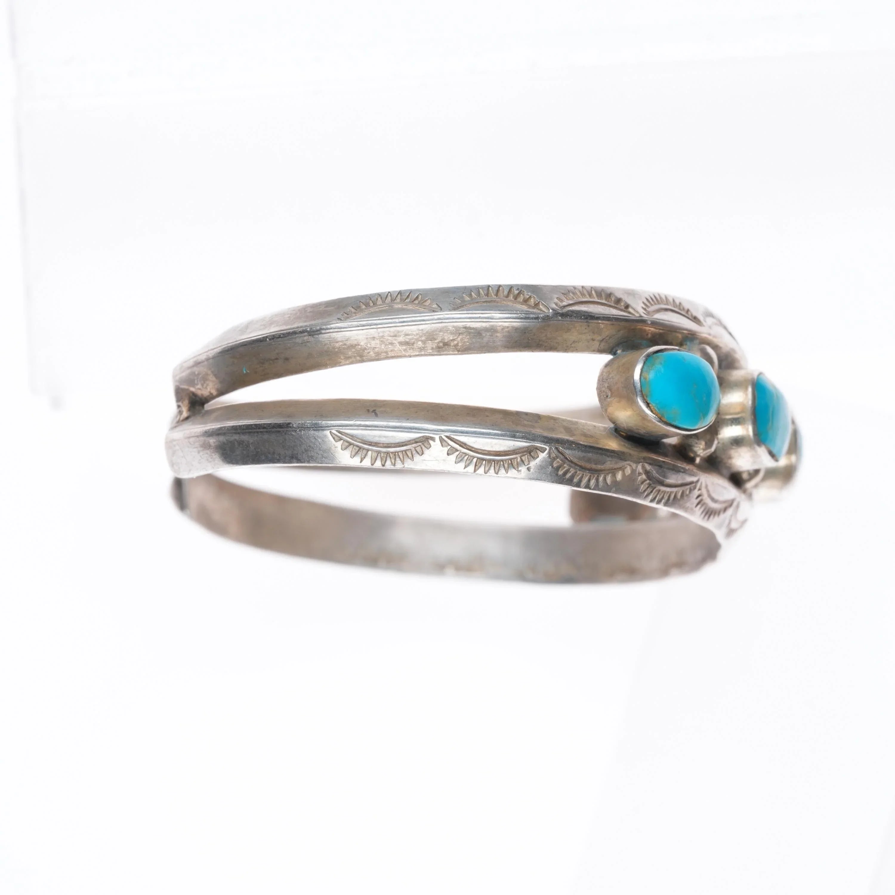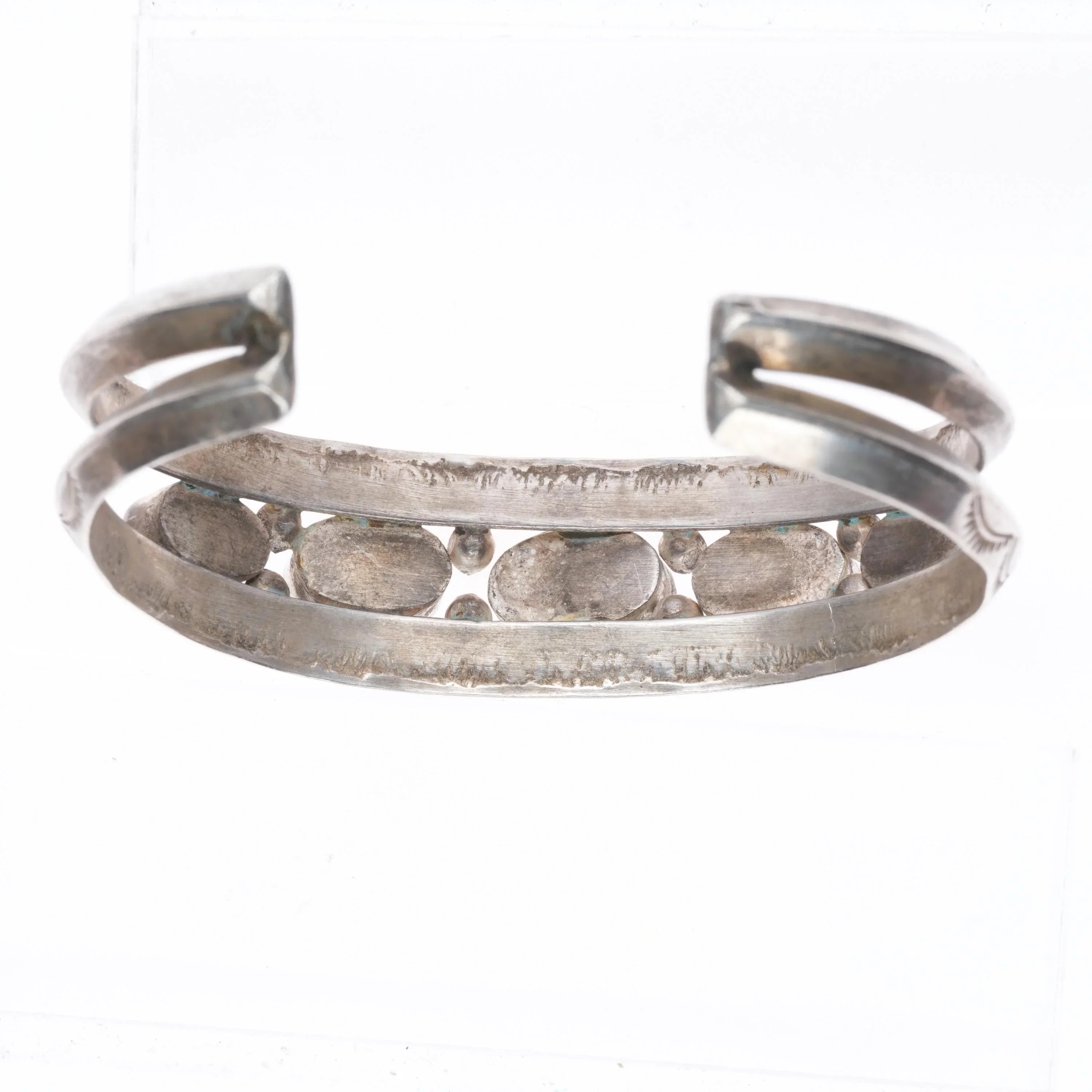 6.25" Vintage Navajo hand stamped turquoise row cuff bracelet sterling silver. Tested and guaranteed solid sterling silver with weight and measurements in pictures. No damage or significant wear, circa third quarter of the 20th century.