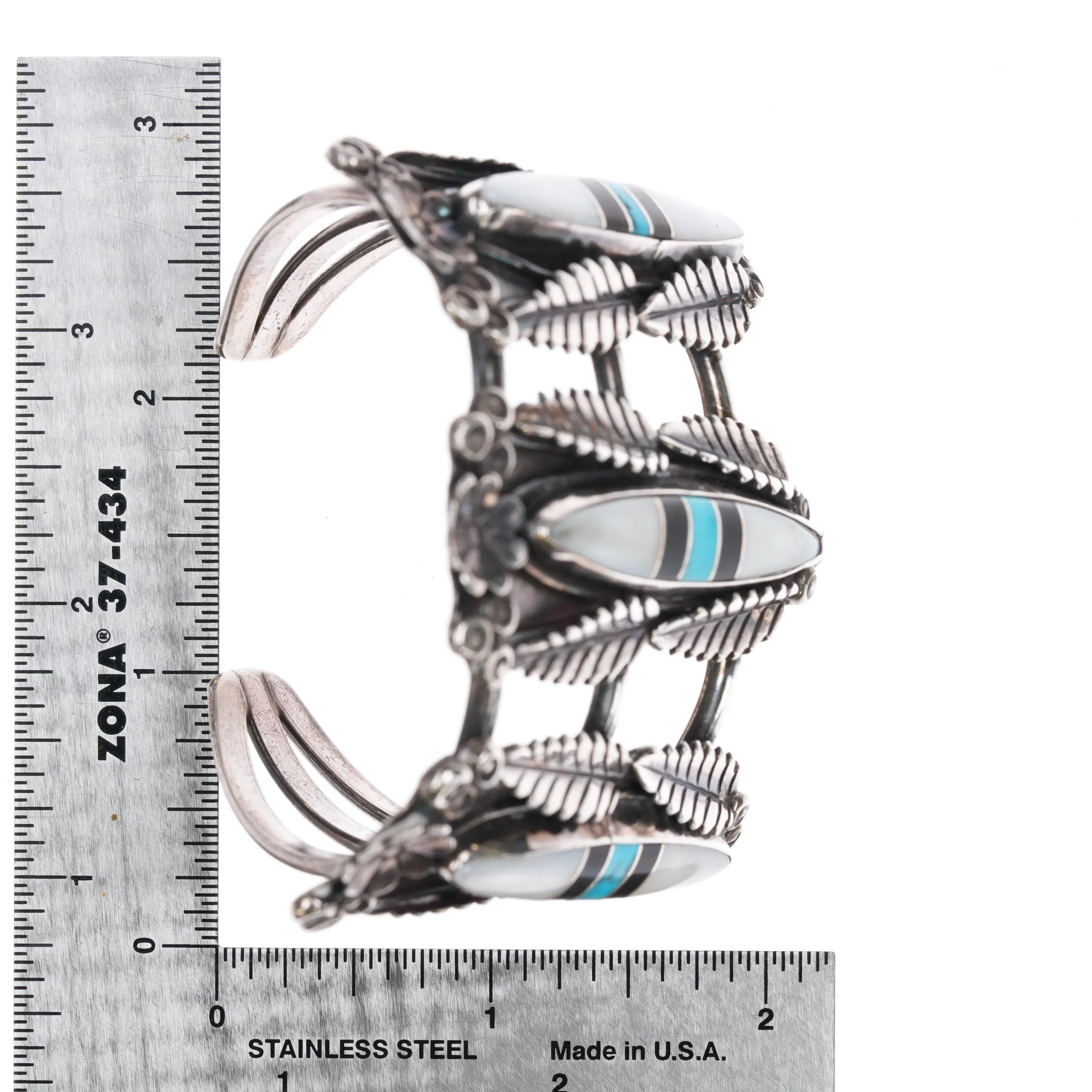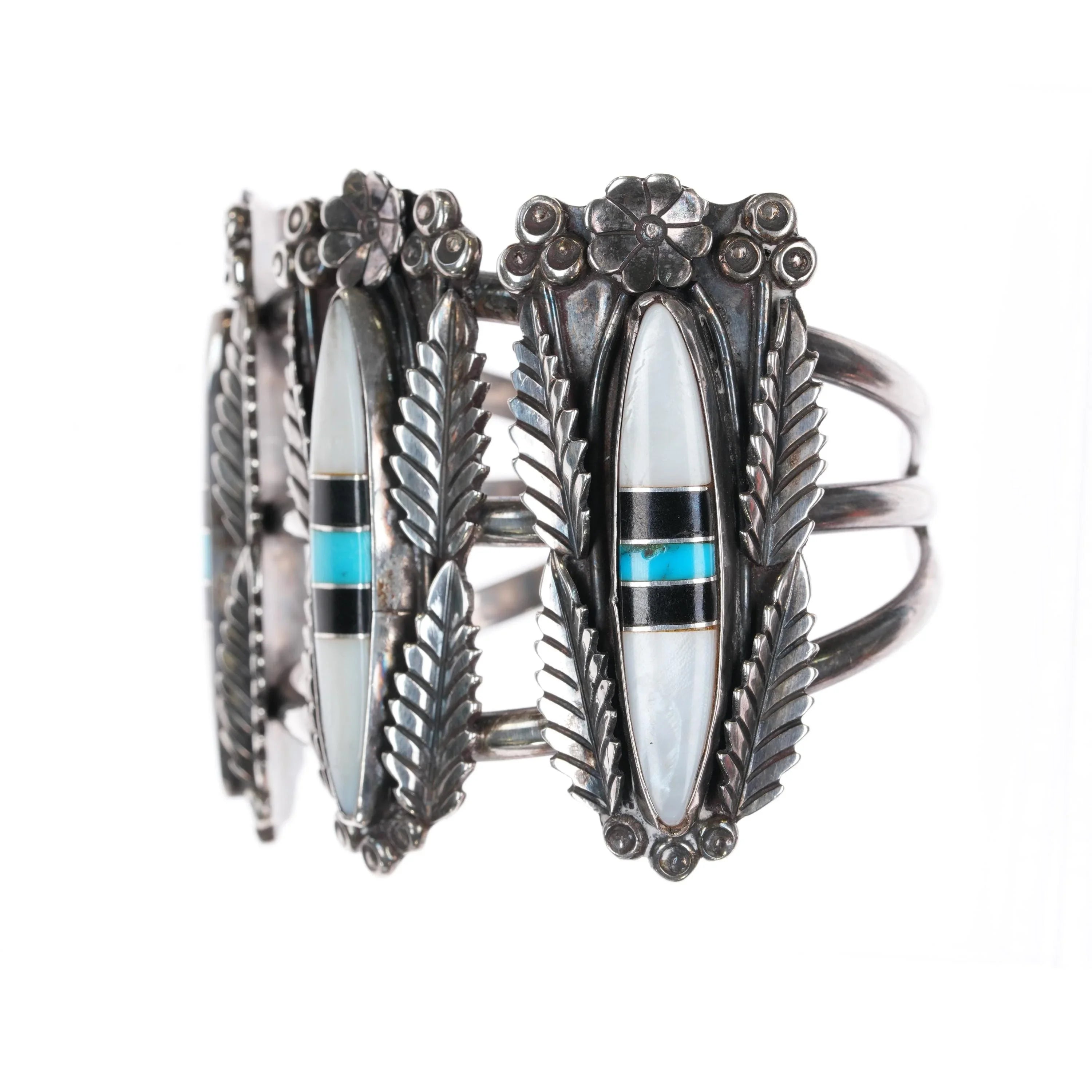 6.25" Vintage Zuni large silver three row channel inlay cuff bracelet