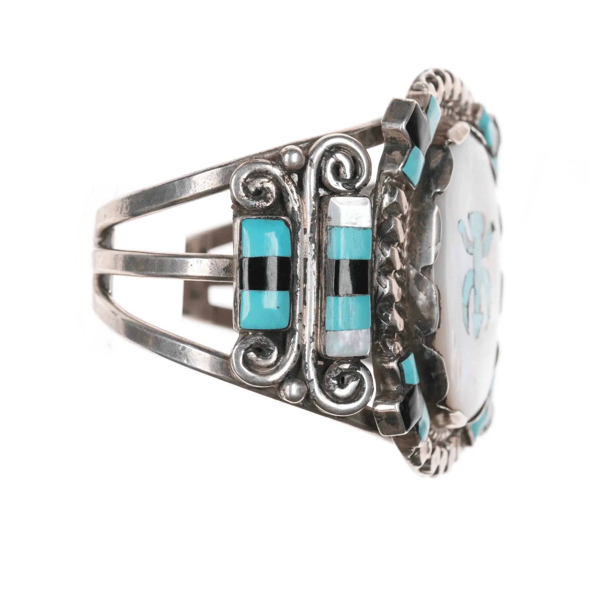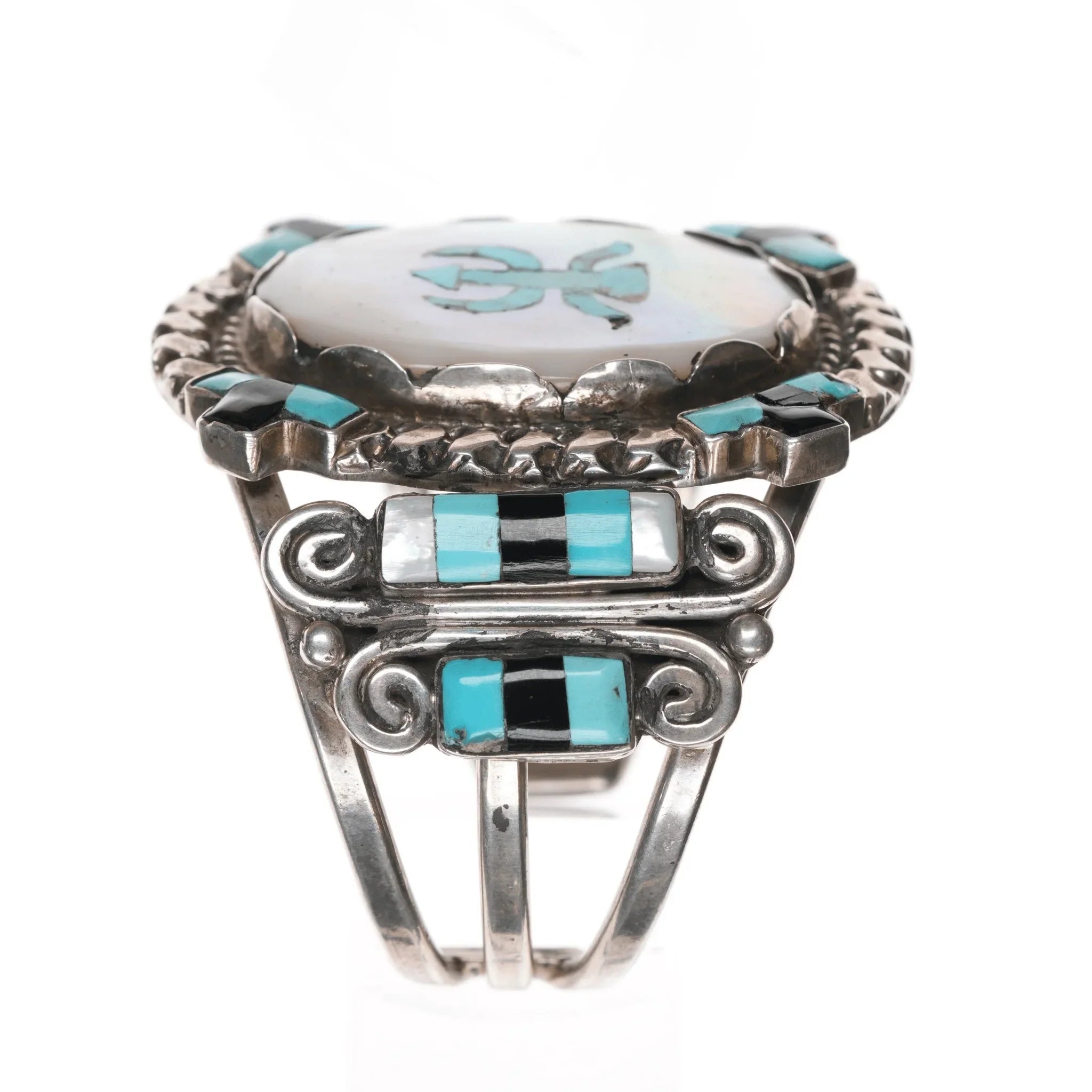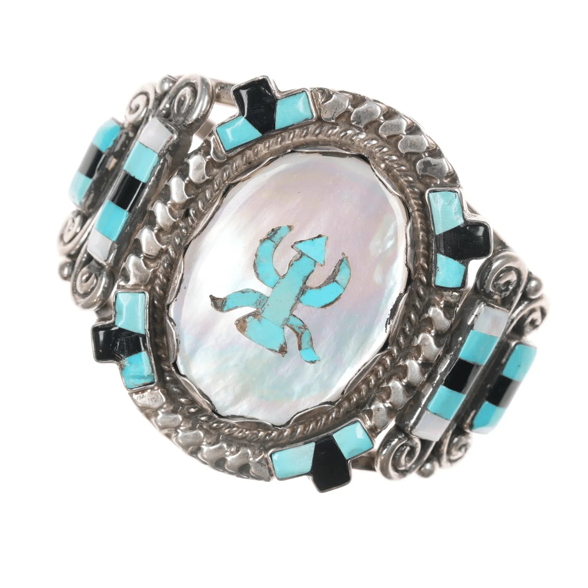 6.25" Vintage Zuni Sterling MOP, turquoise, and jet cuff bracelet