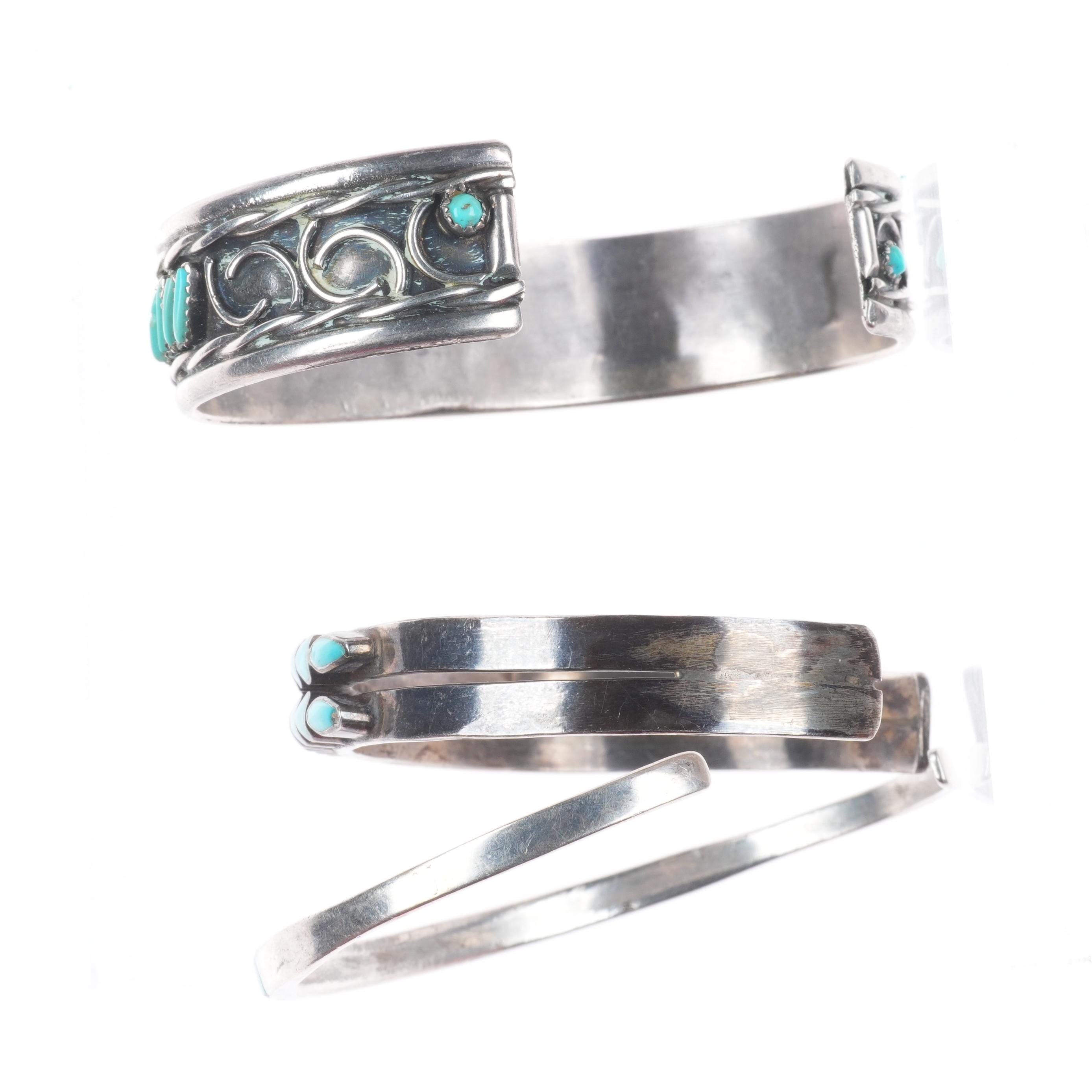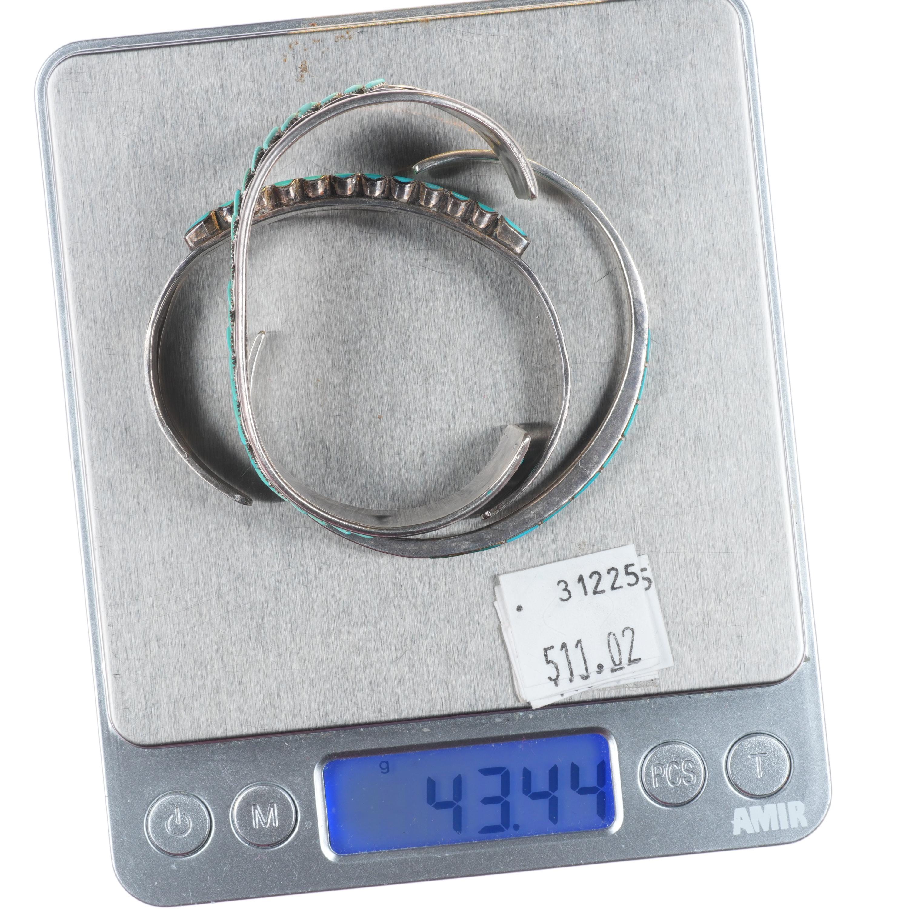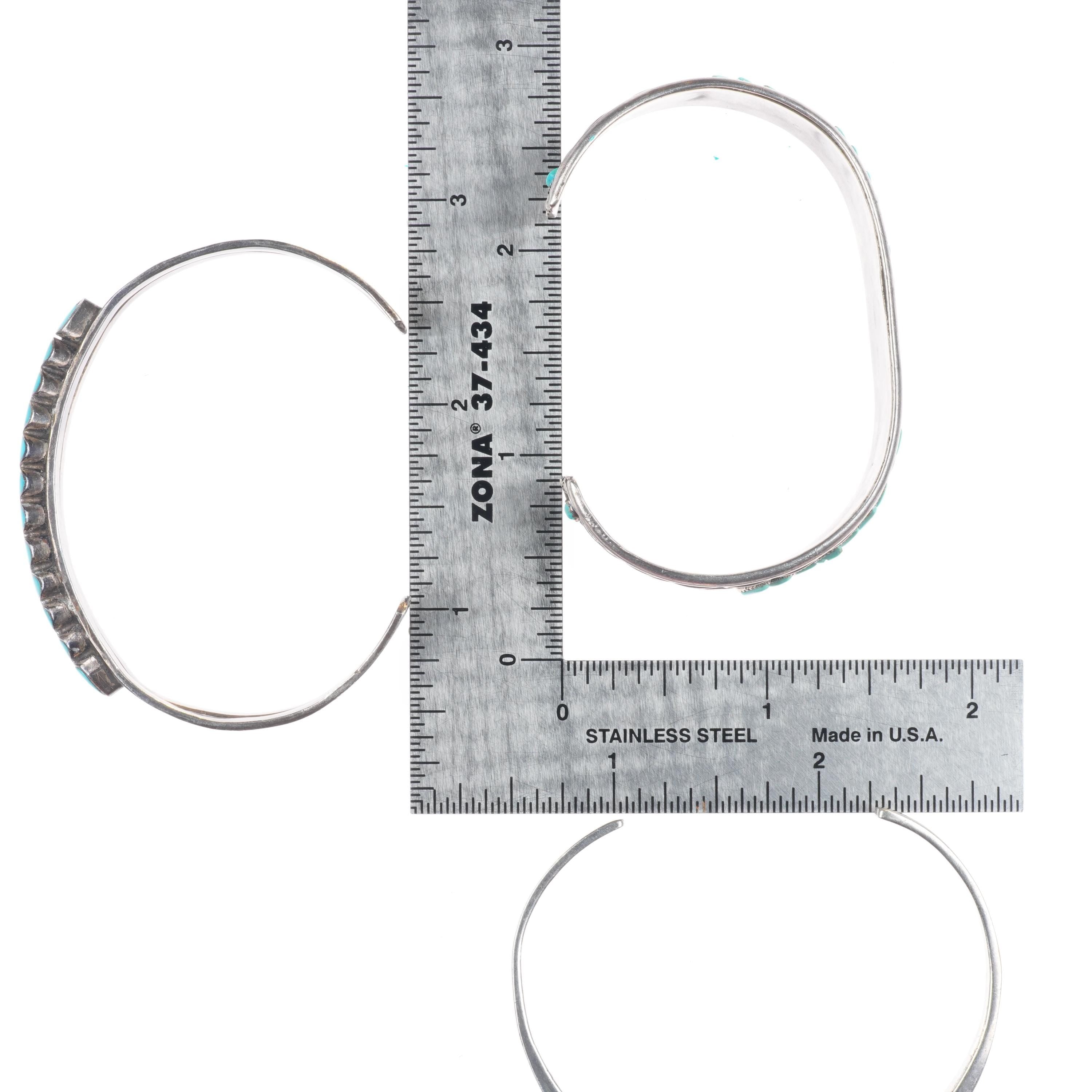 6.25" Vintage Zuni sterling silver turquoise inlay/needlepoint cuff bracelets. Tested and guaranteed solid sterling silver with weight and measurements in pictures. Circa mid 20th century with age appropriate wear.. Selling all three.