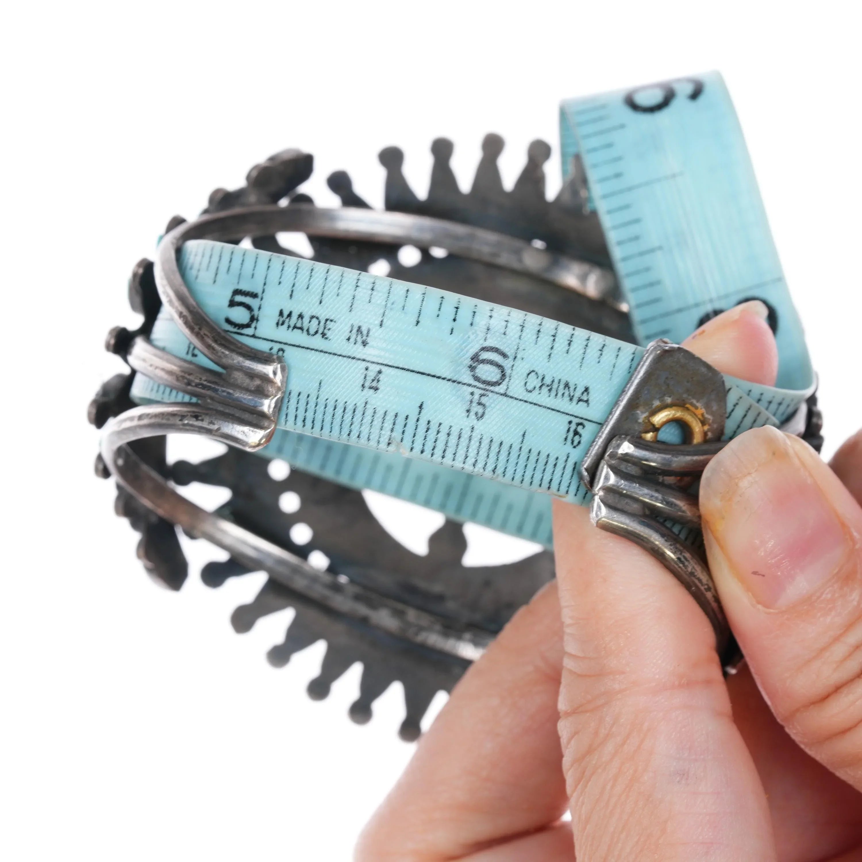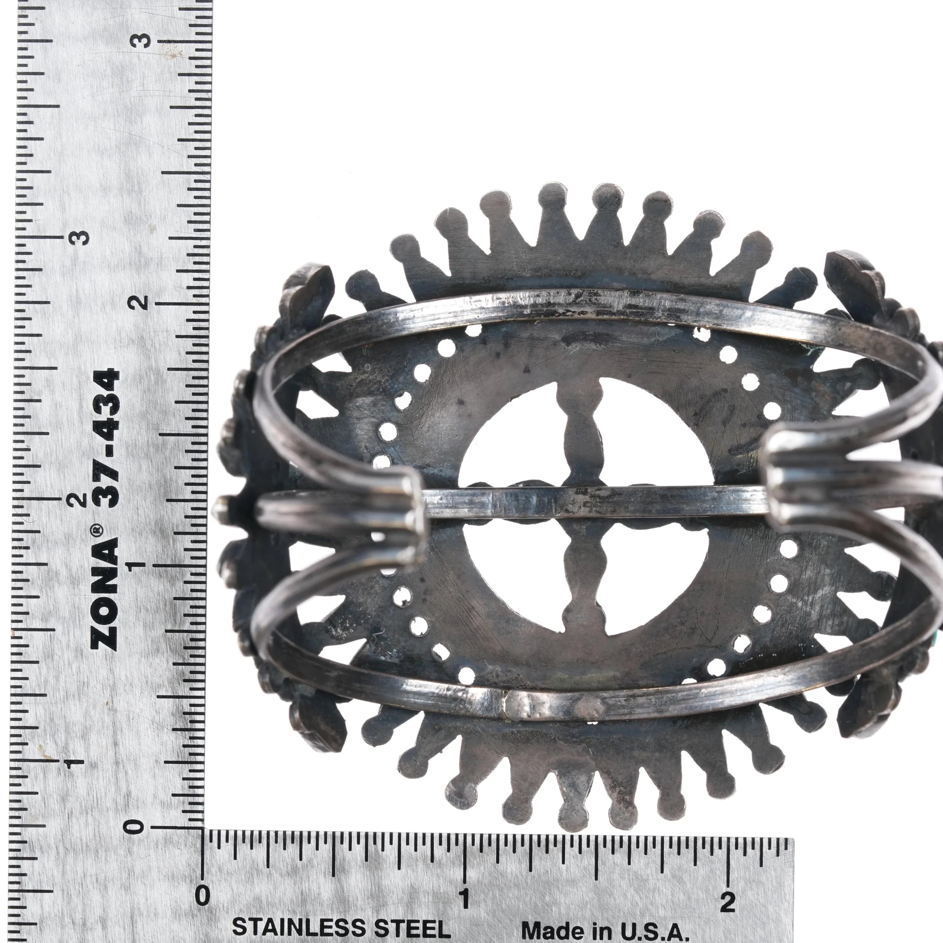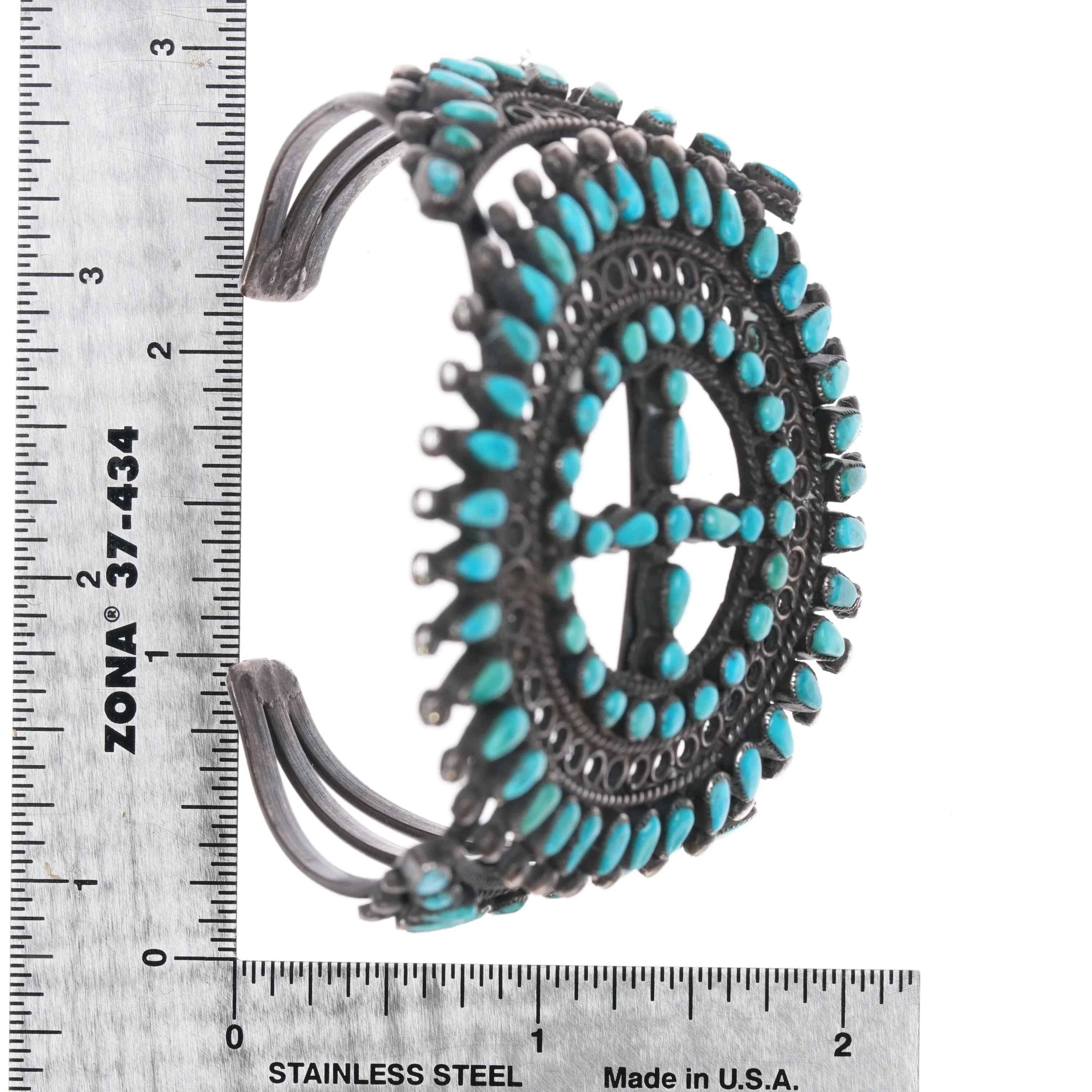 6 3/8" c1950‘s Zuni silver natural turquoise snake eye petit point cuff bracelet. Solid sterling silver guaranteed, weight and measurement in pics. No damage, very nice turquoise. Well exectured, great design, etc.