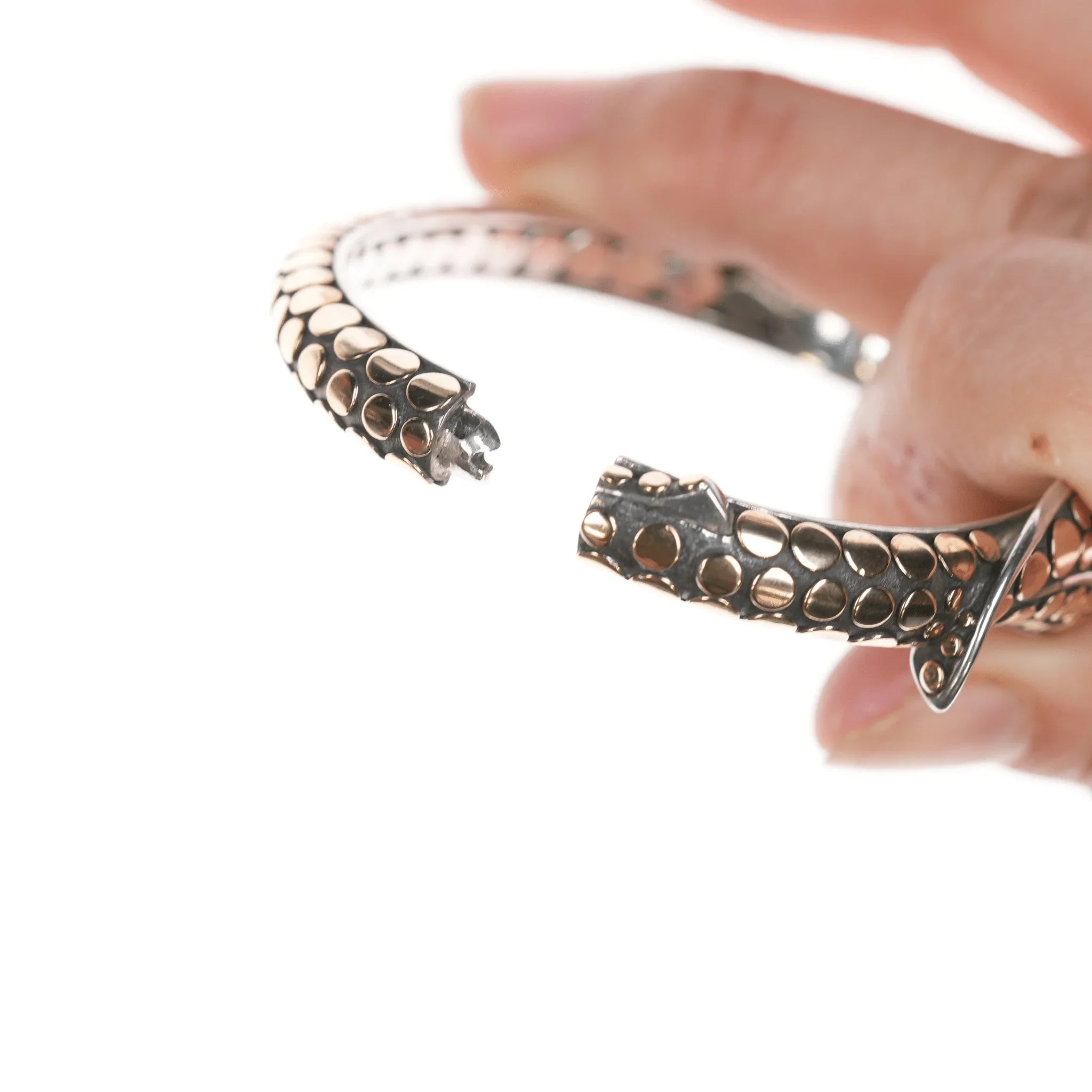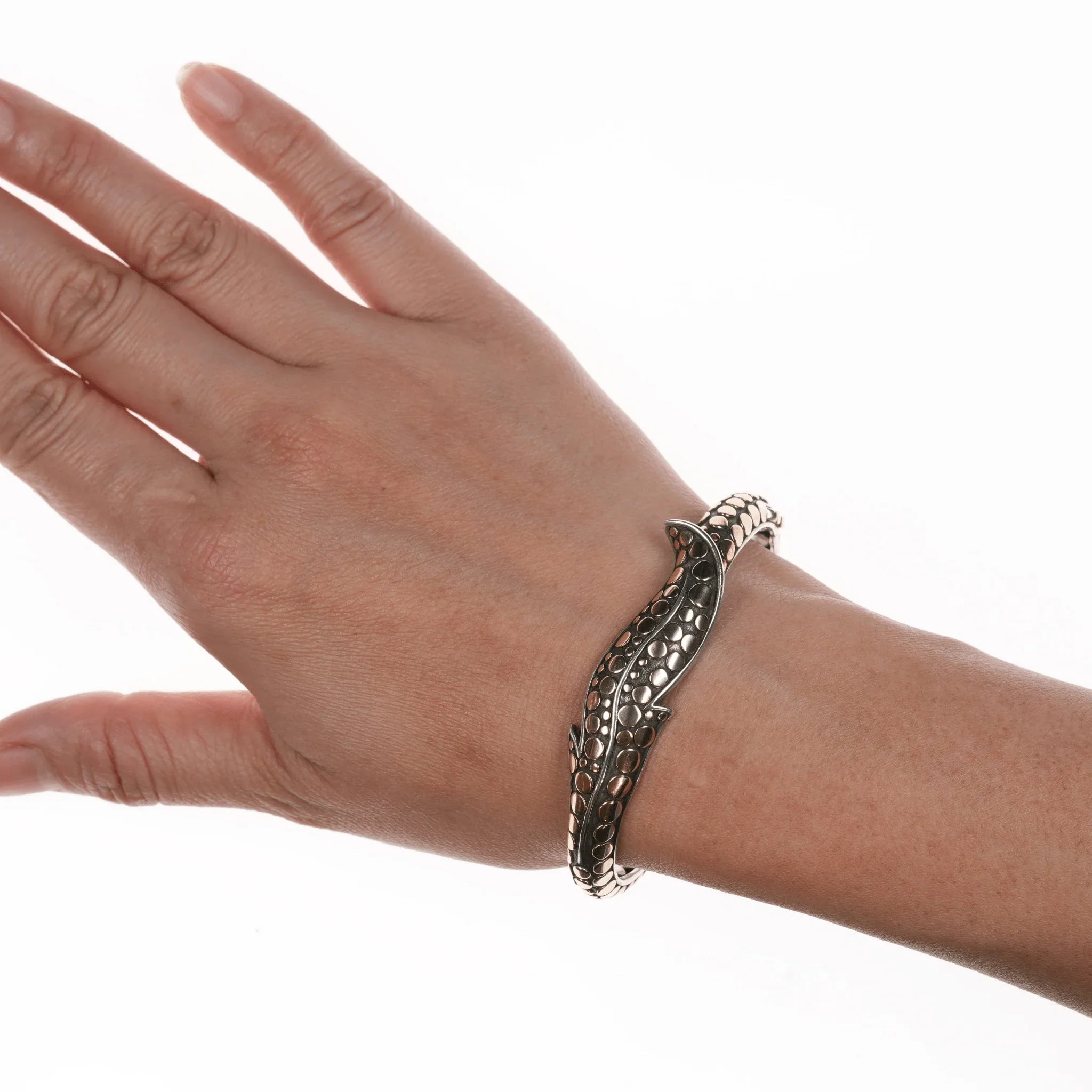 6 3/8" John Hardy 18k/Sterling Ayu Dot Bangle. Guaranteed Authentic, super clean with no issues. <br><br>About John Hardy<br><br>Inspired by Bali and its time-honored jewelry-making traditions, John Hardy’s<br>artisan collective was founded in 1975 with a dedication to handcrafted jewelry.<br>We are committed to sustainable luxury business practices, our craftspeople and<br>the preservation of Bali. We pride ourselves on the value of authenticity; it is<br>the soul of community that makes each piece truly one of a kind.<br><br>WE ARE ARTISANS<br>One of the largest employers on the island of Bali, the John Hardy Workshop &<br>Kapal Bamboo Boutique employs over 500 multi-generational craftspeople, from<br>watercolor artists to metalsmiths. Dedication to heritage artistry not only<br>defines the John Hardy legacy, it retains artisan families that craft jewelry<br>through meditative, communal chain-weaving, hand-hammering and carving.<br><br>WE ARE COMMUNITY<br>We are fueled by the spirit of togetherness and dedicate ourselves to the<br>artisans whose deep connection to Bali inspires the foundation of our Workshop &<br>Kapal Bamboo Boutique. We offer an apprenticeship program, Jobs For Life, that<br>provides vocational training and financial support to the citizens of Bali. Each<br>participant is given the opportunity to join the workshop, where we provide<br>locally sourced family-style meals to several-hundred workers––a gathering<br>ritual that both fosters a sense of community and attracts visitors.<br><br>WE ARE SUSTAINABLE<br>As a certified member of the Responsible Jewellery Council, and Kimberley<br>Process compliant, John Hardy is committed to codes of practice that ensure our<br>stones, diamonds and metals are conflict-free and ethically produced every step<br>of the way.<br><br>The same sense of responsibility is applied to our packaging. From our jewelry<br>boxes to our shopping bags, all paper materials are now certified by the Forest<br>Stewardship Council, a non-profit that manages the environmental and economic<br>benefits of trees.<br><br>We also craft jewelry that gives back. Our “Wear Bamboo, Plant Bamboo”<br>initiative, in partnership with non-profit 1,000 Bamboo Villages, is committed<br>to cultivating the natural beauty of Bali. This means every time you shop from<br>our Bamboo Collection, we plant bamboo seedlings in Bali on your behalf.