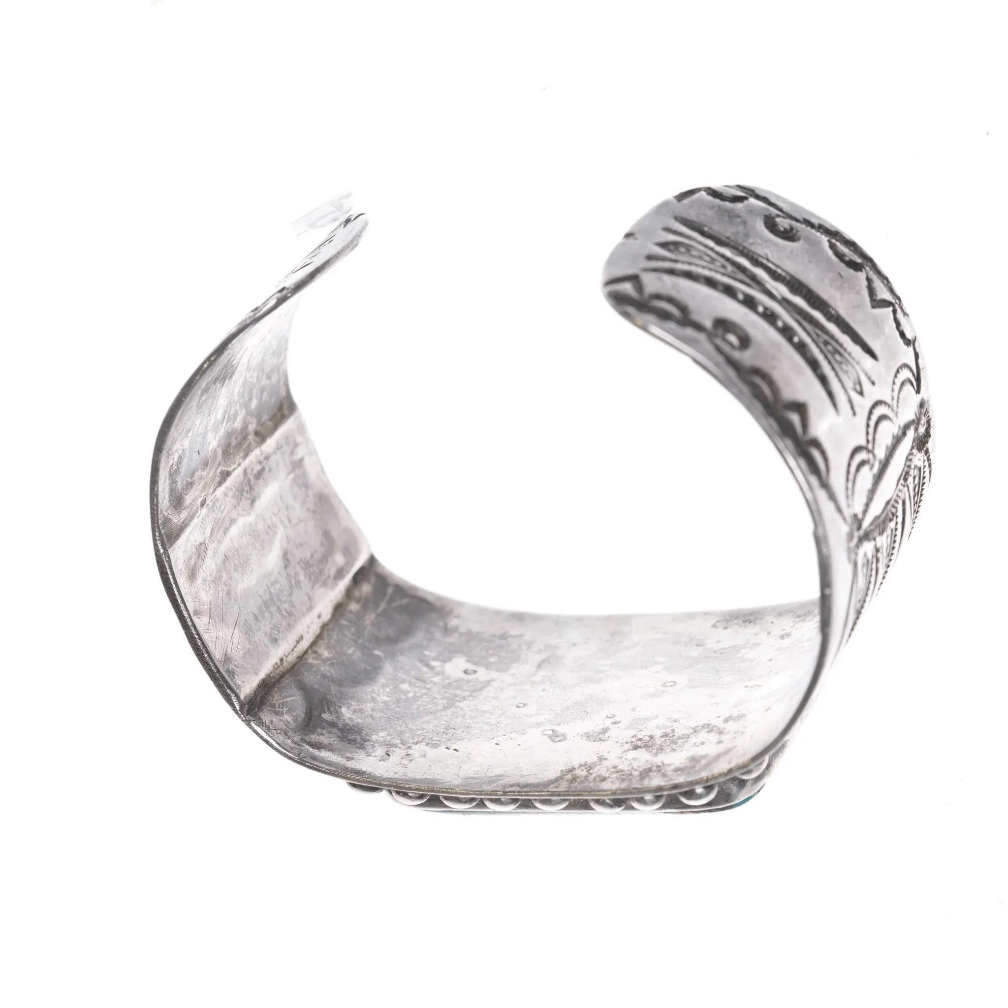 6" 30's-40's Native American silver cuff bracelet with large turquoise. Nice sized very well made bracelet. Both sides have been later braced from the interior with an added bar of silver, one side with a very good repair shown in the third pic. Very special bracelet.