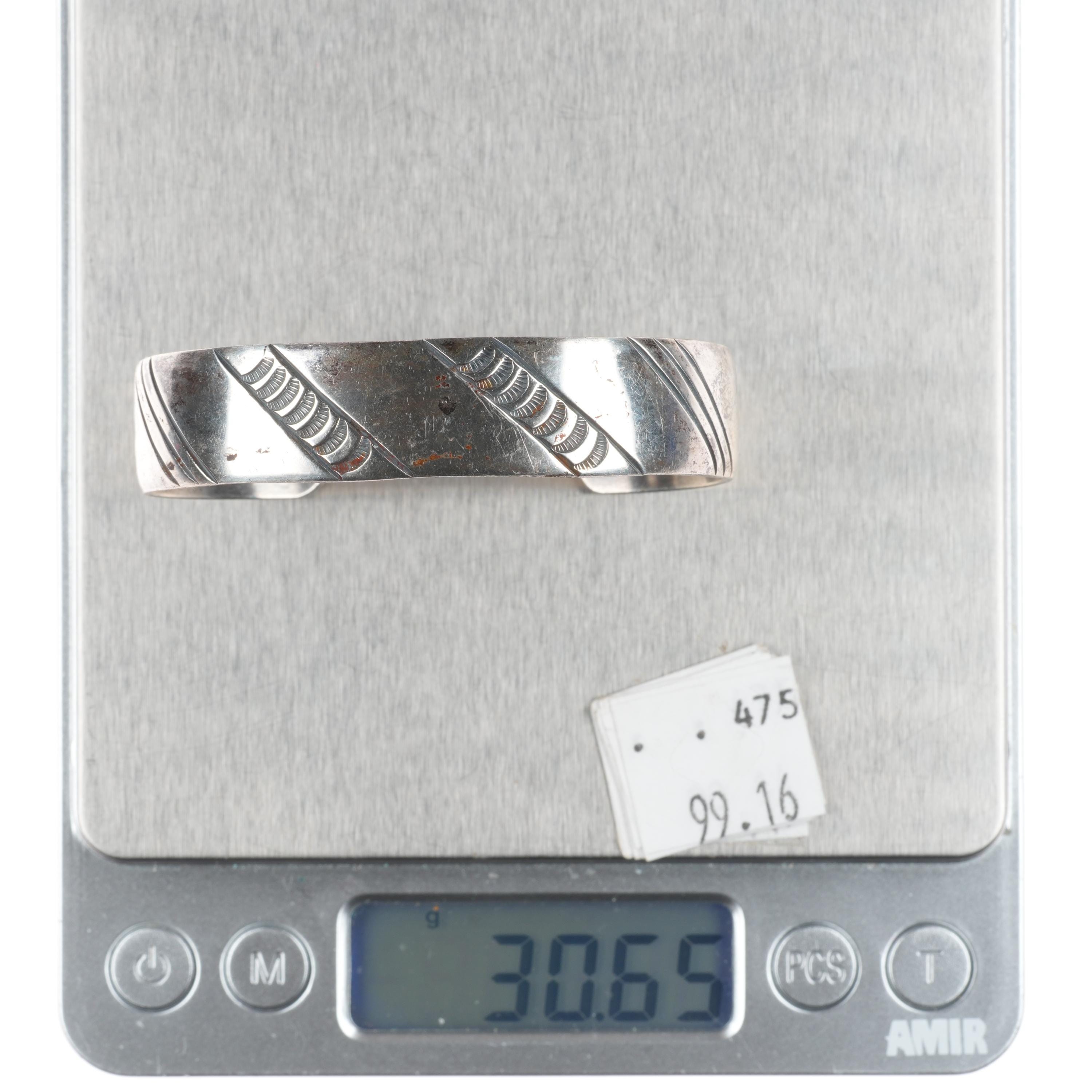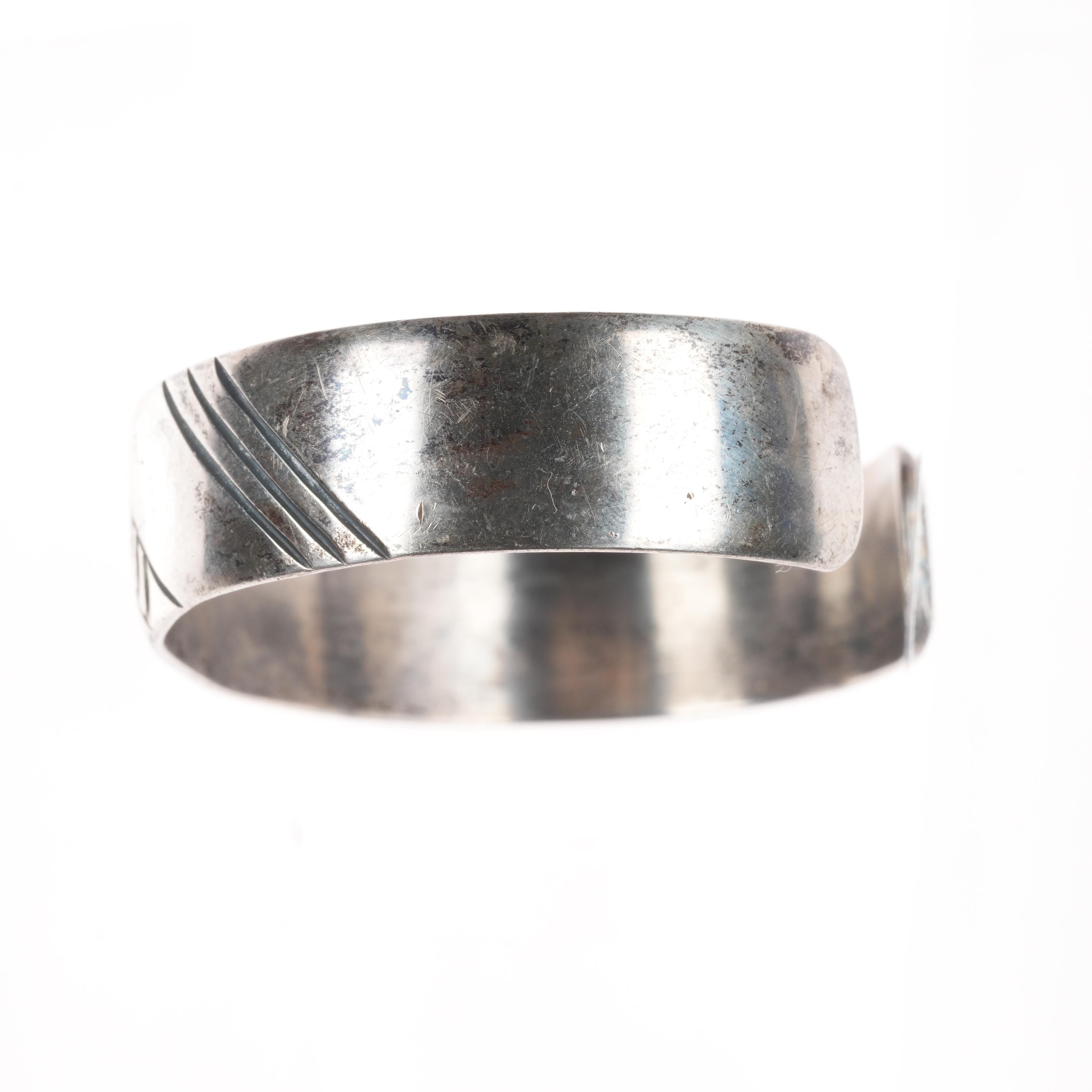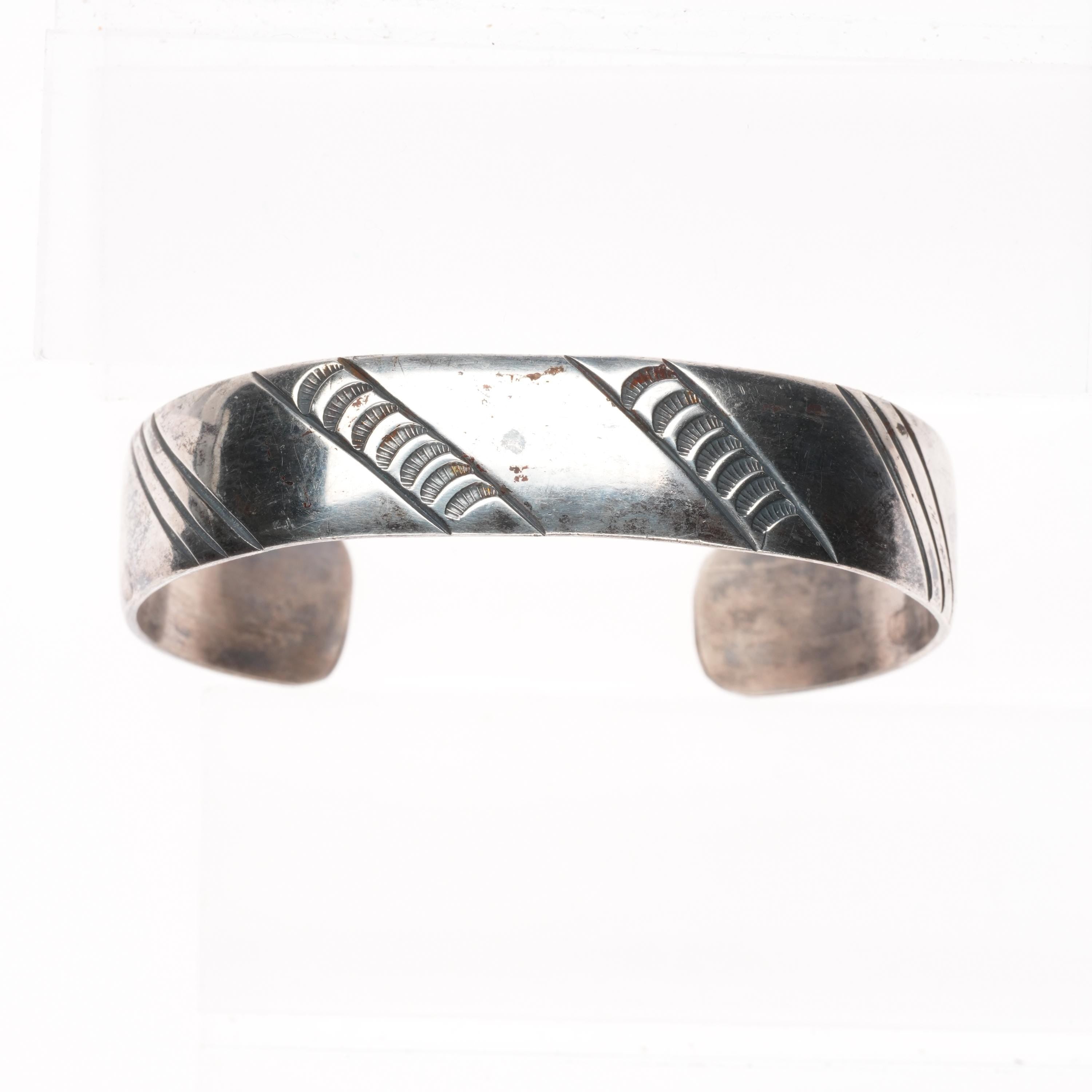 6.35" Vintage Navajo hand stamped sterling silver stacker band cuff bracelet. Tested and guaranteed solid sterling silver with weight and measurements in pictures. Circa third quarter of the 20st century. Unmarked.