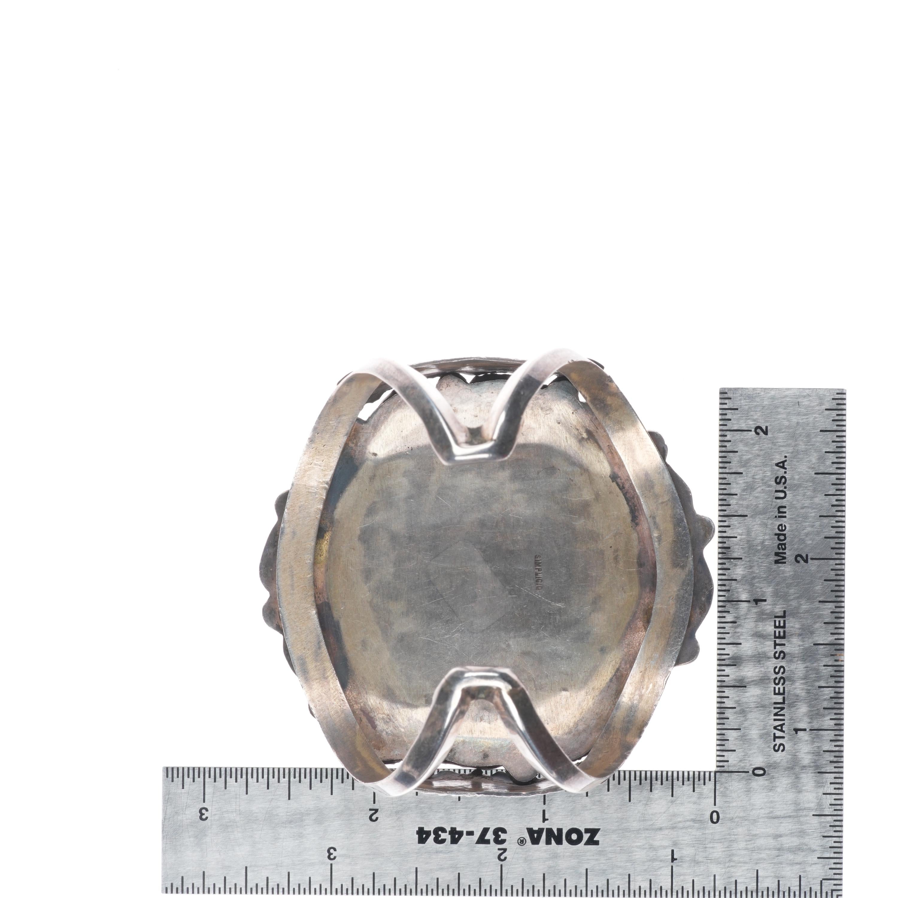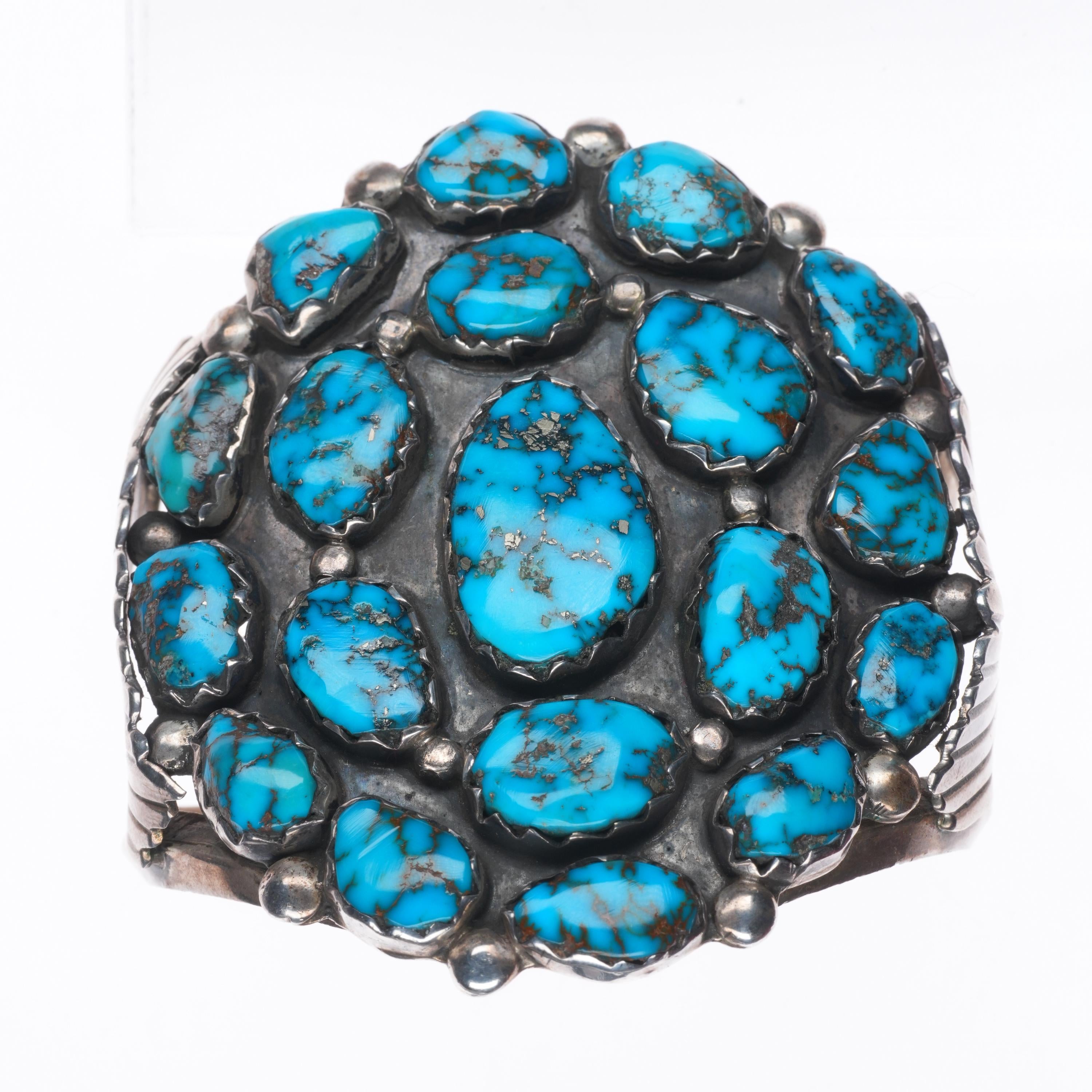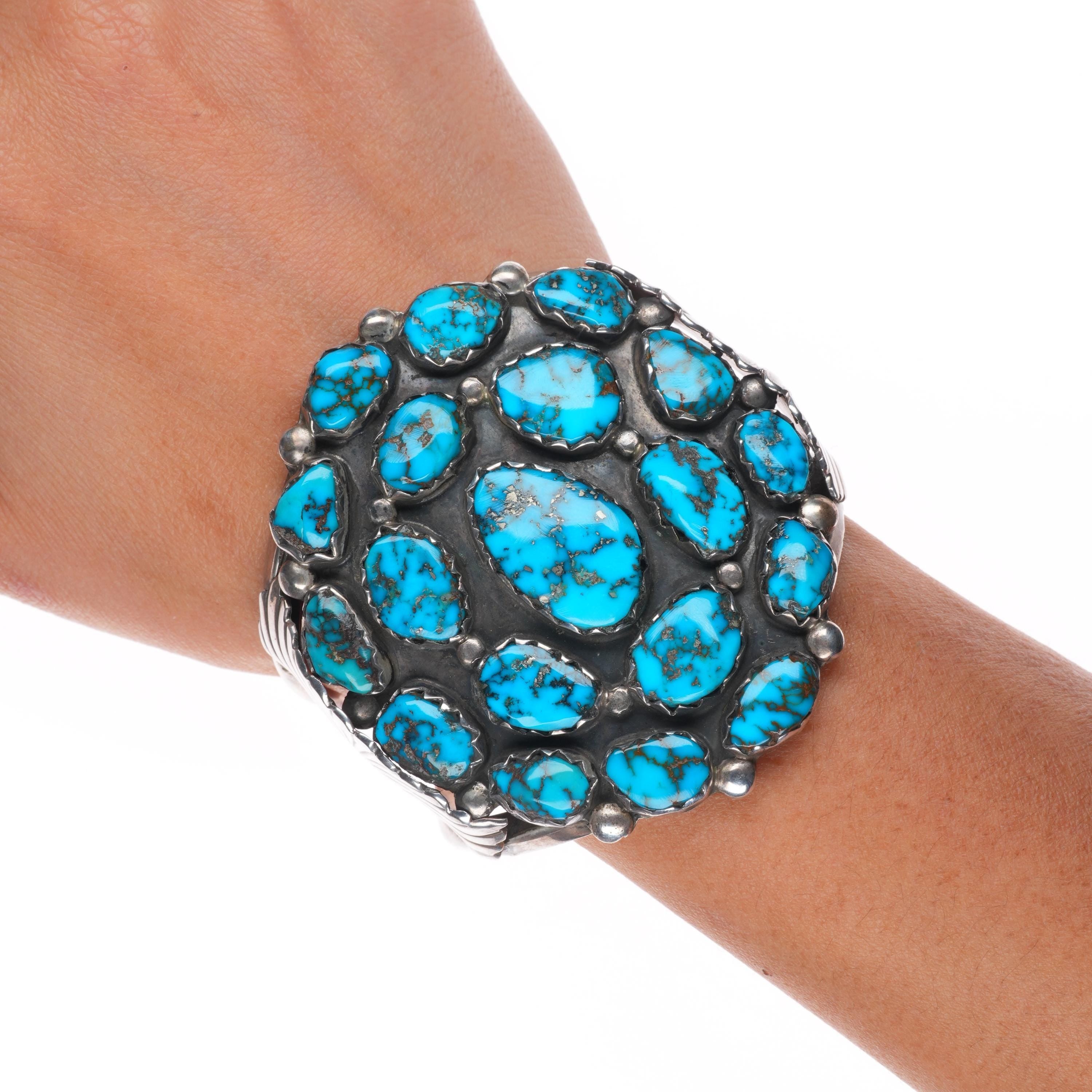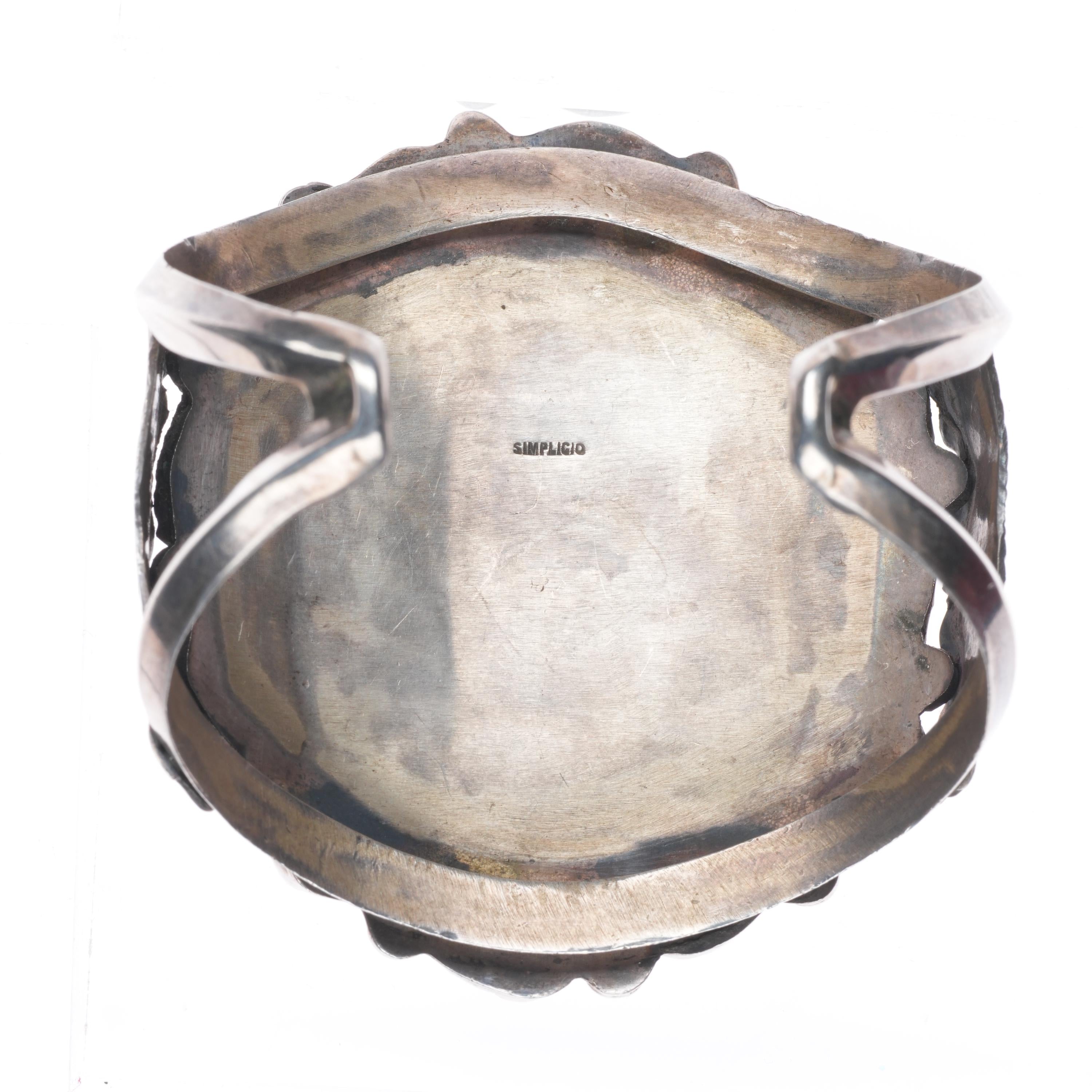 6.4" Mike Simplicio Zuni Morenci spiderweb turquoise sterling silver cuff bracelet. Tested and guaranteed solid sterling silver with weight and measurements in pictures. Circa third quarter of the 20th century. Fits up to a 6.5" wrist without adjustment, though .25" or more of careful adjustment is typically very simple. Any adjustment will change the gap size of course which is shown in the pictures. Very gorgeous high grade turquoise, could be from multiple mines.