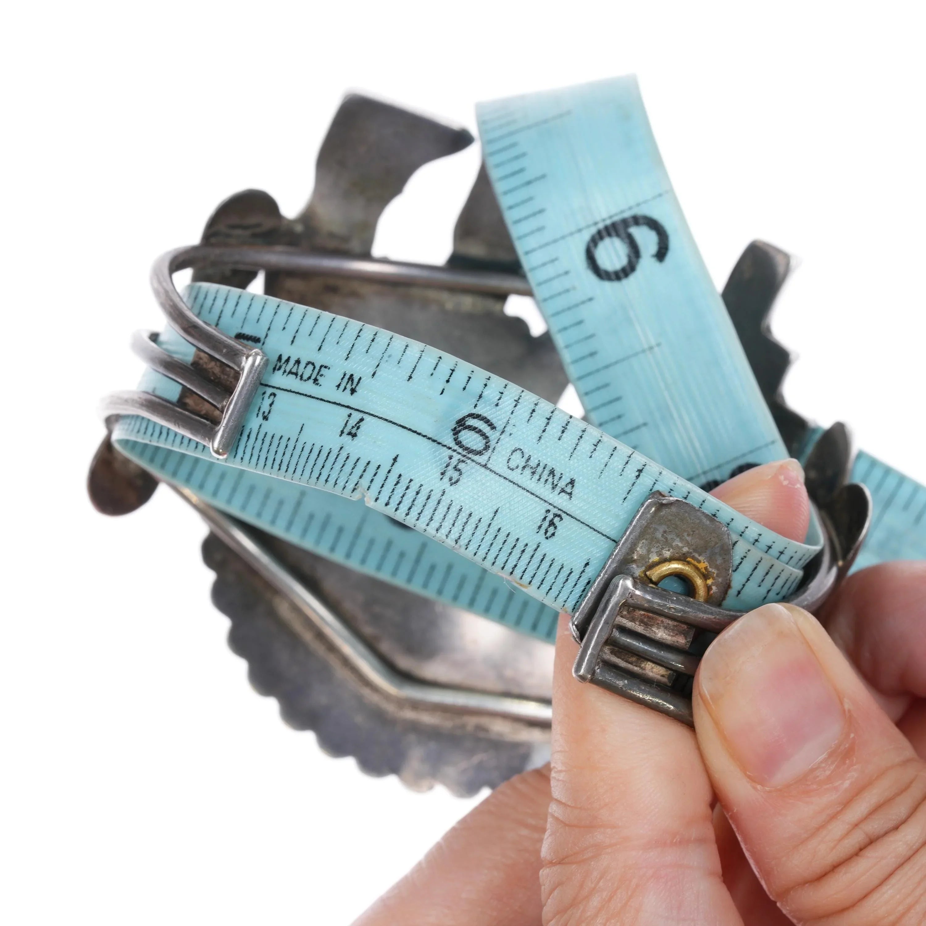 6.5" 50‘s-60‘s Zuni Rainbow Man silver cuff bracelet coral, turquoise, shell. Solid sterling silver. Will fit up to a 6.5" wrist, gap size and other measurements in pictures. Nice, well made bracelet in good condition with no apparent issues. Unmarked as typical of this era.