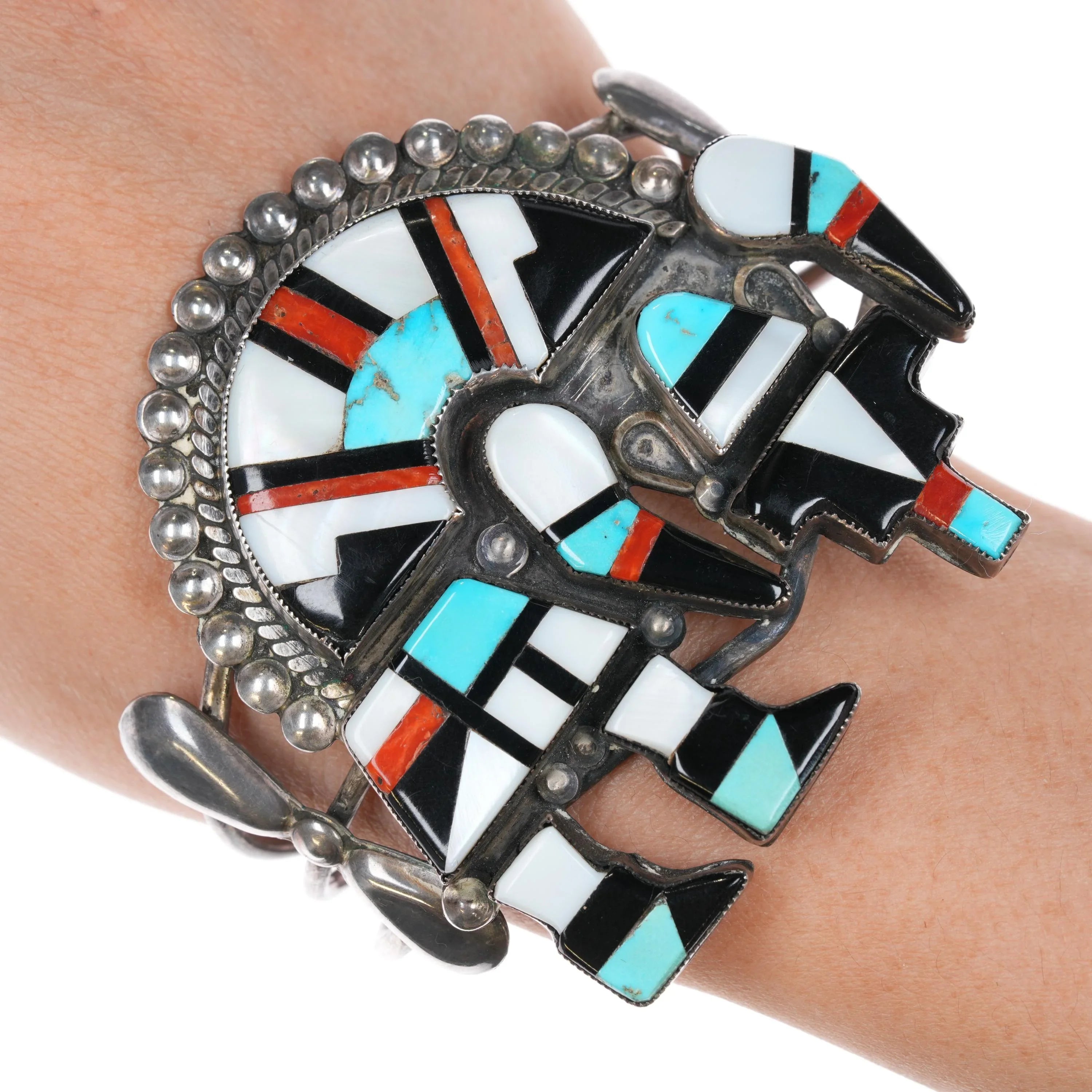 6.5" 50's-60's Zuni Rainbow Man silver cuff bracelet coral, turquoise, shell