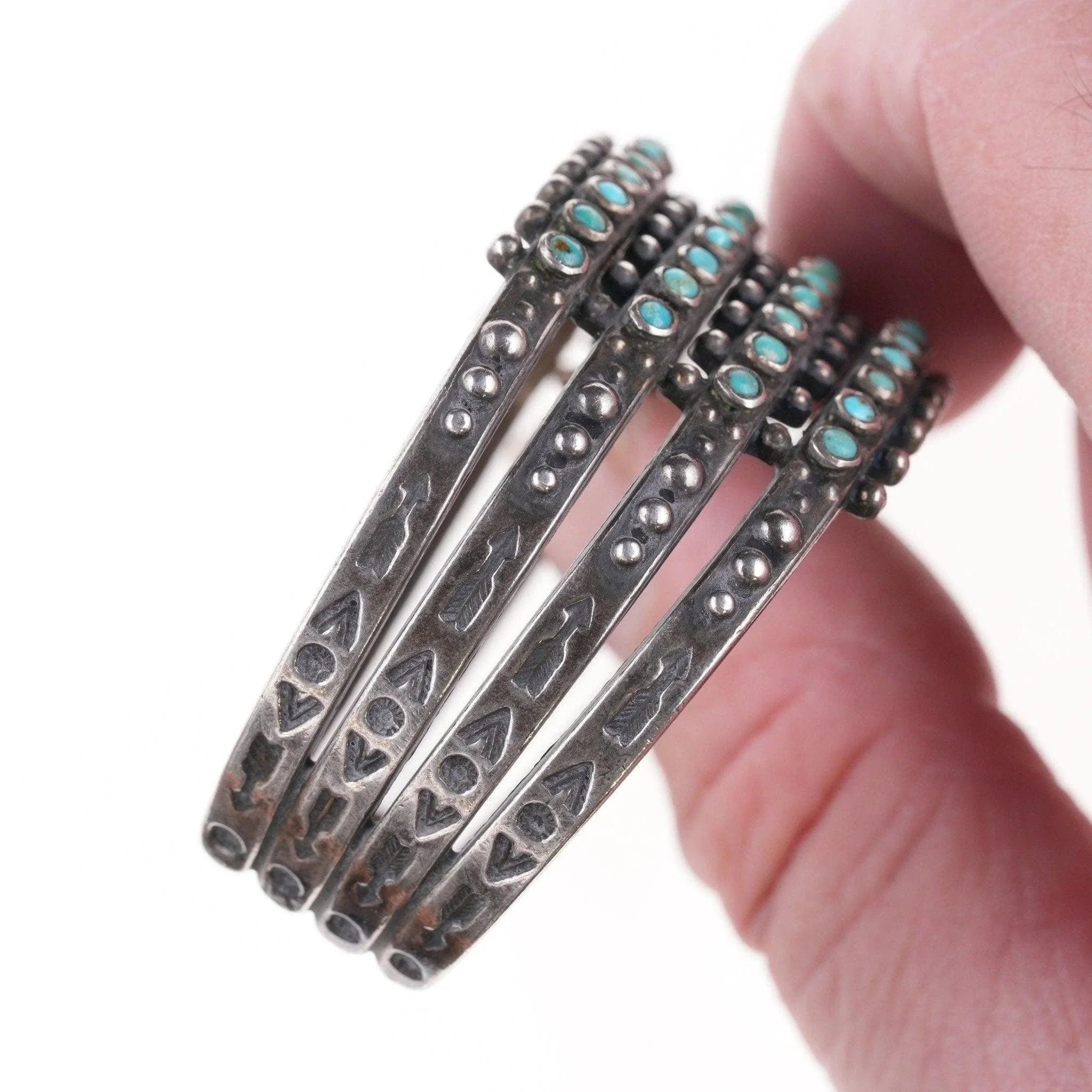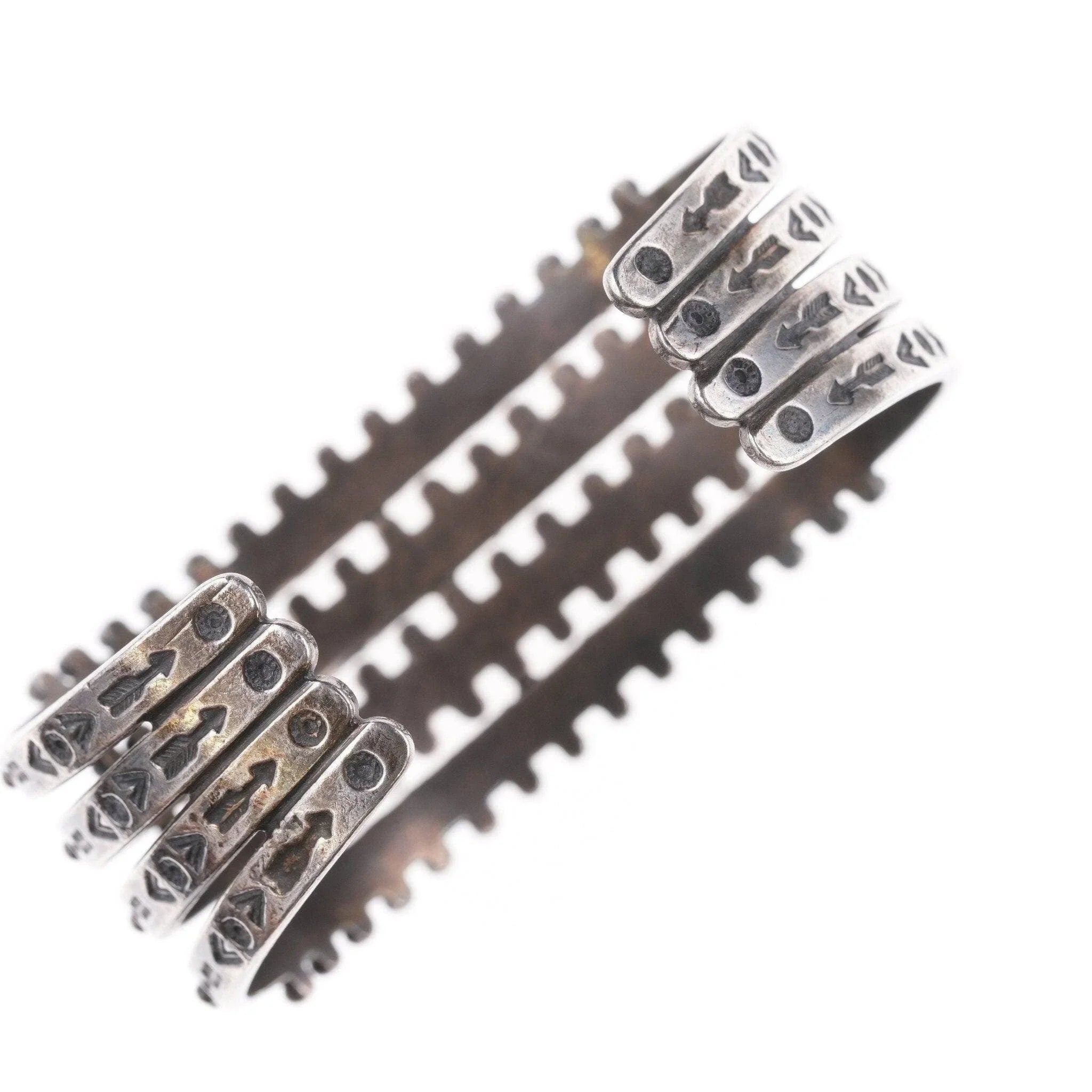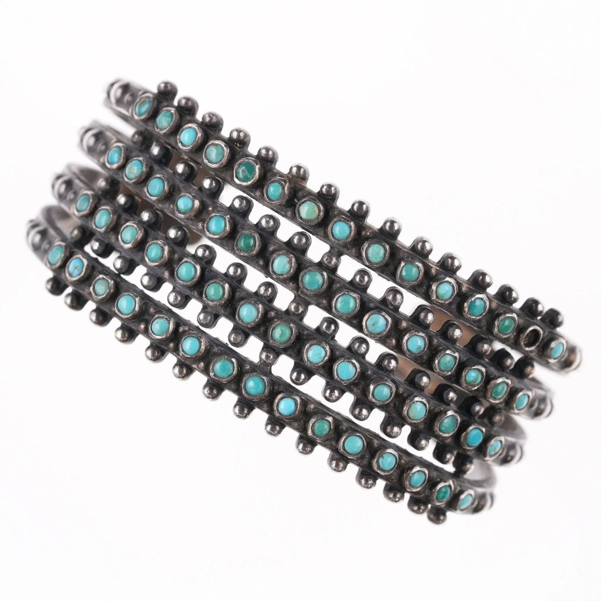 6 5/8" 1930's Navajo Stamped silver Snake eye turquoise 4 row cuff bracelet.<br>5.5" plus 1 1/8" gap, 28mm wide, 48 grams, missing one stone which I don't see<br>as much of a distraction, easy fix but I'll try offering it for less first.<br><br>All precious metals are tested and guaranteed, any Native American jewelry<br>referred to as Silver or Sterling is guaranteed to be a minimum of 90% (coin)<br>silver and possibly higher content. Most cuff bracelets are shown photographed<br>on a 6" woman's wrist and will include a photo showing the inside circumference<br>where the metal tip meets the number on the tape measure.