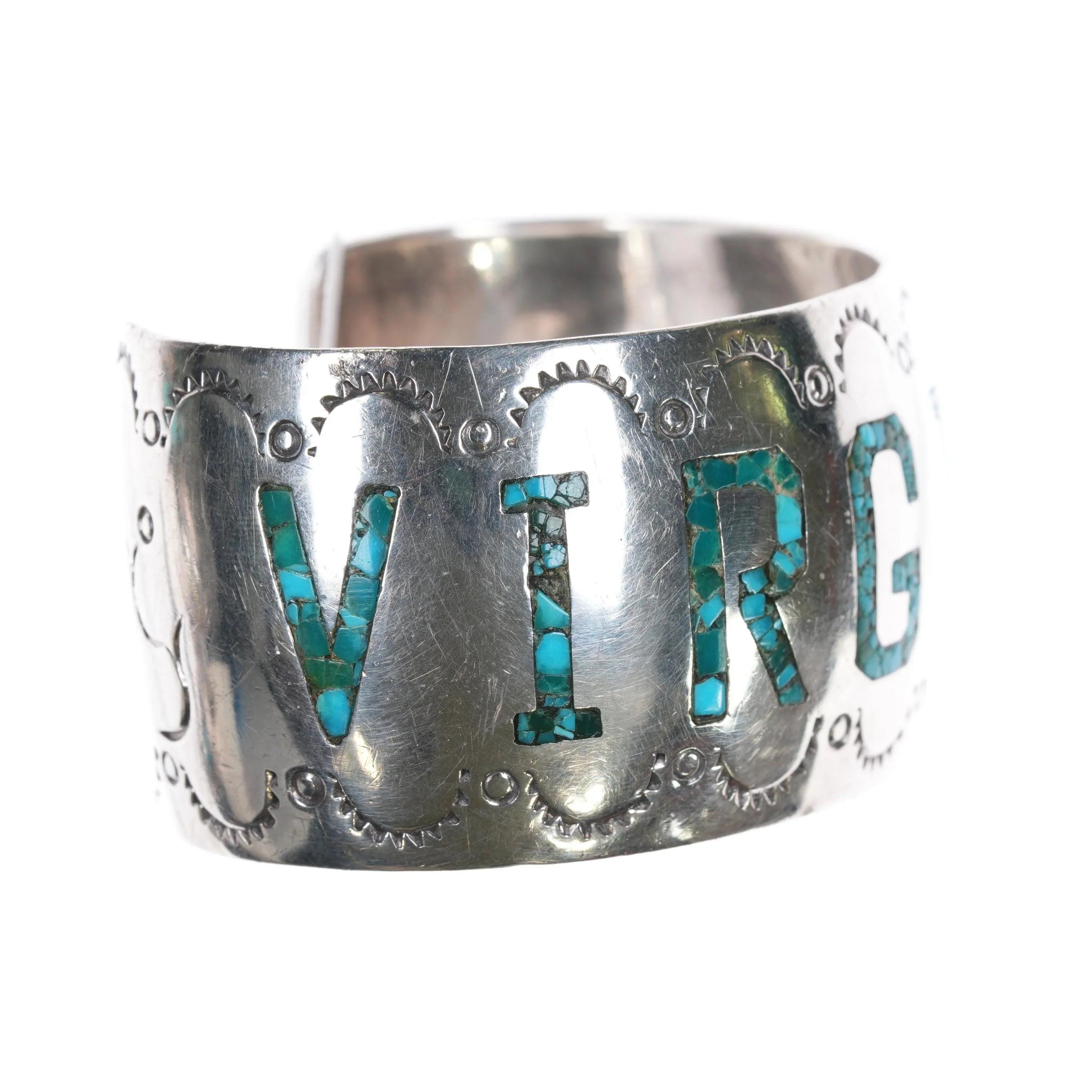 6 5/8" 1970‘s E.L. Navajo Sterling chip inlay Virginia cuff bracelet. Possible loss to one "chip" inside I, no other issues, solid sterling, weight and measurements in pictures. Marked as shown.