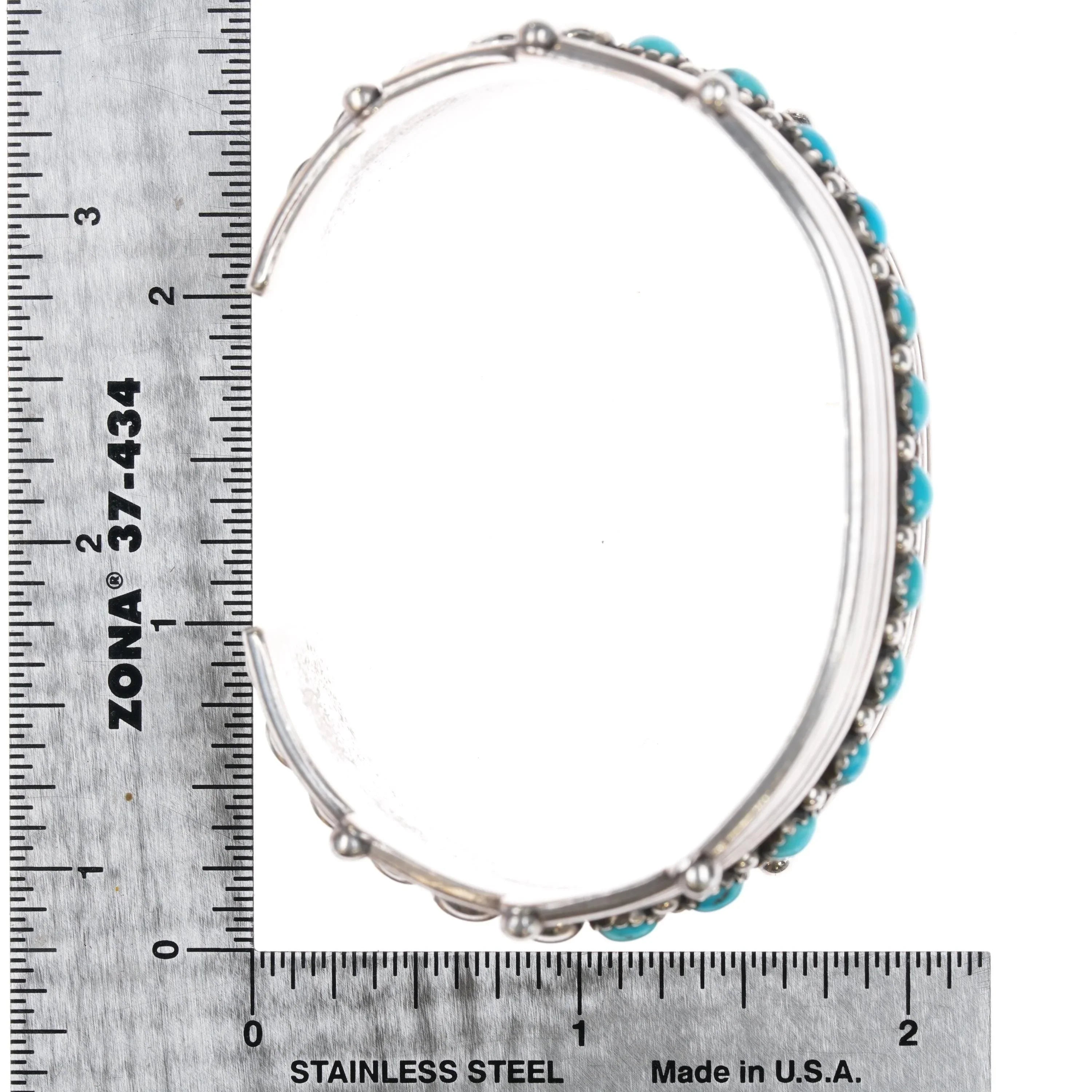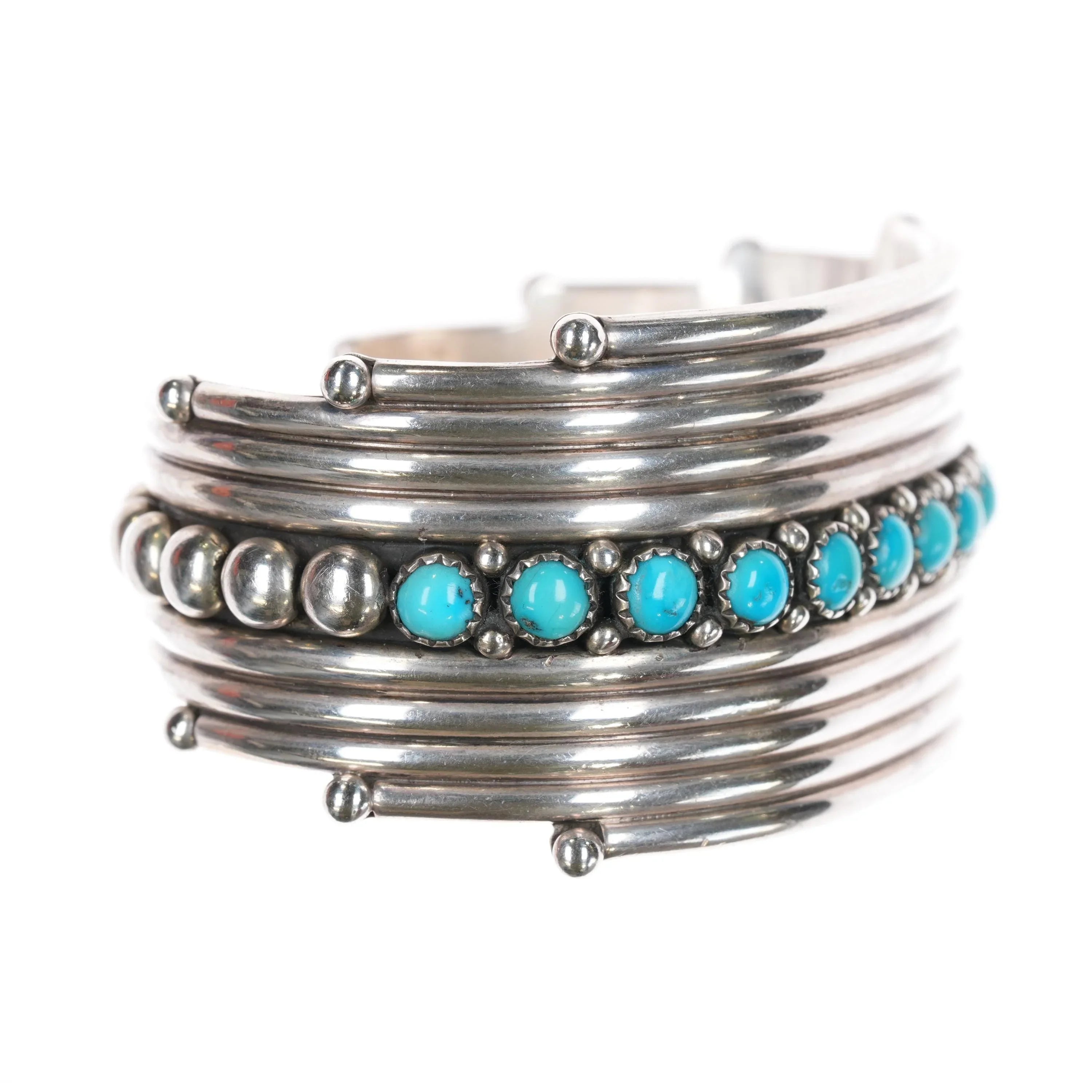6 5/8" Billy Betoney Navajo silver modernist Kingman turquoise row cuff bracelet. Solid sterling silver. Will fit up to a 6 5/8" wrist, gap size and other measurements in pictures. Nice, well made bracelet. Contemporary bracelet, hardly worn.