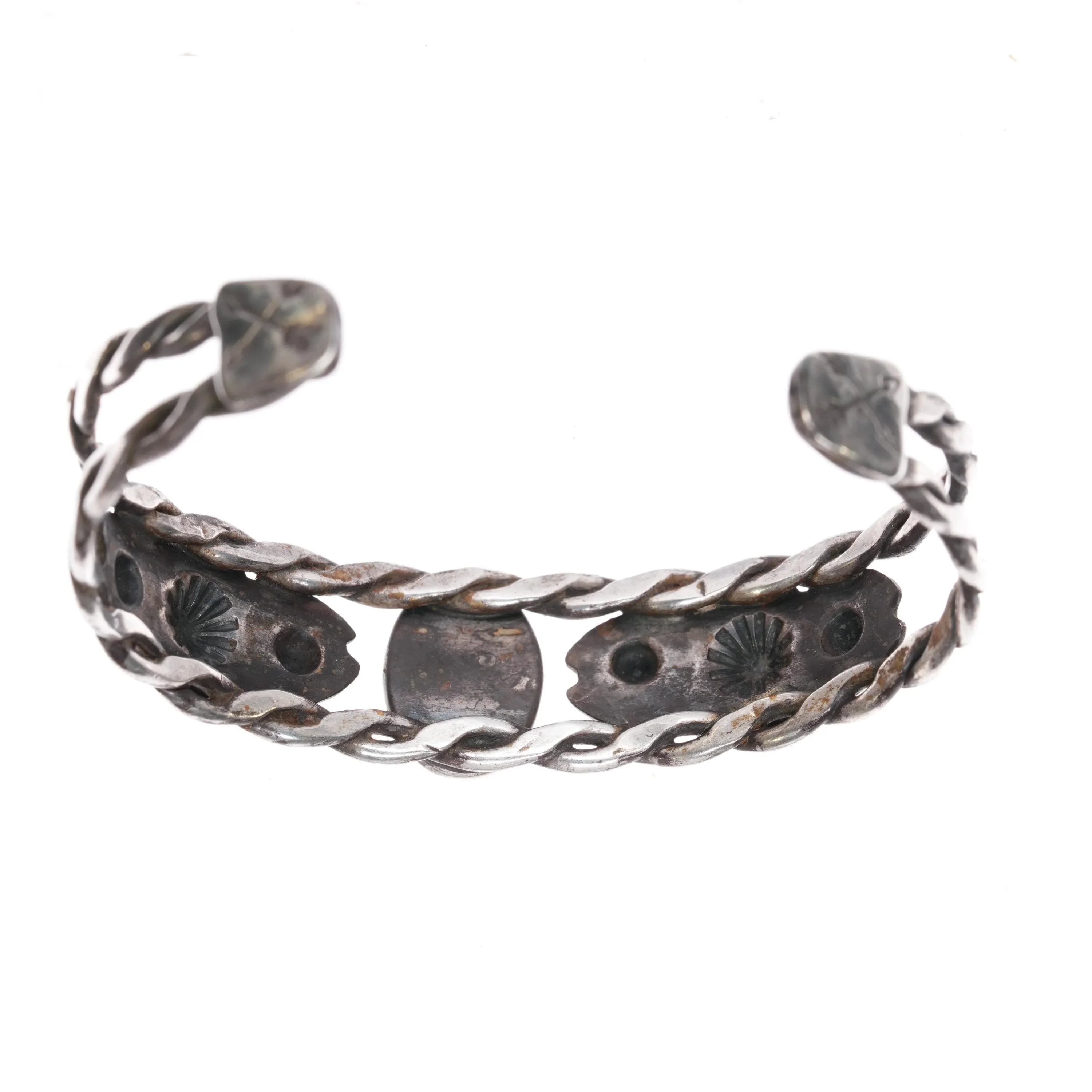 6 5/8" c1940‘s Fred Harvey era twisted sterling wire turquoise cuff bracelet. No issues, unmarked solid sterling silver. Weight and measurements in pics..