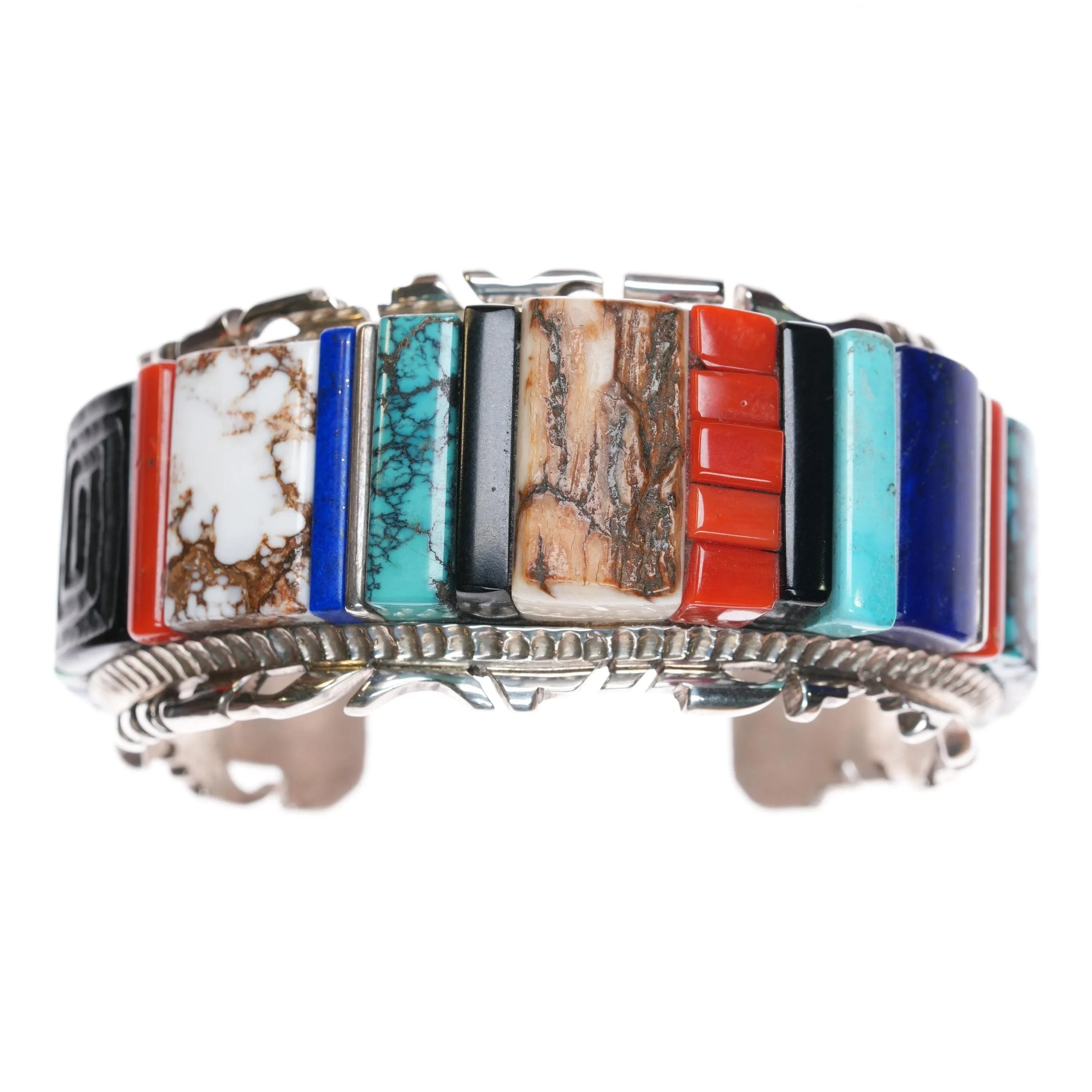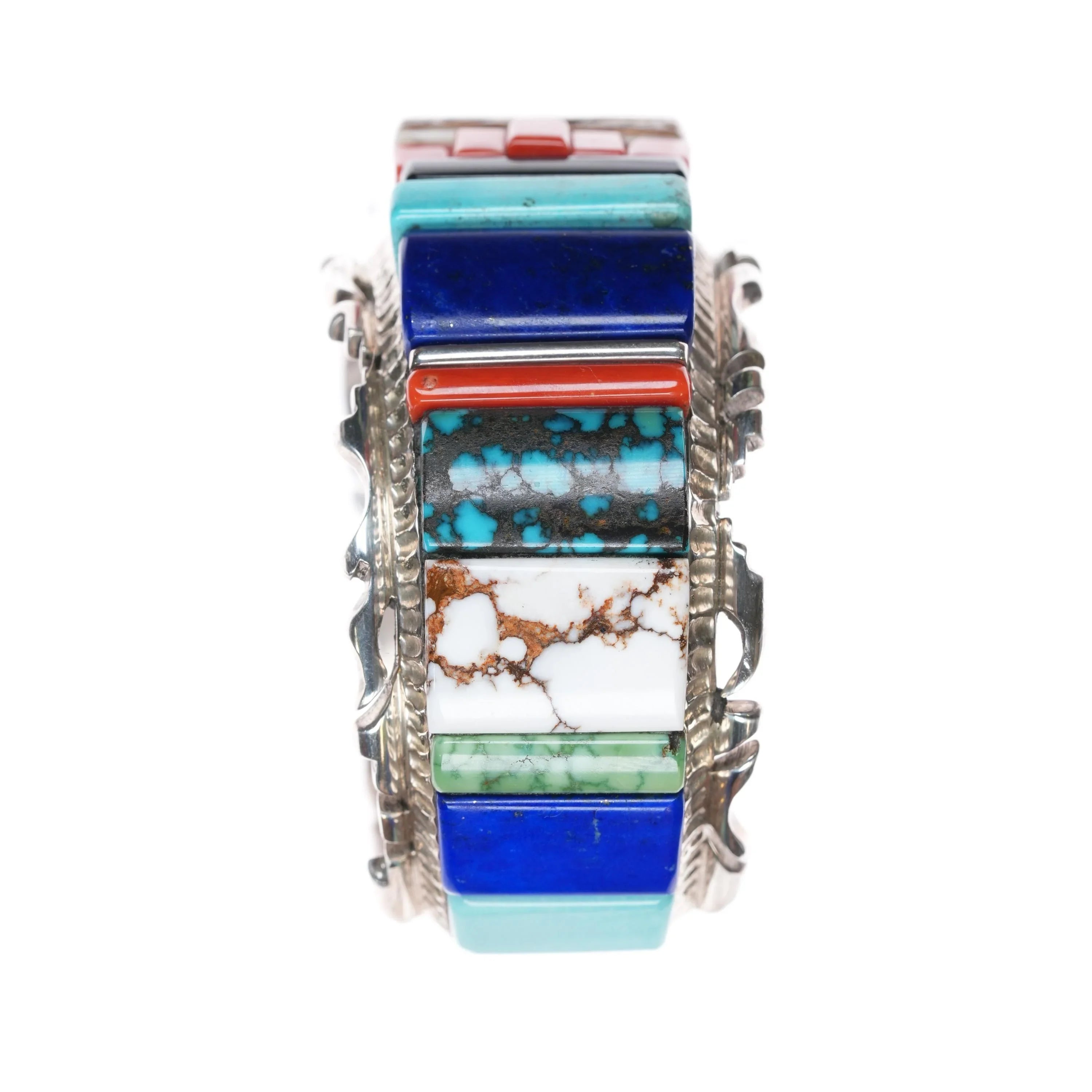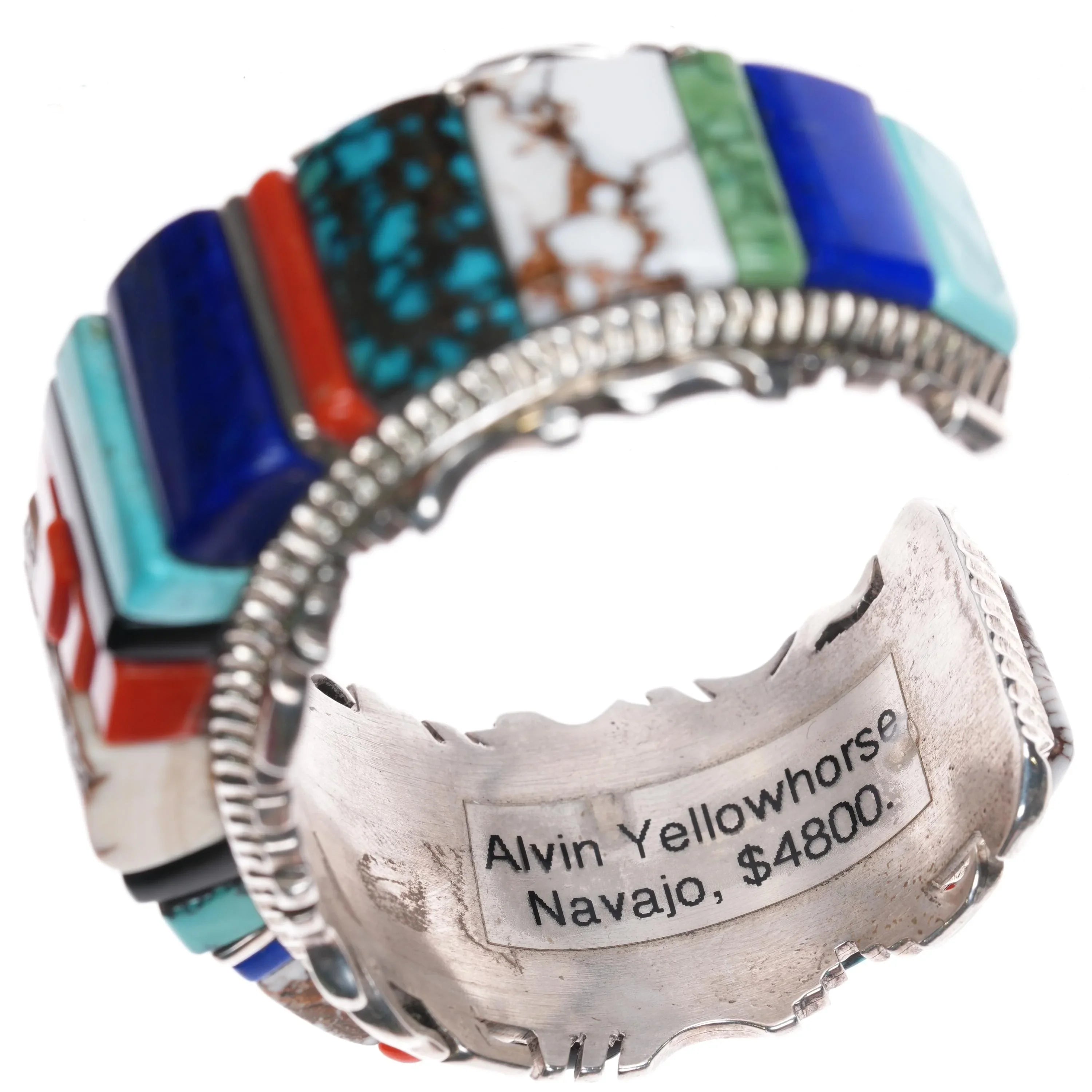6.5" Alvin Yellowhorse Navajo Multi-mine turquoise sterling silver cuff bracelet. All high grade materials including high grade Carico Lake turquoise, Mediterranean coral, antler, and other stones. Weight and measurements in pictures, Tested and guaranteed solid sterling silver. Vintage, new old stock, unworn.
