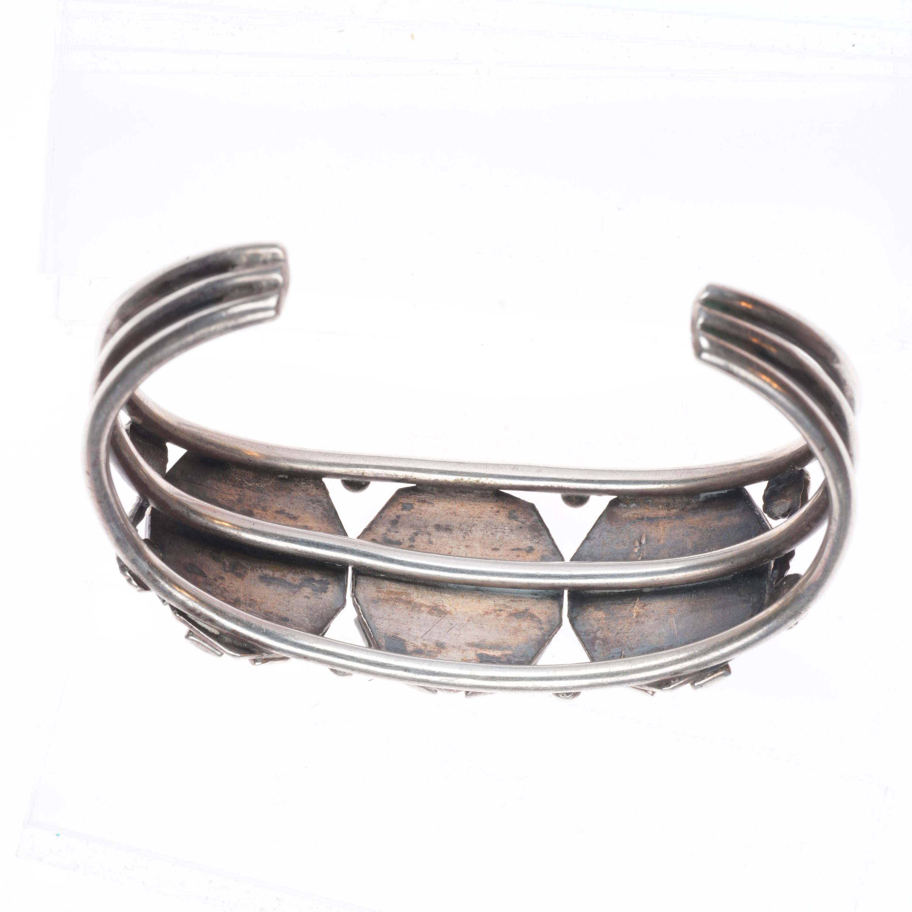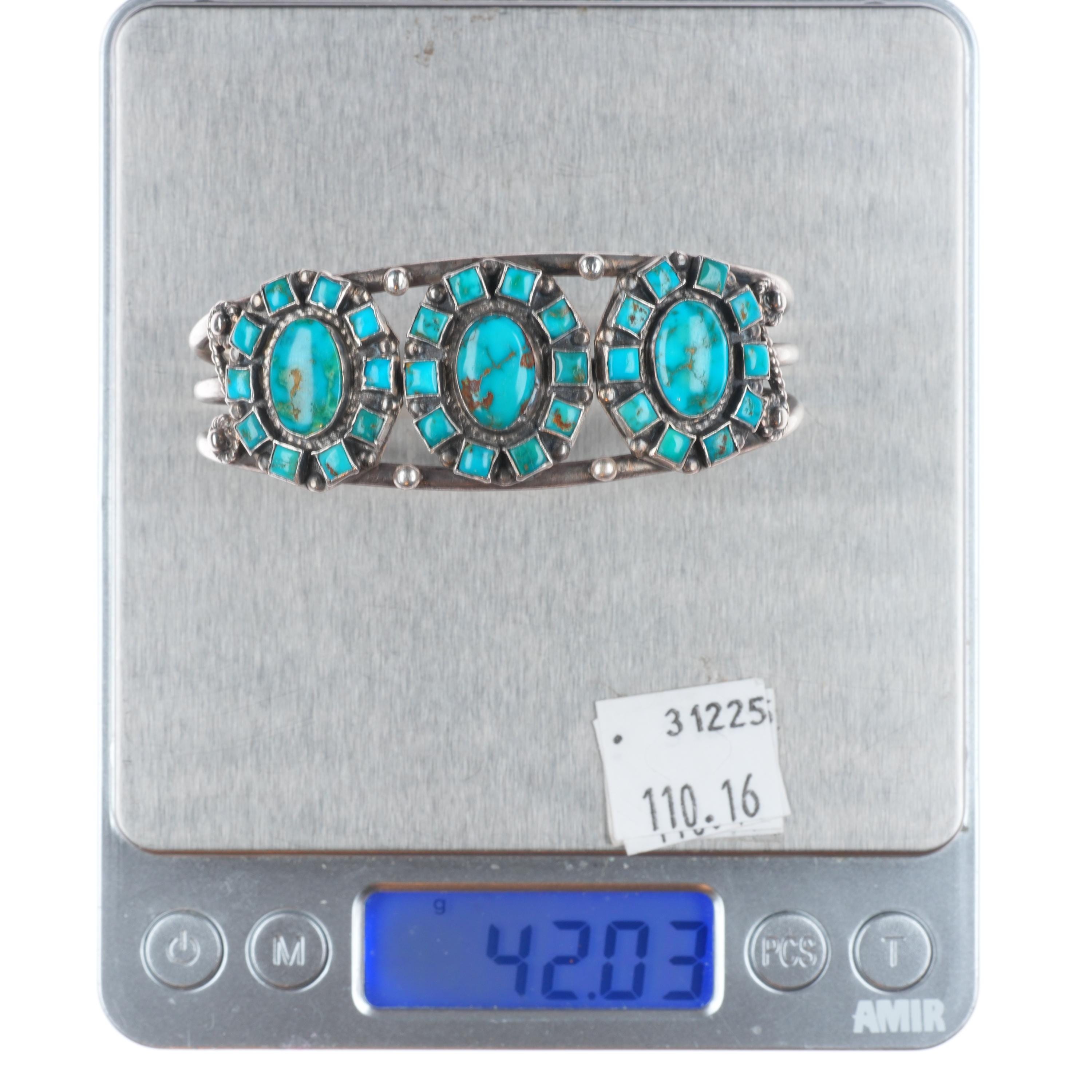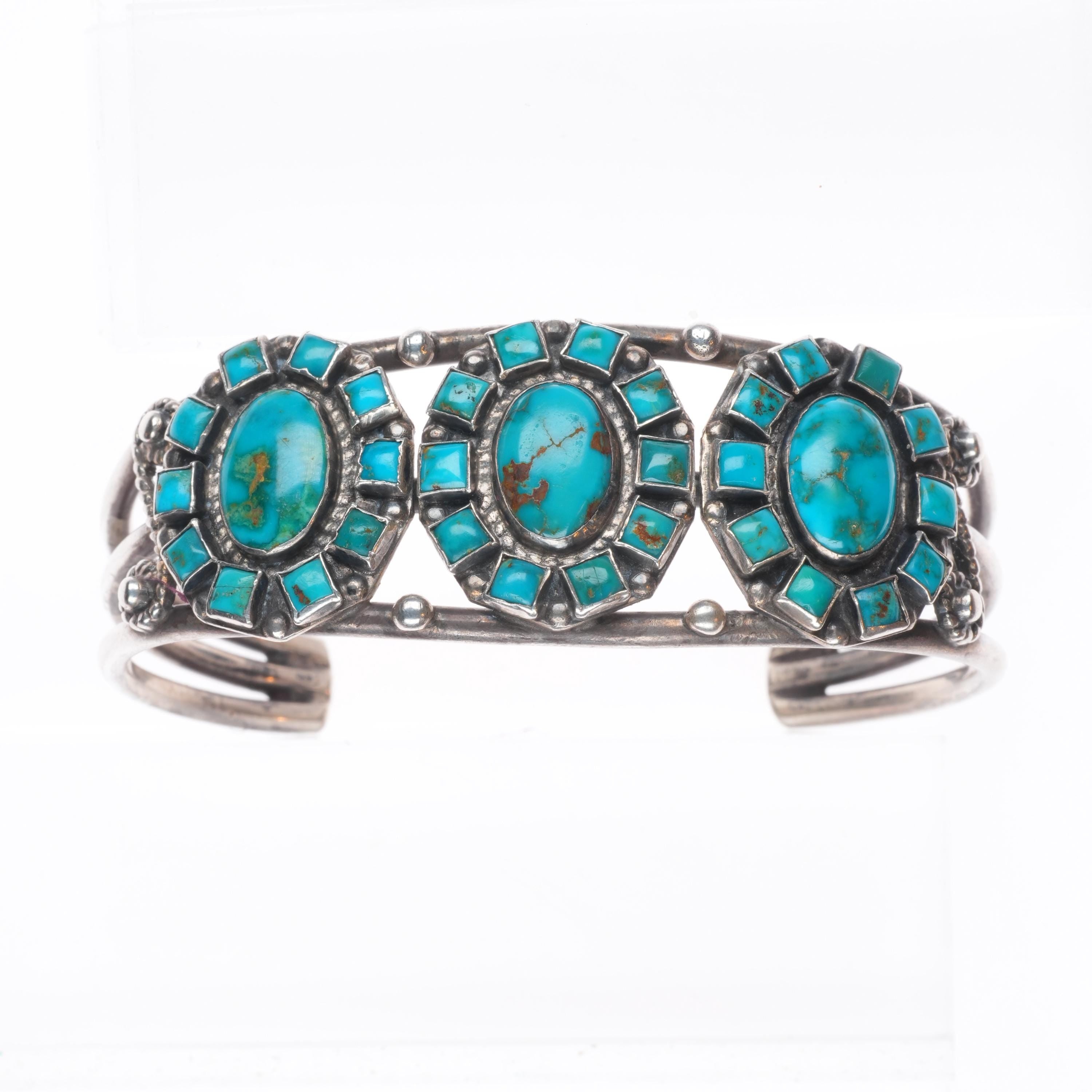 30‘s-40‘s Zuni Blue Gem Turquoise sterling silver square cluster cuff bracelet. Tested and guaranteed solid sterling silver with weight and measurements in pictures. Circa second quarter of the 20th century with age appropriate wear..